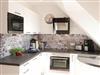 Die moderne Küche ist ausgestattet mit einem Herd, einem Kühlschrank mit Gefrierfunktion, einem Backofen, einer Mikrowelle, einer Geschirrspülmaschine, einer Kaffeemaschine, sowie einem Toaster.