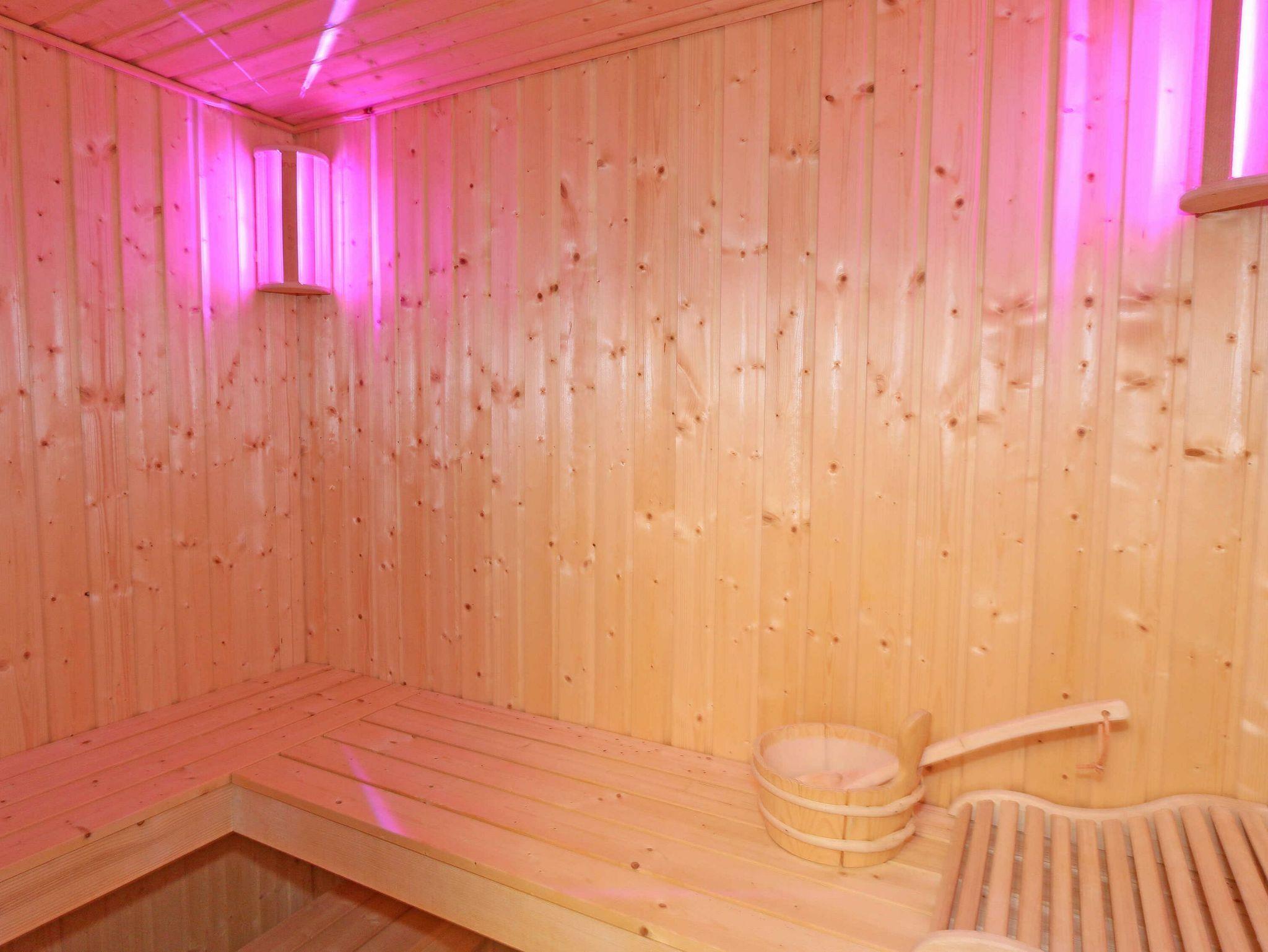 • großes Wellness-Bad mit Sauna, Whirlpool, bodengleicher Dusche, WC, Waschtisch, Handtuchhalter, Waschmaschine und Fön