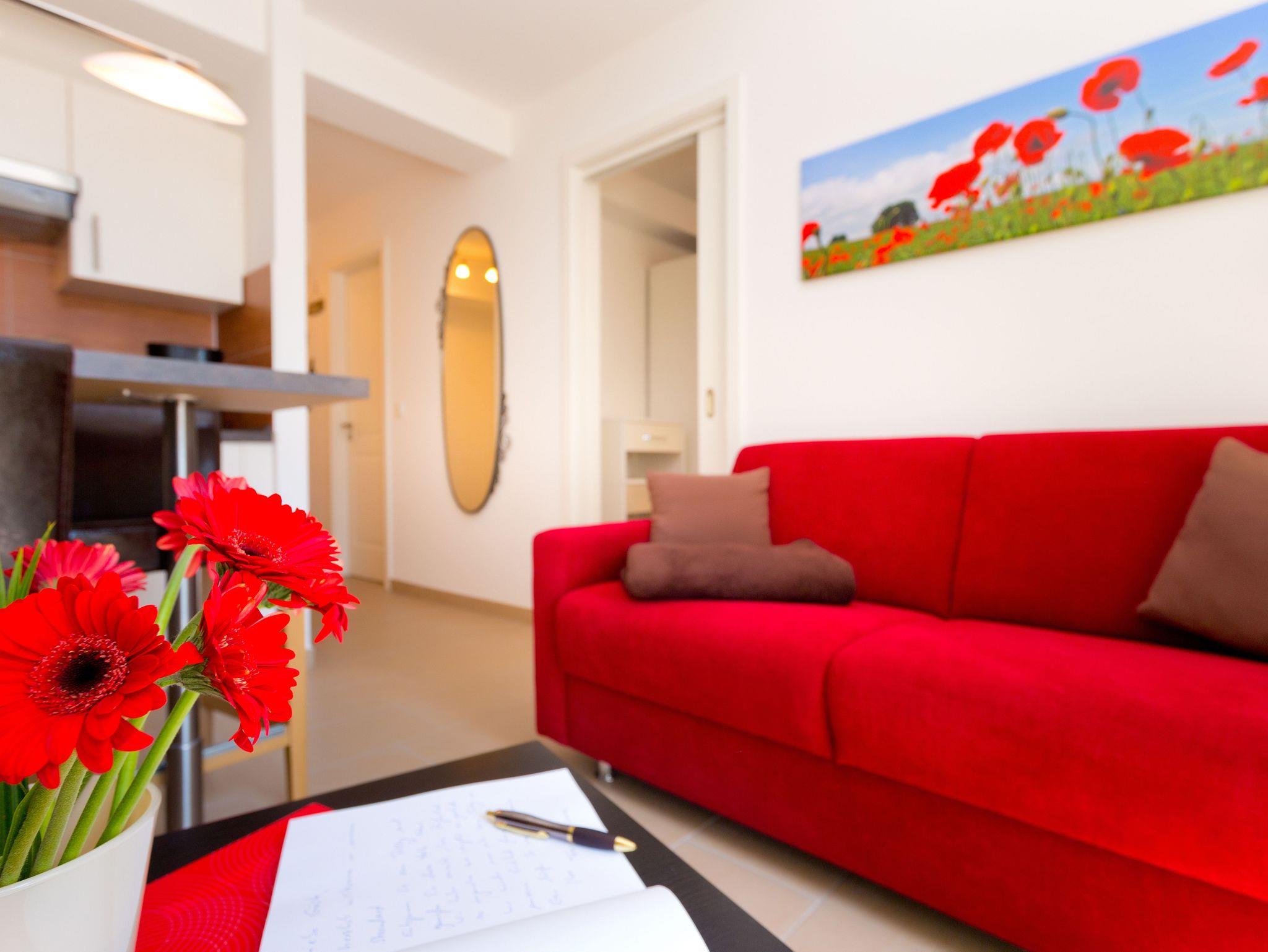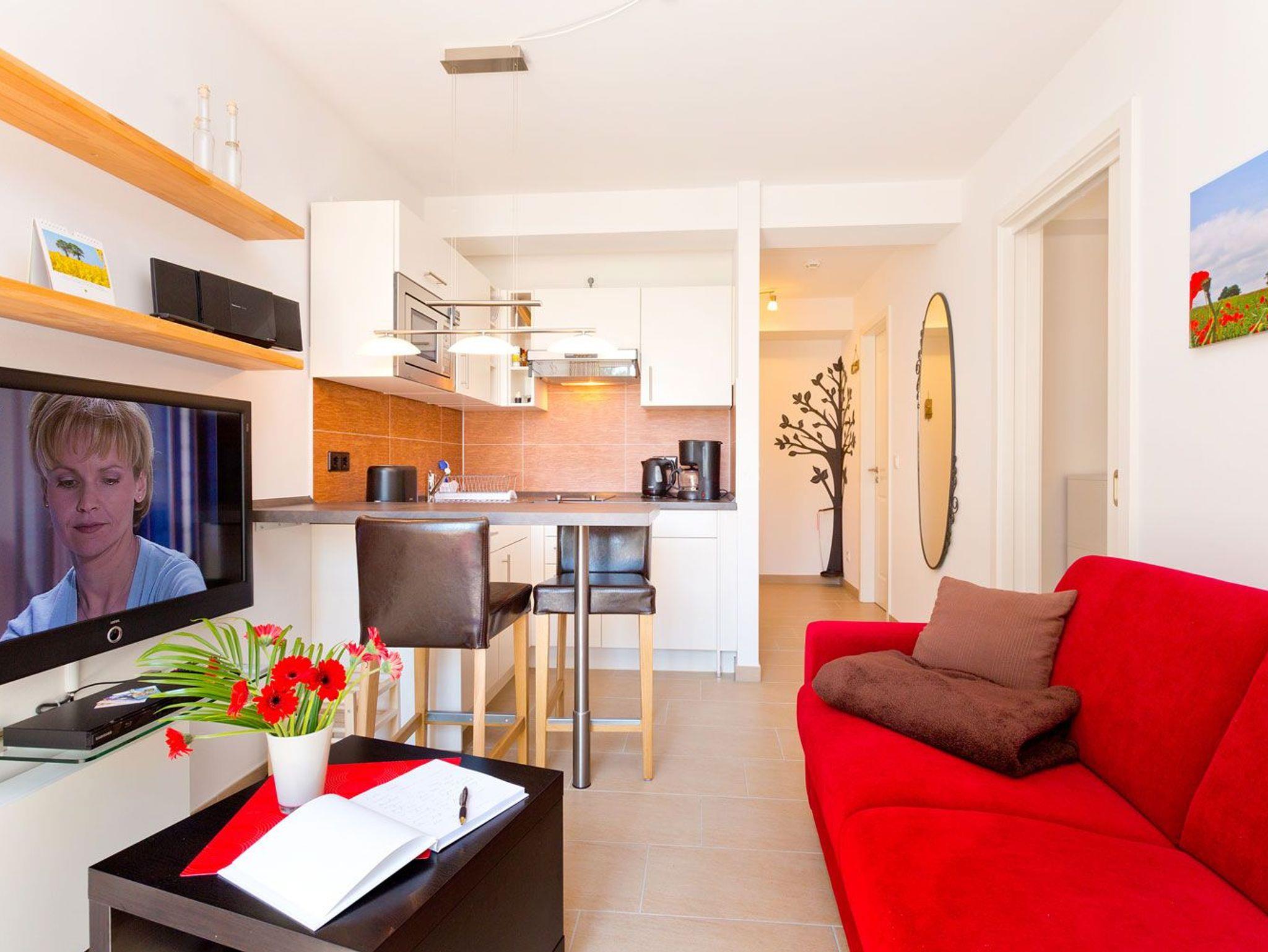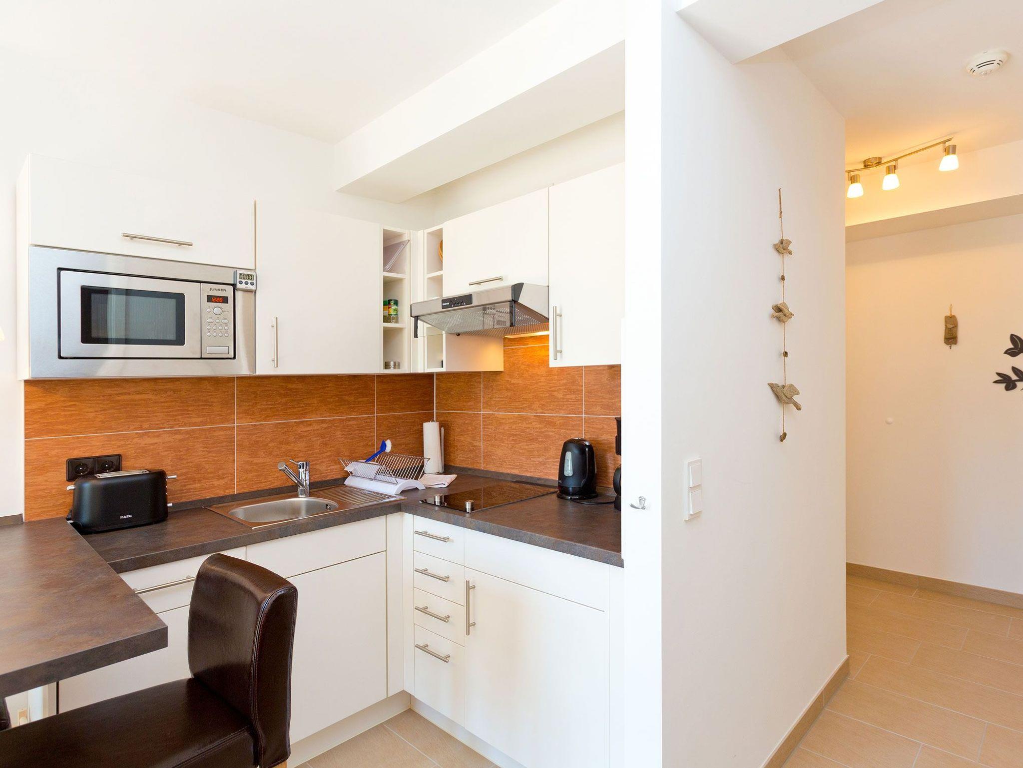 Feine kleine 34 qm große Wohnung mit eigener Terrasse und Tiefgaragenstellplatz im Haus Meeresblick. Sie hat einen schönen Wohn/Essraum mit einer gut ausgestatteten Küchenzeile. Geschirrspülmaschine ist selbstverständlich. Alle Annehmlichkeiten sind vorhanden. Das Schlafzimmer ist räumllich getrennt vom Wohnzimmer.