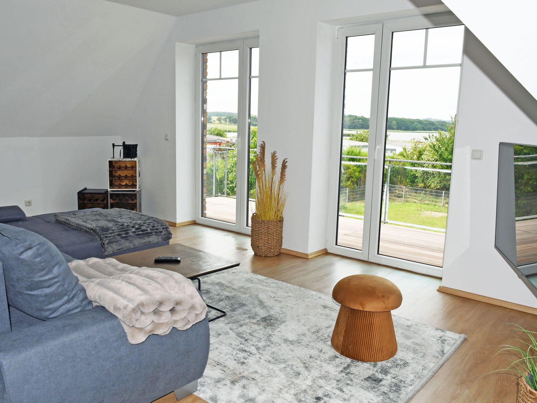 Diese Ferienwohnung wurde modern und komfortabel eingerichtet. Gäste dieser Ferienwohnung können auch ein kostenloses WLAN-Internet nutzen. Im sehr großen Wohnraum befinden sich eine bequeme Couch, Sessel und ein Tisch und ein modernes Flachbild-TV-Gerät. Hier steht auch ein großer Esstisch mit Stühlen. Zu dieser Ferienwohnung gehören 3 sehr große Balkone mit Gartenmöbeln und Sonnenliegen. Sie liegen nach Osten, Süden und Westen. Ais der Ferienwohnung haben Sie eine sehr schönen Panorama-Seeblick über den Selliner See, dessen Uferpromenade sie in 50 m schnell erreichen. Genießen Sie hier bei einem Glas Wein und nach einem schönen Urlaubstag tolle Sonnenuntergänge!