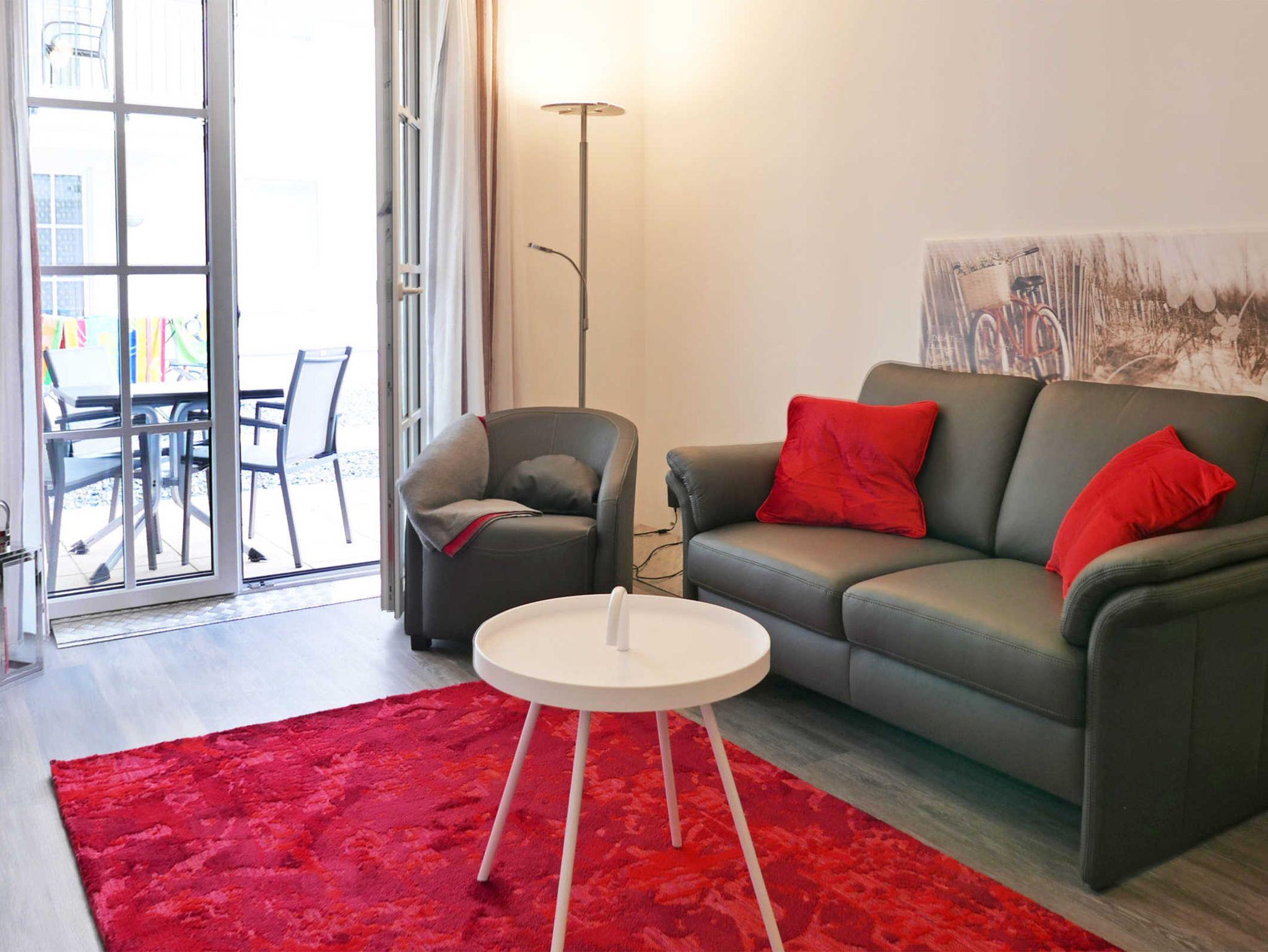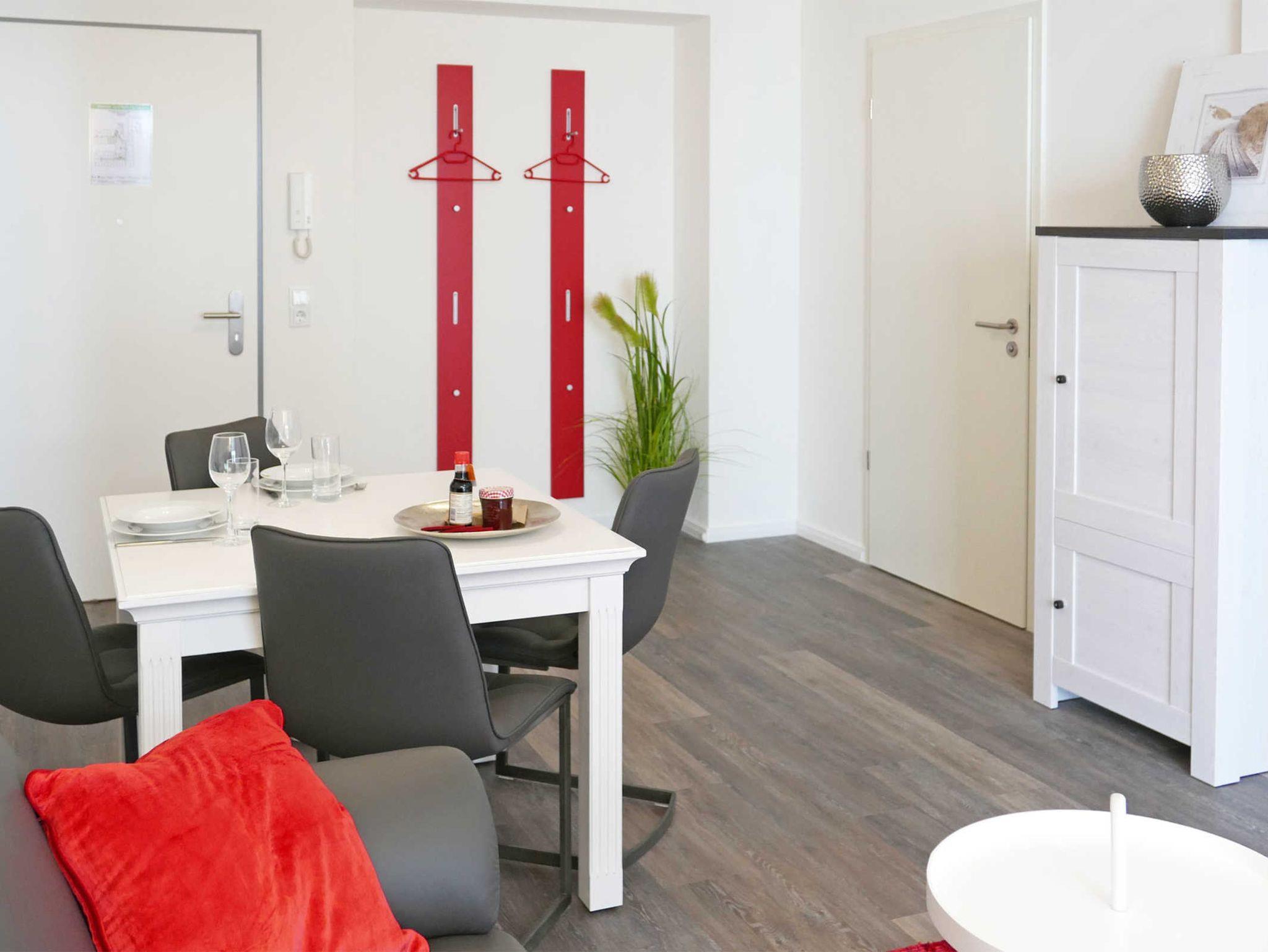 Gemütliche 3-Zimmer-Ferienwohnung für 3 Personen mit tollen roten Farbakzenten im Erdgeschoß des Hauses Meeresblick.