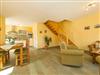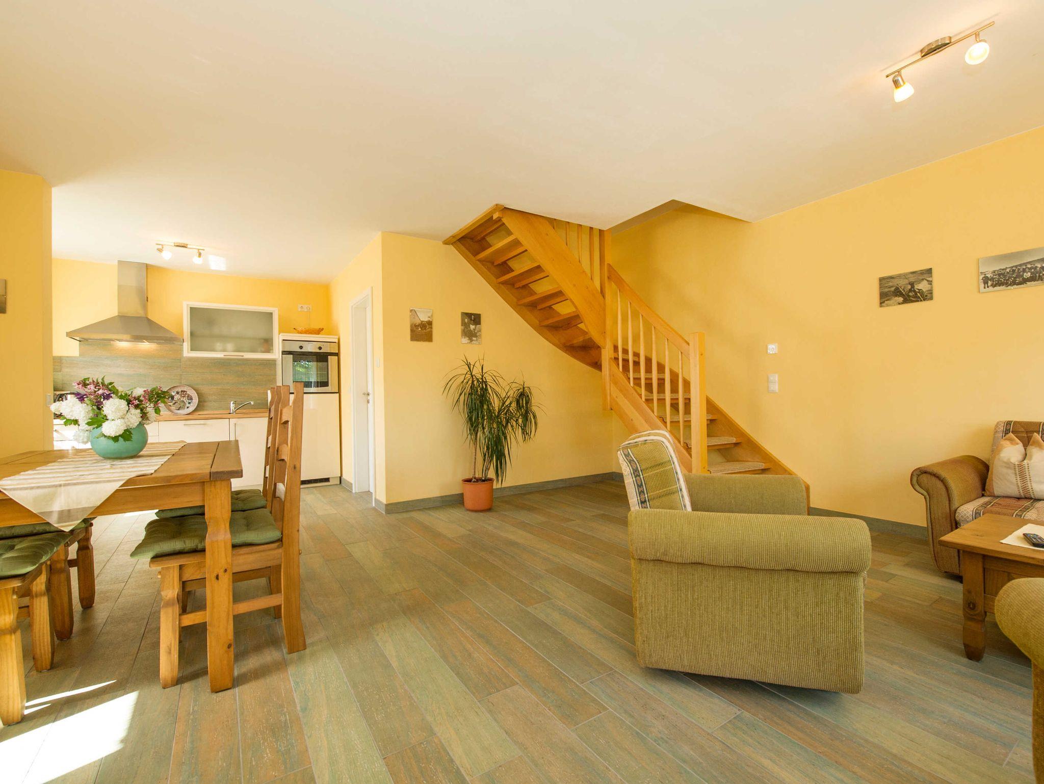 Im Erdgeschoss befindet sich ein großzügigen Wohnraum. Hier befindet sich eine Sitzcouch mit Tisch und Sessel und ein Flachbild-TV-Gerät sowie die Küchenzeile mit Esstisch und Stühlen. Die Küchenzeile ist mit einem Herd, Backofen, Geschirrspüler, Abzugshaube, Wasserkocher, Kaffeemaschine, Toaster, Spüle und Kühlschrank ausgestattet.