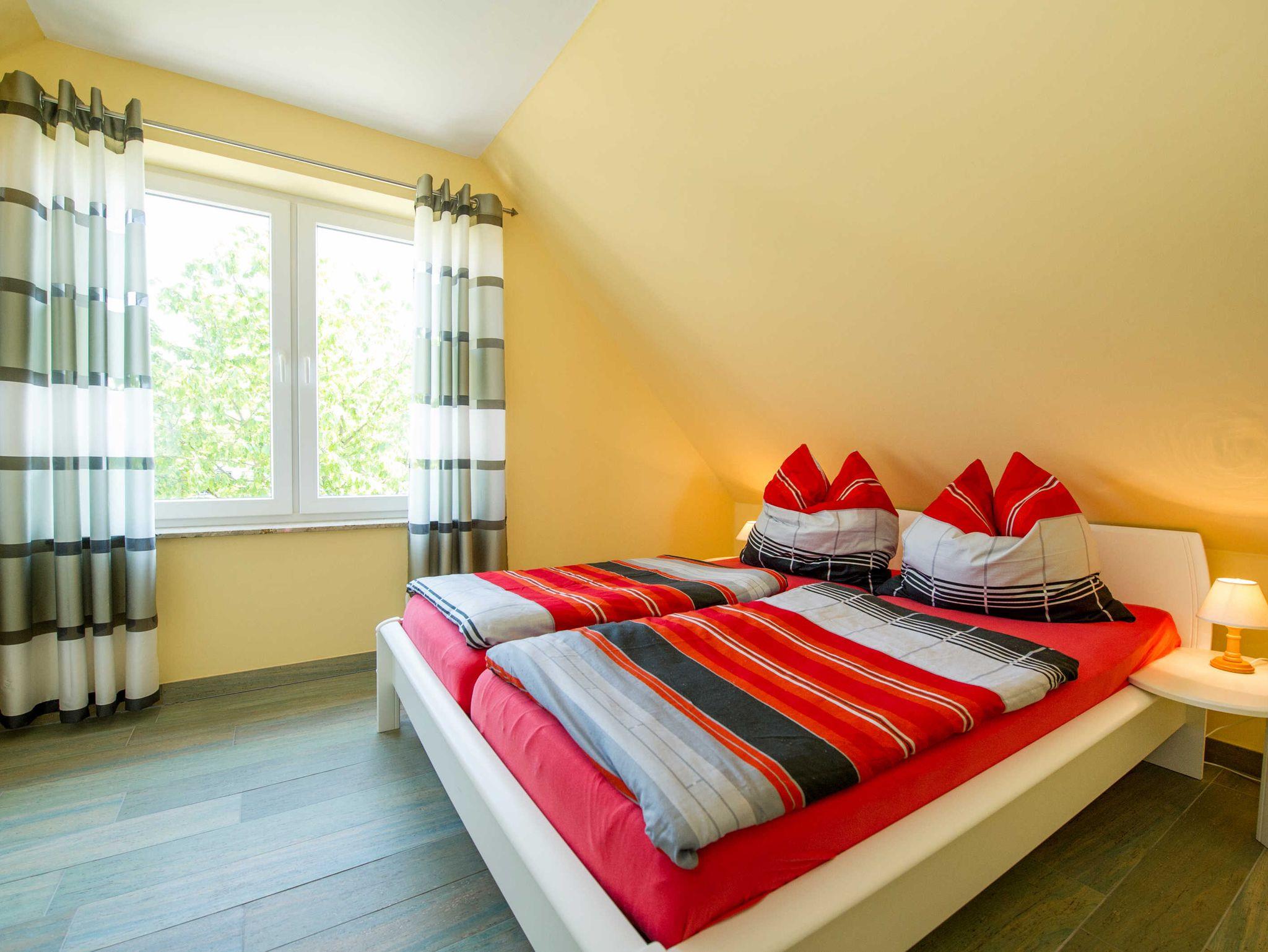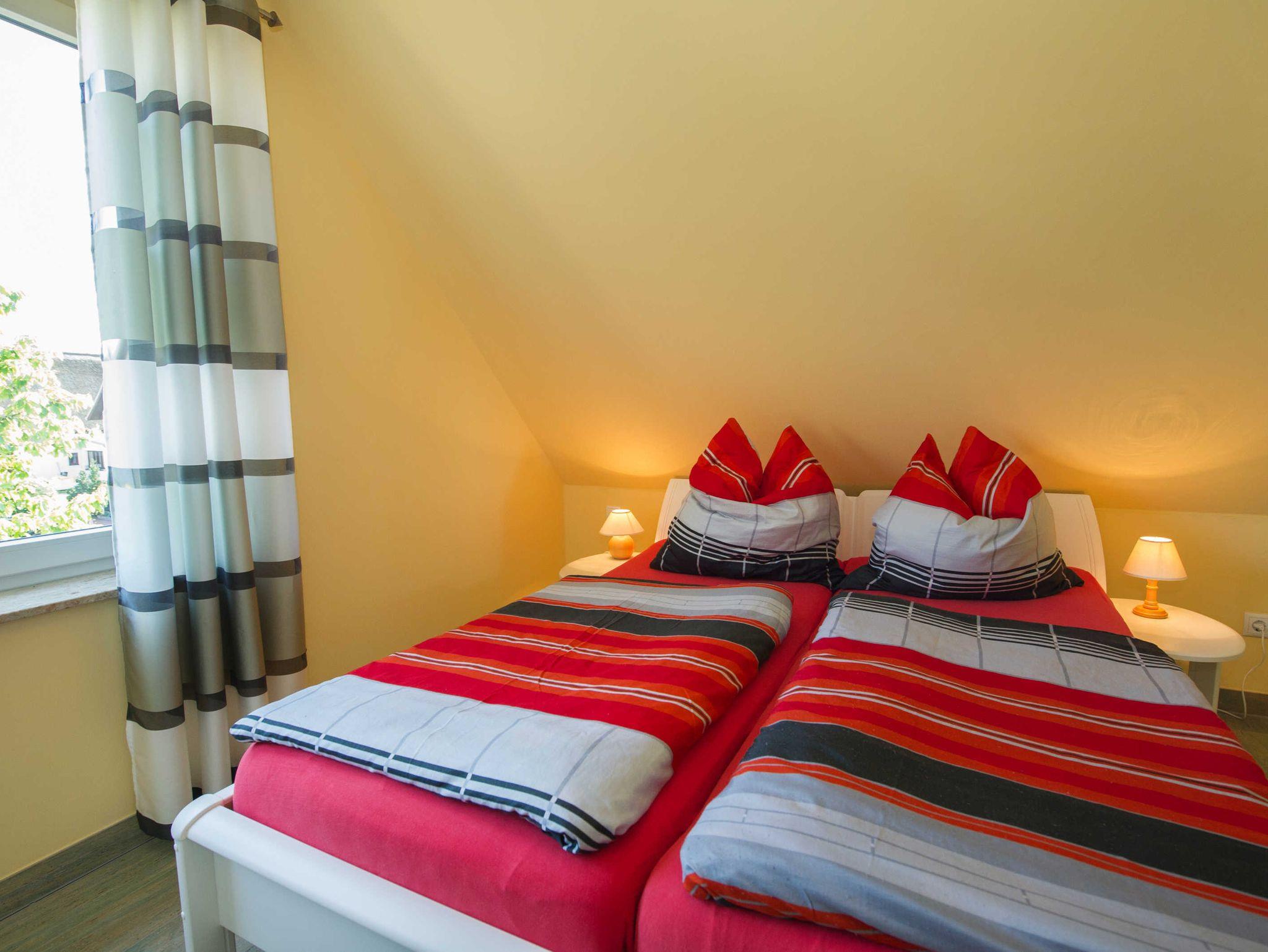 Über eine Treppe gelangt man in das Obergeschoss, in dem sich die beiden Schlafzimmer befinden. Das 1. Schlafzimmer bietet ein bequemes Doppelbett mit Nachttisch und Leselampen und einen Kleiderschrank. Das 2. Schlafzimmer ist mit einem Einzeletten, Nachttisch und Leselampe sowie Kleiderschrank ausgestattet.