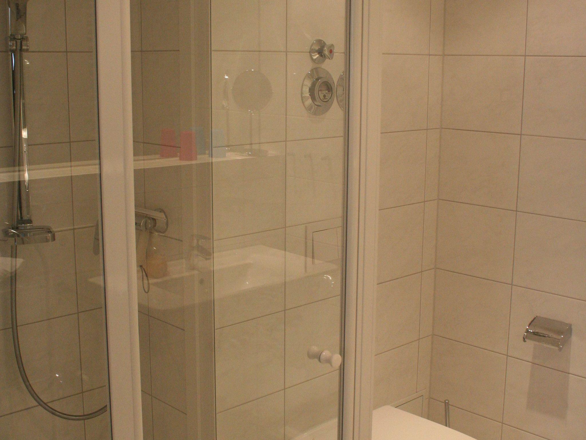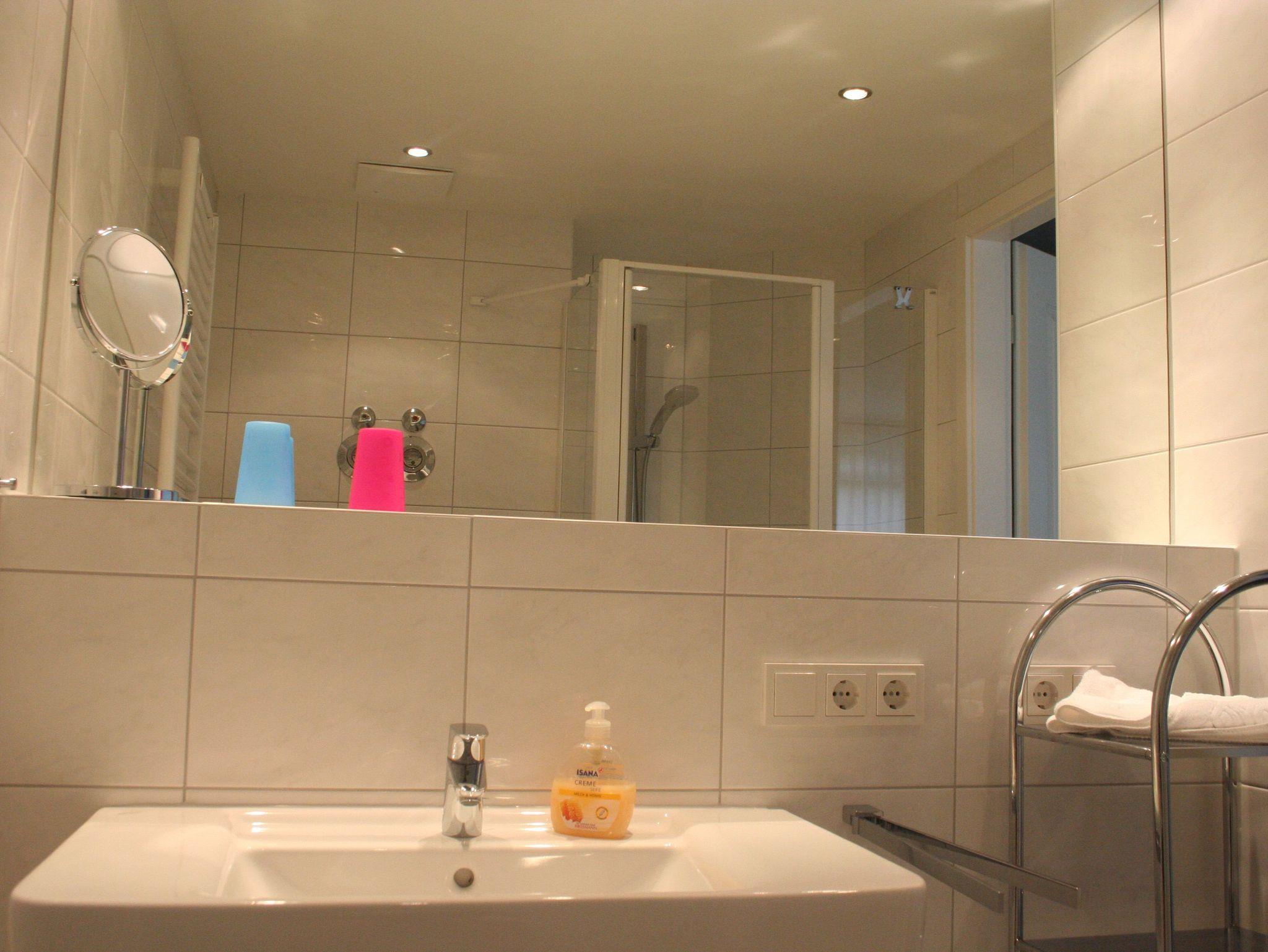 Das Bad hat eine begehbare Dusche.