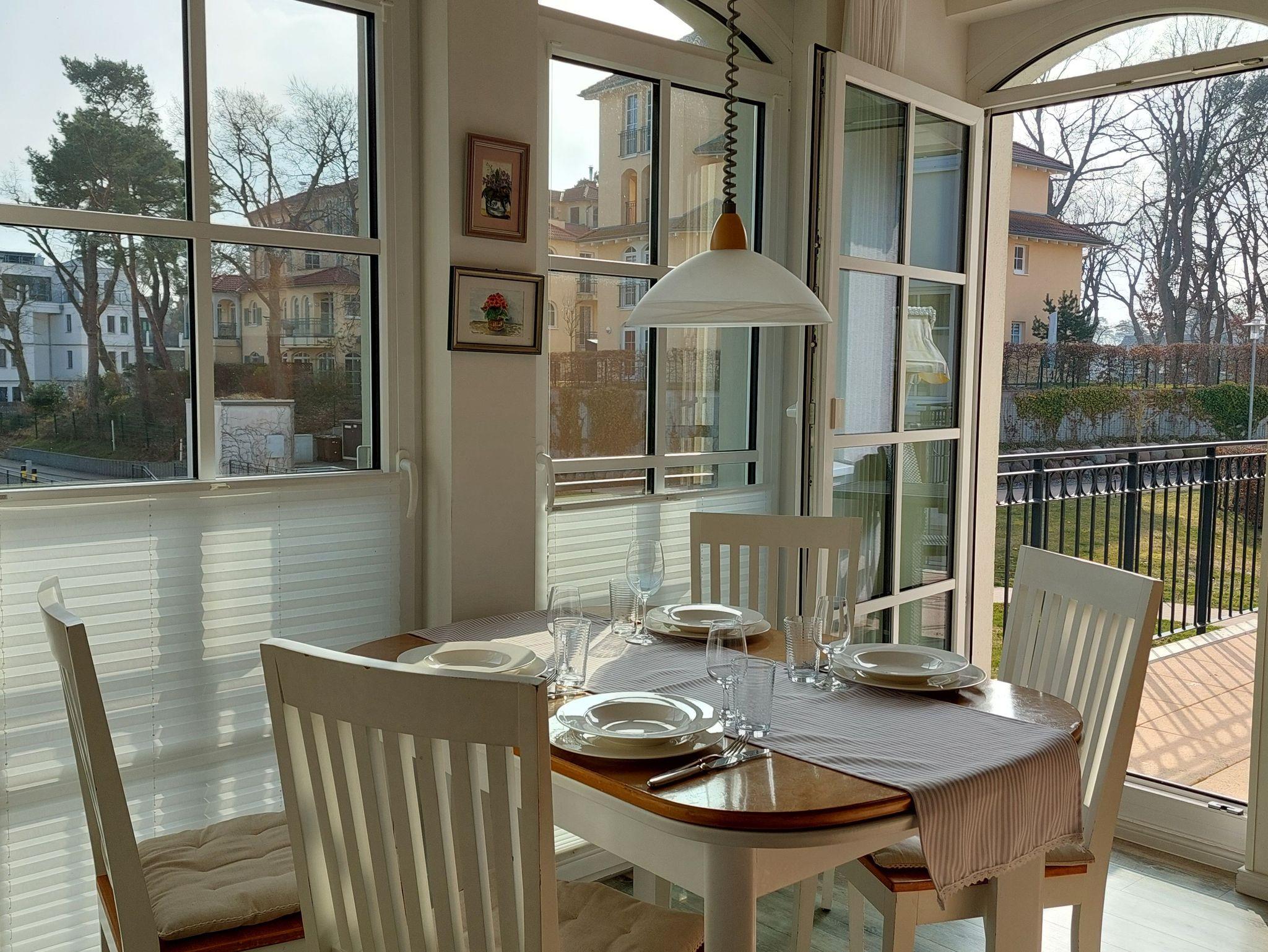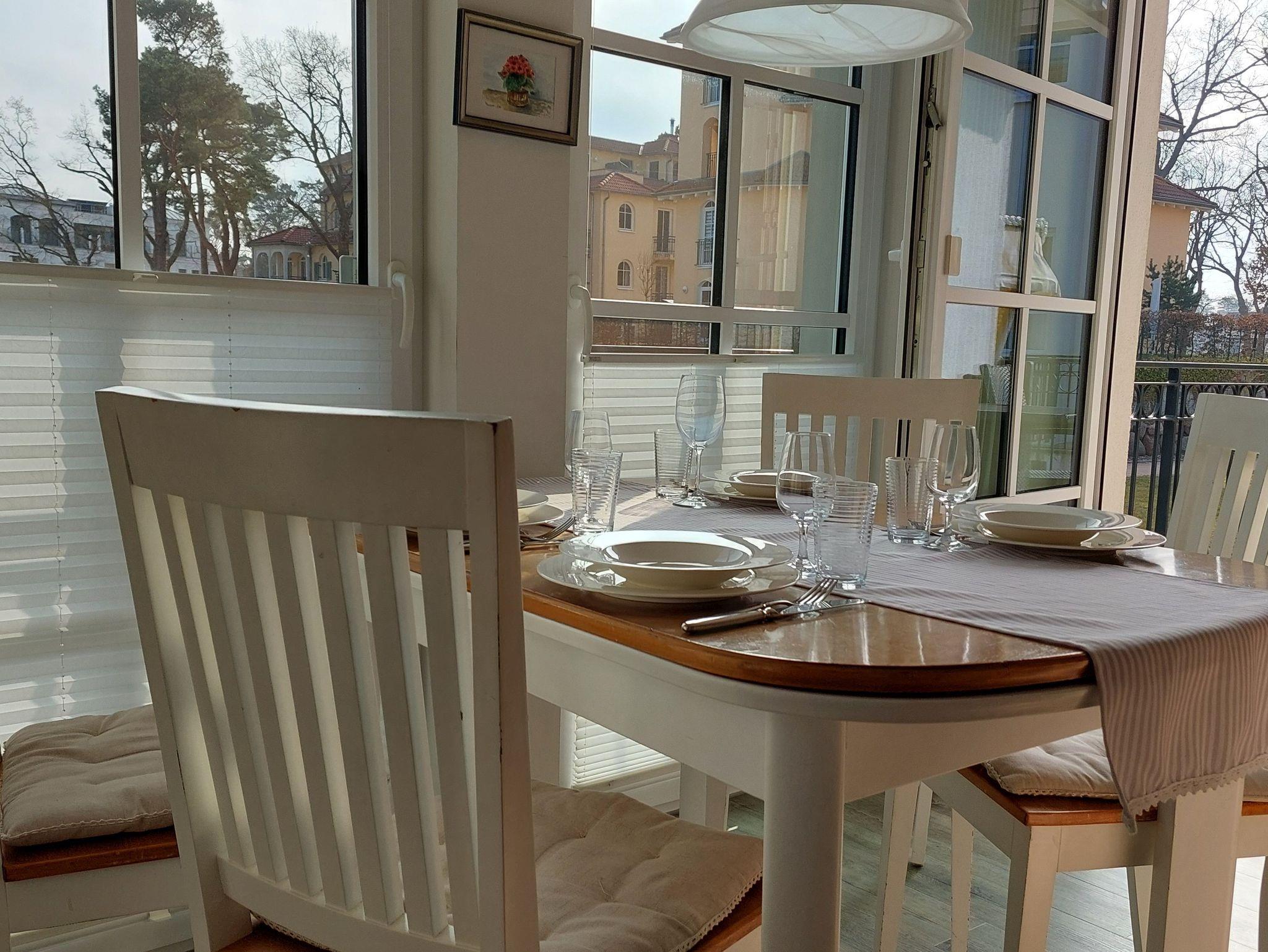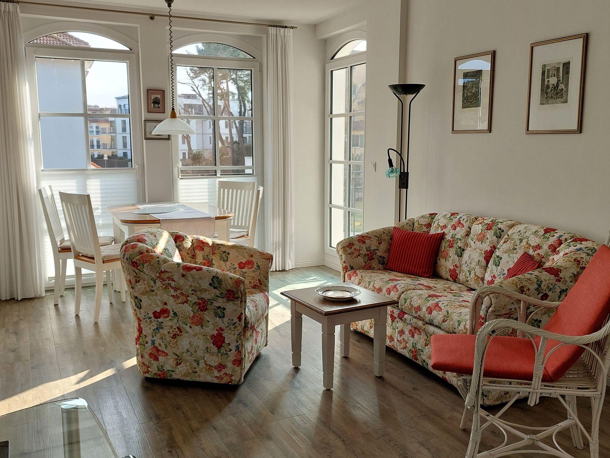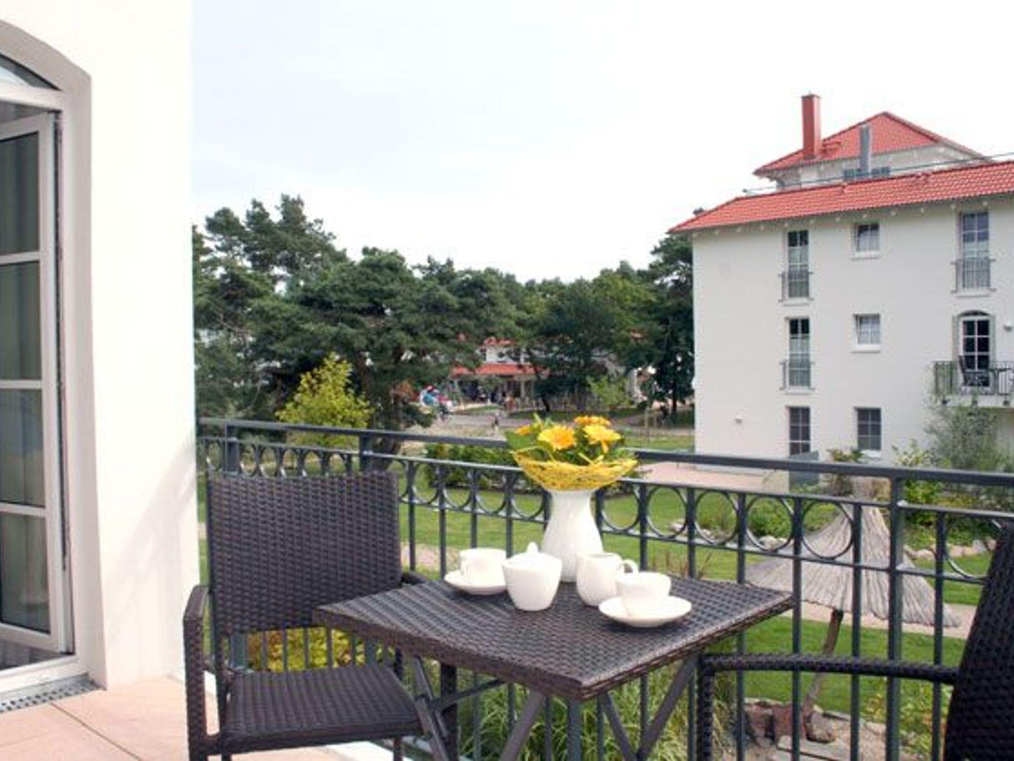 Sonnige Ferienwohnung für 2 - 3 Personen mit 2 Schlafzimmern und schönen möbliertem Balkon mit Blick zum Kurpark, WLAN vorhanden. Die Ferienwohnung liegt in der 1. Etage des Hauses. Das erst 2013 neu eröffnete Haus Meeresblick mit Schwimmbad, Massage- und Saunabereich liegt direkt am Strand von Baabe.