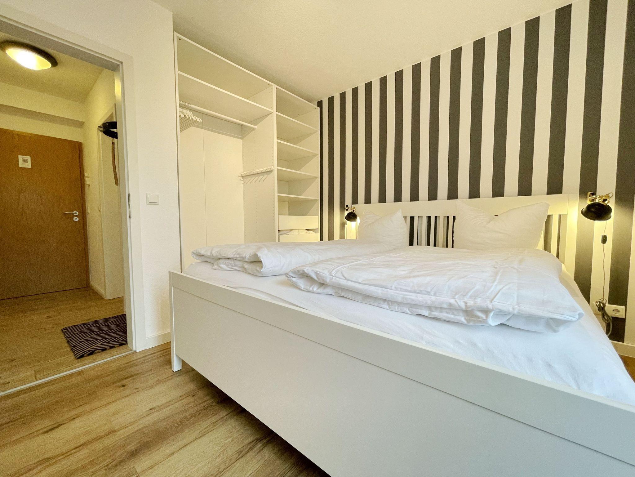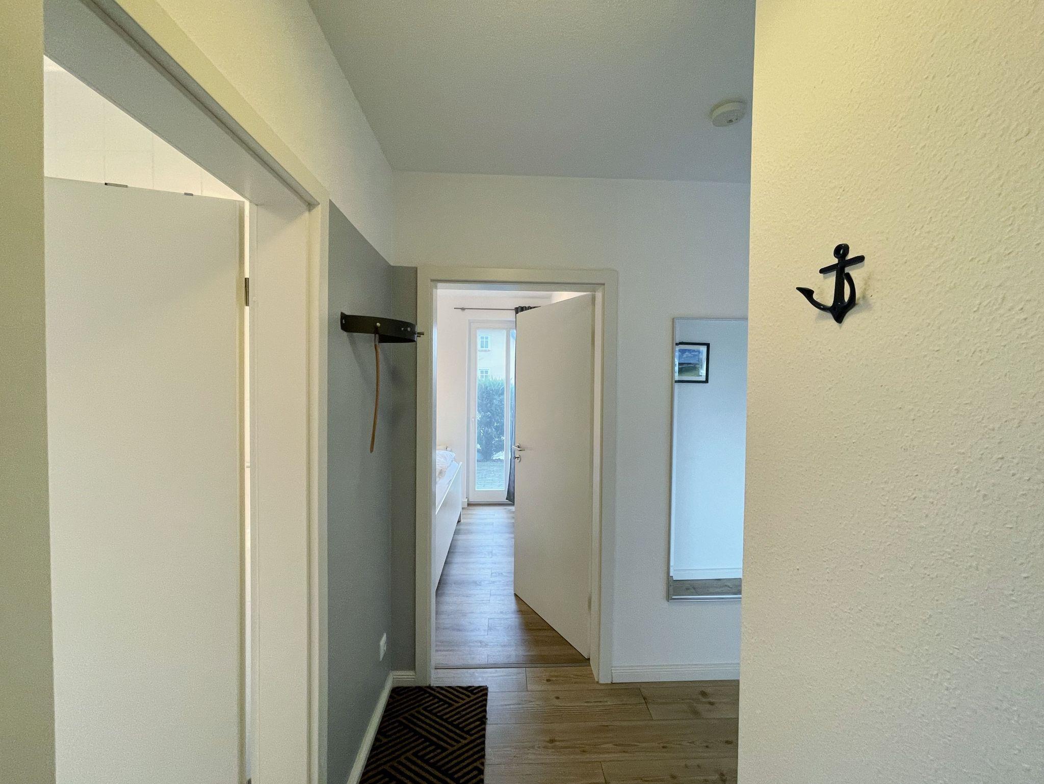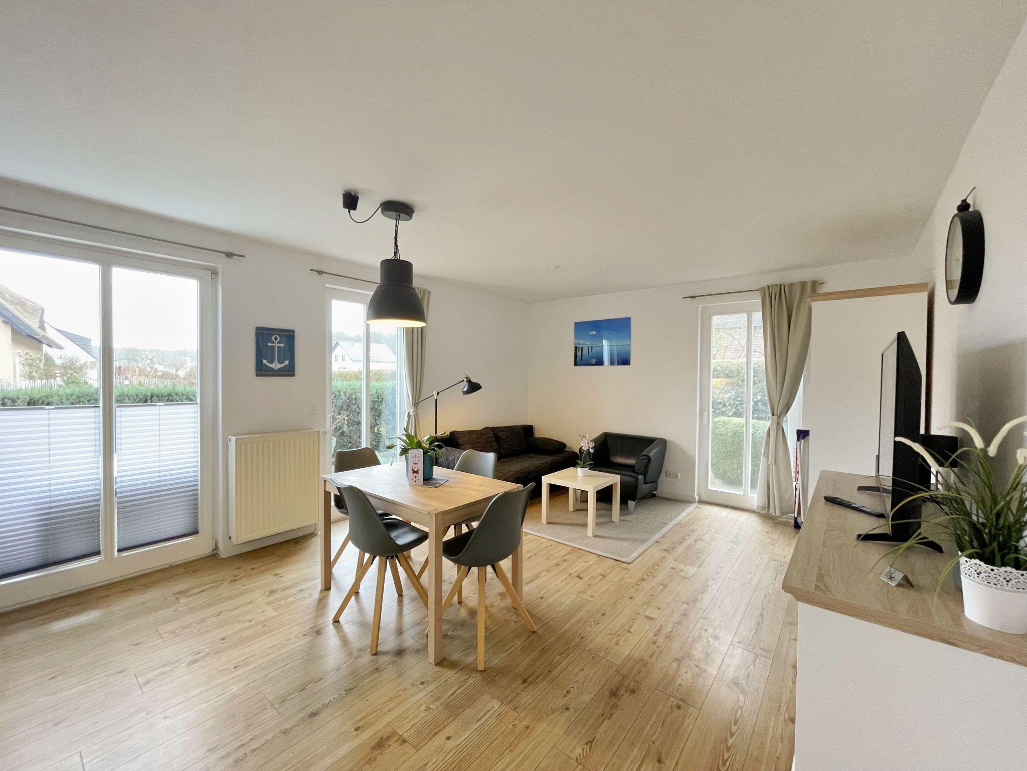 Die 50 qm Nichtraucher-Wohnung ist modern und hell im skandinavischen Stil eingerichtet und bietet Platz für max. 2 bis 3 Erwachsene. Fotografien der Insel lassen Sie beim Eintreten auf der Insel ankommen. Über einen kleinen Flur mit Garderobe gelangen Sie direkt in den großen Wohn- und Essbereich mit Einbauküche. Die bodentiefen Terrassentüren mit Insektenschutzgittern sorgen für viel Tageslicht. Der Wohnbereich ist gemütlich gestaltet und lädt zum Entspannen ein. Er verfügt über eine bequeme Leder-Schlafcouch (Aufbettungsmöglichkeit für 3. Person, 1,00m x 2,00m), ein Couchtisch, eine Stehlampe und einen Sessel. Hier können Sie es sich gemütlich machen, einen Film auf dem 55-Zoll-Smart-TV genießen oder der Musik aus dem Bluetooth-Radio lauschen. Ein WLAN-Anschluss rundet den technischen Bereich ab. In dem Sideboard und dem Highboard finden Sie ausreichend Stauraum für Ihre persönlichen Gegenstände. Zusätzlich befindet sich dort eine Spielesammlung sowie eine kleine Auswahl an Büchern. Die Fenster sind mit Plissees ausgestattet, die Sonnen- und Sichtschutz bieten. Die Einbauküche beinhaltet alles, was Sie zur Zubereitung Ihrer Mahlzeiten benötigen. Wie ein Induktionsherd, ein Kühlschrank mit Gefrierfach, eine Mikrowelle und ein Geschirrspüler. Darüber hinaus steht Ihnen sowohl eine Filter-Kaffeemaschine als auch eine Nespresso-Kapselmaschine, ein Wasserkocher, ein Toaster, ein Messerblock sowie viele Kochutensilien zur Verfügung. Ein Esstisch rundet den Küchenbereich ab. Von hier aus gelangen Sie auch auf ihre eigene bestuhlte Terrasse mit Süd-Ost-Ausrichtung, die an warmen Tagen zu einem Frühstück in der Morgensonne einlädt. Zusätzlich befinden sich hier zwei Lounge-Sonnenliegesessel. In Ihrem eigenen kleinen Gartenabschnitt, der durch eine Hecke vor neugierigen Blicken geschützt ist, können Sie gemütlich ein gutes Buch lesen oder die Sonne genießen. Das moderne Schlafzimmer verfügt über ein komfortables Doppelbett (1,80m x 2,00m) mit Wand-Nachttischlampen, verstellbare Lattenroste, Insektenschutzgitter sowie ein geräumiger und offener Kleiderschrank. Die bodentiefen Fenster sind neben den Plissees mit Verdunklungsvorhängen ausgestattet, um Ihnen einen erholsamen Schlaf zu ermöglichen. Das kompakte Tageslicht-Bad ist funktional gestaltet und verfügt über eine Eck-Dusche, ein Fön, ein WC, ein Insektenschutzgitter und ein Waschplatz. Eine Ablage bietet Platz für Kosmetikutensilien und ein beleuchteter Spiegel sorgt für die richtige Ausleuchtung. Ebenso finden Sie in Ihrer Wohnung ein Wäscheständer sowie Reinigungsutensilien vor. Zusätzlich zu Ihrem eigenen kleinen Außenbereich steht Ihnen ein 2500 qm großer Gemeinschaftsgarten zur Verfügung, der zum Verweilen einlädt. Dort finden Sie Strandkörbe Sitzgelegenheiten sowie einen Grillplatz, den Sie gemeinsam mit anderen Gästen nutzen können. Ein Haustier ist gegen eine Gebühr ein gern gesehener Gast. Ihre mitgebrachten oder geliehenen Fahrräder können Sie auf dem Grundstück abstellen. Ein PKW-Stellplatz befindet sich direkt am Haus. Die Erstausstattung eines Wäschepaketes (komplette Bettwäsche, 1 Duschhandtuch, 2 kleine Handtücher) können Sie bis 14 Tage vor Anreise gegen einen Aufpreis dazu buchen oder durch eigene ergänzen. Ab 2 gebuchten Paketen erhalten Sie einmalig 1 Geschirrhandtuch und 1 Duschvorleger hinzu.
