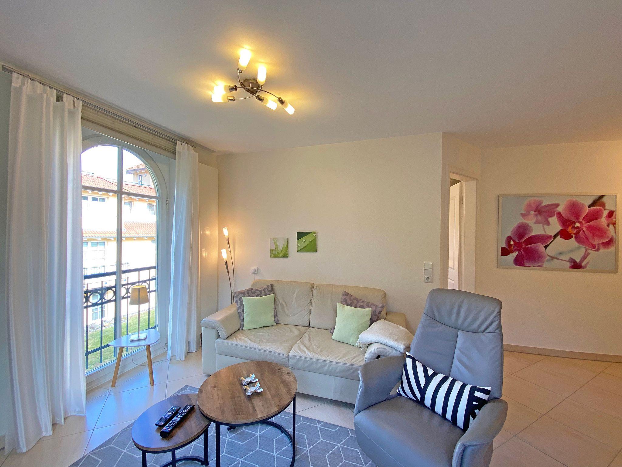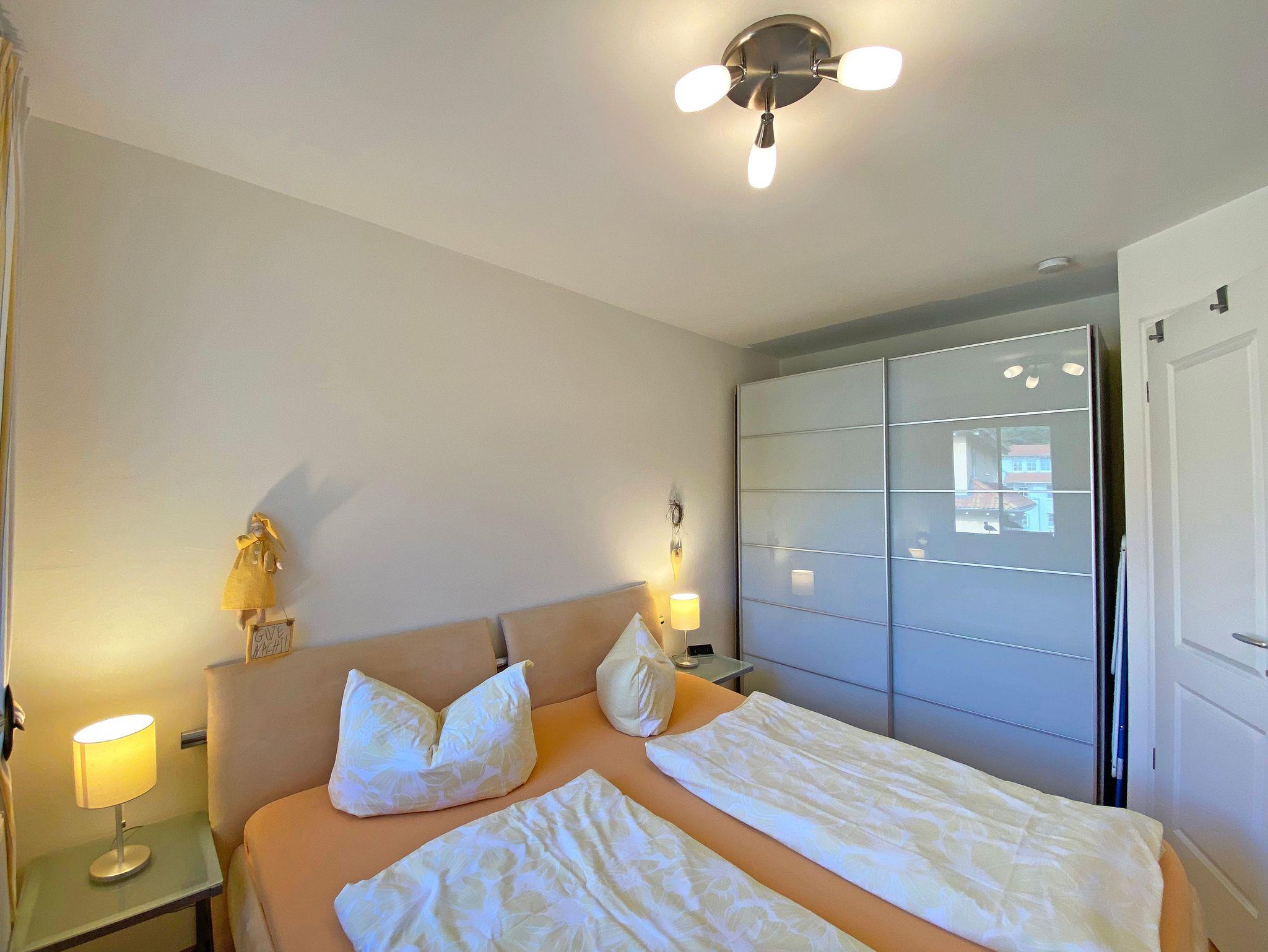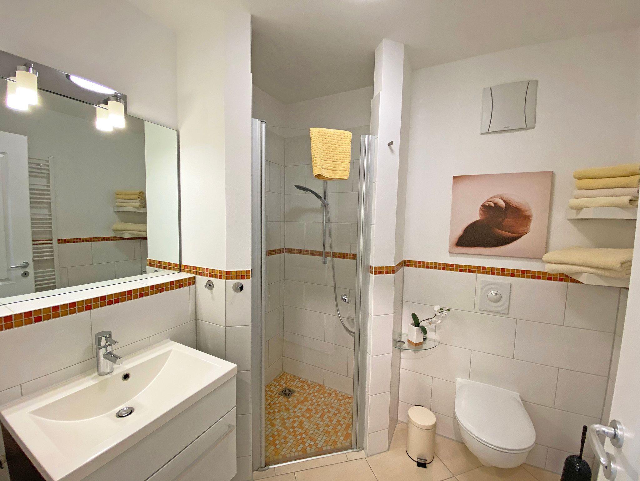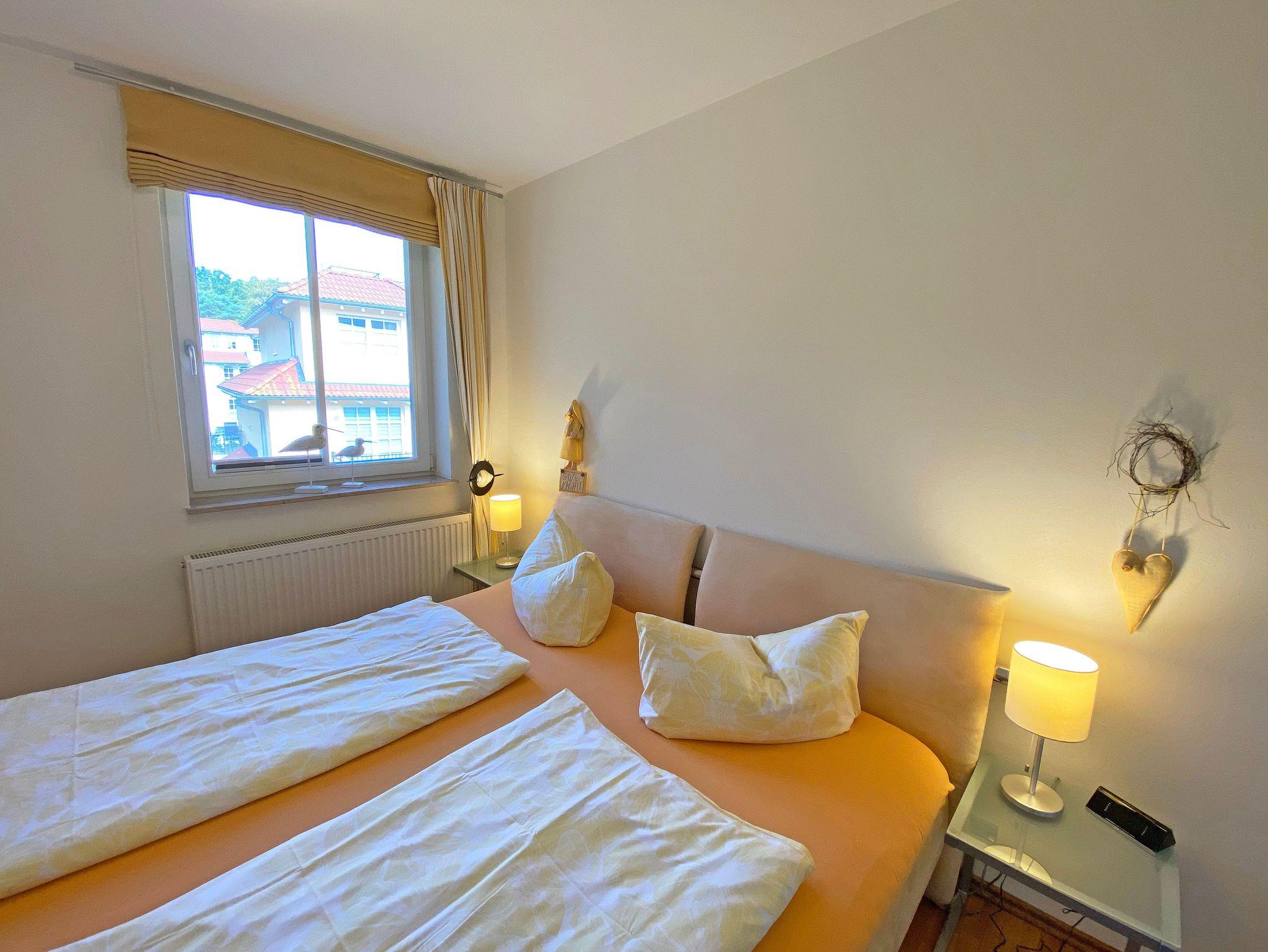 Die Wohnung Nr. 18 liegt absolut ruhig im 2. OG des Hauses und ist bequem mit einem Fahrstuhl zu erreichen. Die Nichtraucherferienwohnung bietet mit Ihren ca. 38qm ausreichend Platz für max. 2 Personen + ein Kleinkind bis 3 Jahre im Kinderreisebett. Im lichtdurchfluteten Wohnbereich befindet sich ein Ledersofa, zwei Couchtische, ein Beistelltisch, eine Leselampe, ein TV-Unterschrank sowie ein Relax Sessel. Ein kostenlosen WLAN-Zugang sowie ein Smart-TV, ein DAB-Radio und ein Blue Ray Player runden den technischen Bereich ab. Von hier aus gelangen Sie auf den großen bestuhlten Balkon (Süd/West) mit Blick ins Grüne, welcher zusätzlich über eine elektrische Markise verfügt, so dass Sie Ihren Tag gemütlich ausklingen lassen können. An den Wohnbereich angrenzend befindet sich die komfortable Küchenzeile, ausgestattet ist diese mit einem Ceranfeld, Backofen, Geschirrspüler, Mikrowelle, Kühlschrank mit Gefrierfach, Kaffeemaschine mit Thermoskanne, Senseo-Padmaschine, Wasserkocher, Toaster, Eierkocher sowie einen Esstisch. Im Schlafzimmer befindet sich ein bequemes Doppelbett (1,80m x 2,00m) mit verstellbaren Lattenrosten, zwei Nachtischablagen, Insektenschutzgitter, Verdunklungsmöglichkeit und ein großer Kleiderschrank mit Safe sowie ein Smart-TV. Das Aufstellen eines Kinderreisebettes ist im Schlafzimmer möglich. Im innenliegenden Bad befindet sich eine bodentiefe Dusche, ein Waschbecken mit Unterschrank, ein Handtuchheizkörper, ein Fön, ein Kosmetikspiegel sowie ein WC. Ein Kinderreisebett mit Matratze sowie ein Hochstuhl stehen Ihnen zur Verfügung. Im Kellergeschoss der Grüne Düne steht Ihnen eine Gemeinschaftssauna mit Dusche, WC nebst Ruheraum gegen Gebühr zur Verfügung sowie ein Waschraum mit Münzwaschmaschine und Münztrockner. Ein PKW-Stellplatz (Nr.18) ist direkt vor dem Haus. Haustiere sind nicht erlaubt. Zur Erkundung der Umgebung stehen Ihnen zusätzlich 2 Fahrräder kostenfrei zur Verfügung (kein Vertragsbestandteil und auf eigene Gefahr). Die Erstausstattung eines Wäschepaketes (komplette Bettwäsche, 1 Duschhandtuch, 2 kleine Handtücher, 1 Duschvorleger, 1 Geschirrhandtuch) können Sie bis 14 Tage vor der Anreise gegen einen Aufpreis dazu buchen oder durch eigene ergänzen.