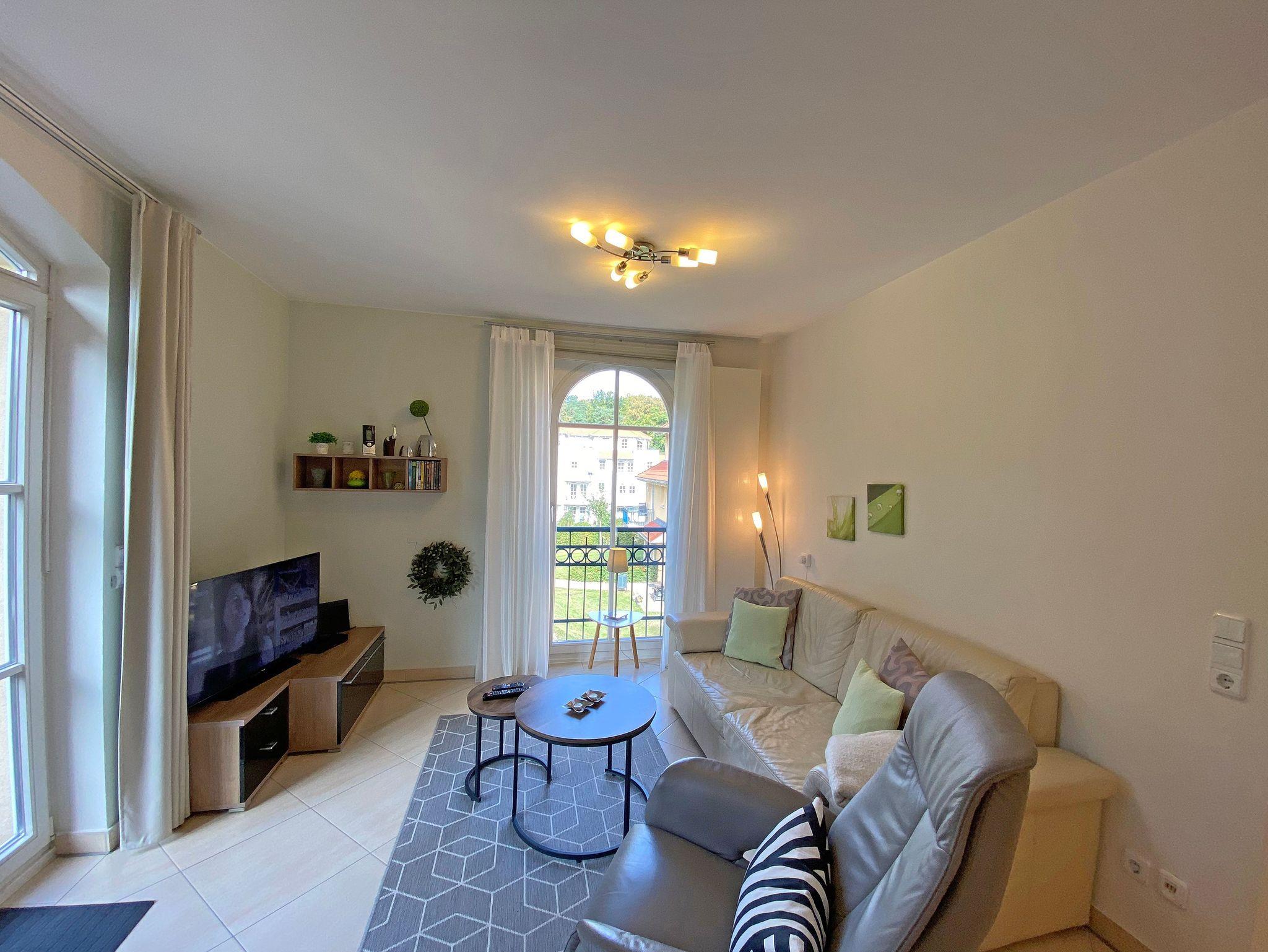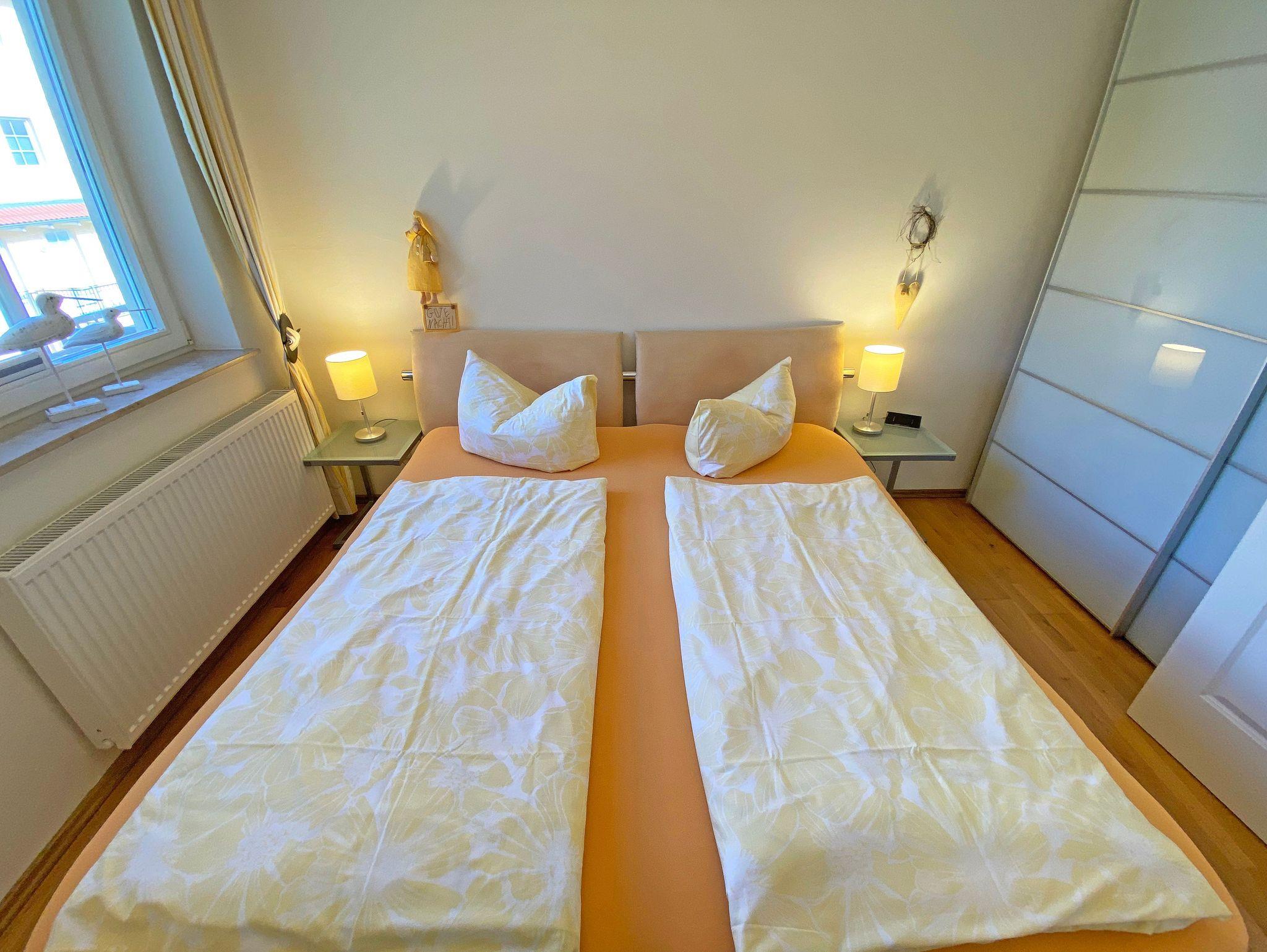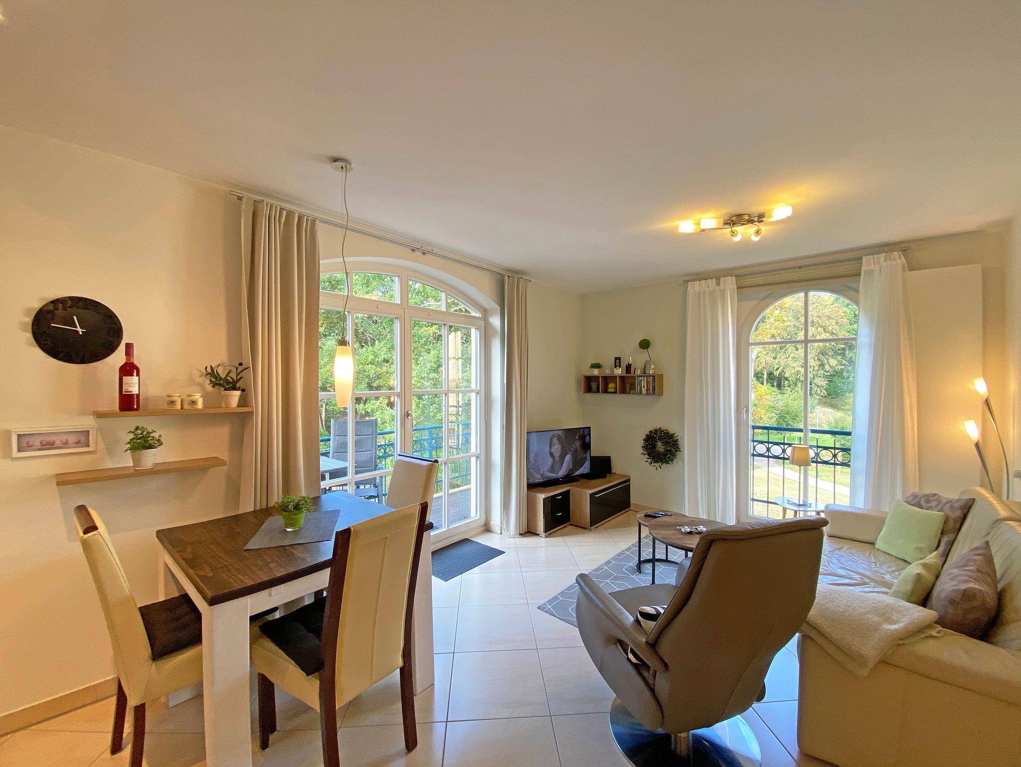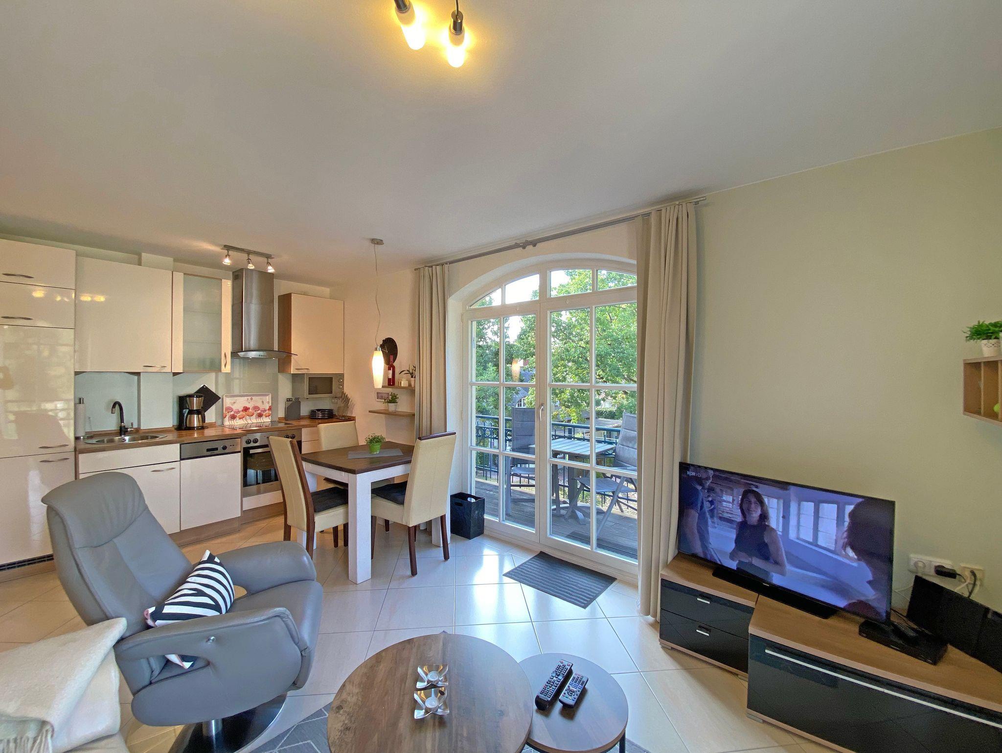Die Wohnung Nr. 18 liegt absolut ruhig im 2. OG des Hauses und ist bequem mit einem Fahrstuhl zu erreichen. Die Nichtraucherferienwohnung bietet mit Ihren ca. 38qm ausreichend Platz für max. 2 Personen + ein Kleinkind bis 3 Jahre im Kinderreisebett. Im lichtdurchfluteten Wohnbereich befindet sich ein Ledersofa, zwei Couchtische, ein Beistelltisch, eine Leselampe, ein TV-Unterschrank sowie ein Relax Sessel. Ein kostenlosen WLAN-Zugang sowie ein Smart-TV, ein DAB-Radio und ein Blue Ray Player runden den technischen Bereich ab. Von hier aus gelangen Sie auf den großen bestuhlten Balkon (Süd/West) mit Blick ins Grüne, welcher zusätzlich über eine elektrische Markise verfügt, so dass Sie Ihren Tag gemütlich ausklingen lassen können. An den Wohnbereich angrenzend befindet sich die komfortable Küchenzeile, ausgestattet ist diese mit einem Ceranfeld, Backofen, Geschirrspüler, Mikrowelle, Kühlschrank mit Gefrierfach, Kaffeemaschine mit Thermoskanne, Senseo-Padmaschine, Wasserkocher, Toaster, Eierkocher sowie einen Esstisch. Im Schlafzimmer befindet sich ein bequemes Doppelbett (1,80m x 2,00m) mit verstellbaren Lattenrosten, zwei Nachtischablagen, Insektenschutzgitter, Verdunklungsmöglichkeit und ein großer Kleiderschrank mit Safe sowie ein Smart-TV. Das Aufstellen eines Kinderreisebettes ist im Schlafzimmer möglich. Im innenliegenden Bad befindet sich eine bodentiefe Dusche, ein Waschbecken mit Unterschrank, ein Handtuchheizkörper, ein Fön, ein Kosmetikspiegel sowie ein WC. Ein Kinderreisebett mit Matratze sowie ein Hochstuhl stehen Ihnen zur Verfügung. Im Kellergeschoss der Grüne Düne steht Ihnen eine Gemeinschaftssauna mit Dusche, WC nebst Ruheraum gegen Gebühr zur Verfügung sowie ein Waschraum mit Münzwaschmaschine und Münztrockner. Ein PKW-Stellplatz (Nr.18) ist direkt vor dem Haus. Haustiere sind nicht erlaubt. Zur Erkundung der Umgebung stehen Ihnen zusätzlich 2 Fahrräder kostenfrei zur Verfügung (kein Vertragsbestandteil und auf eigene Gefahr). Die Erstausstattung eines Wäschepaketes (komplette Bettwäsche, 1 Duschhandtuch, 2 kleine Handtücher, 1 Duschvorleger, 1 Geschirrhandtuch) können Sie bis 14 Tage vor der Anreise gegen einen Aufpreis dazu buchen oder durch eigene ergänzen.