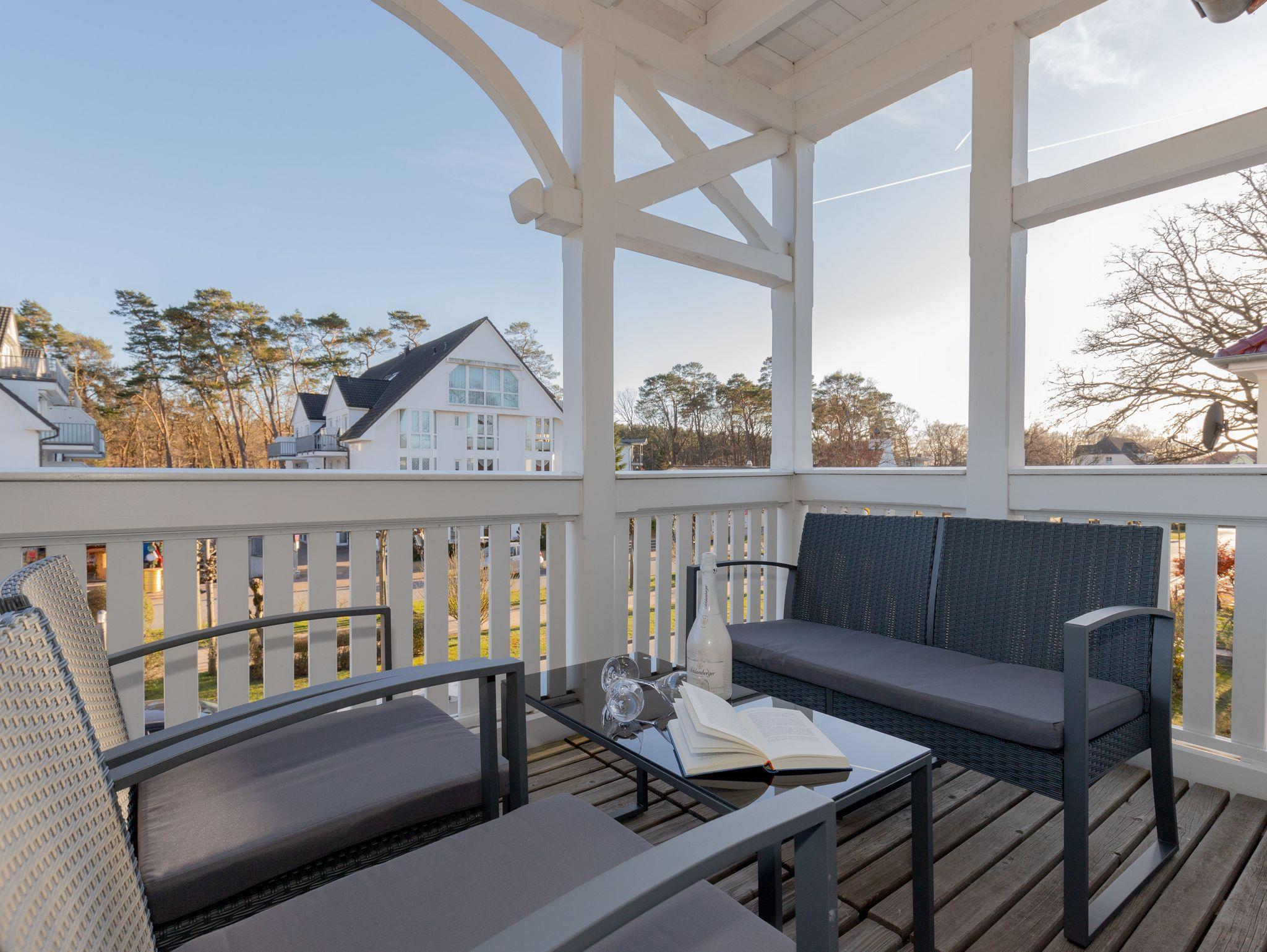 Zu dieser Ferienwohnung gehört ein schöner riesengrößer Balkon mit Gartenmöbeln und Sonnenliegen und Blick auf die Strandstraße.