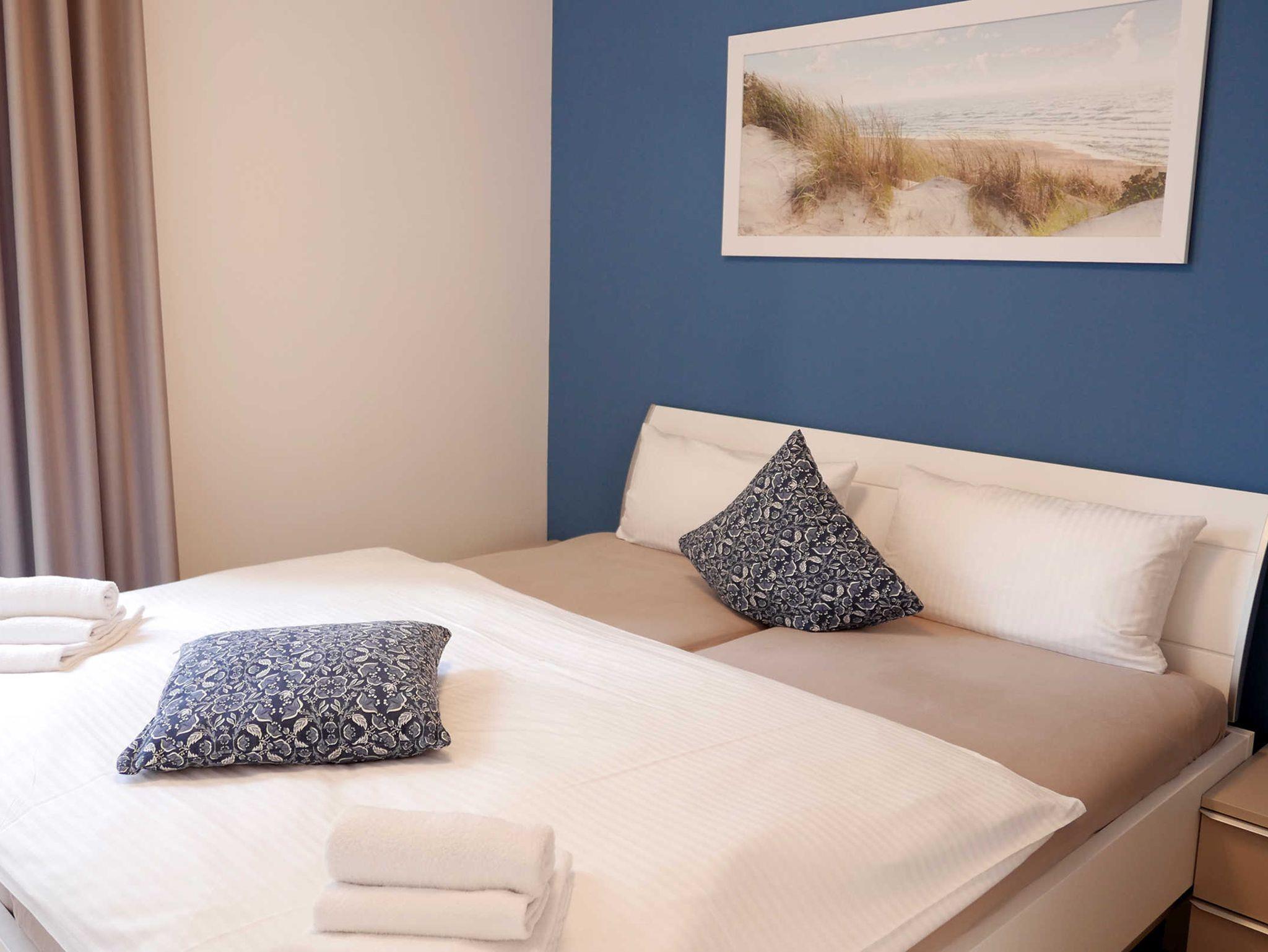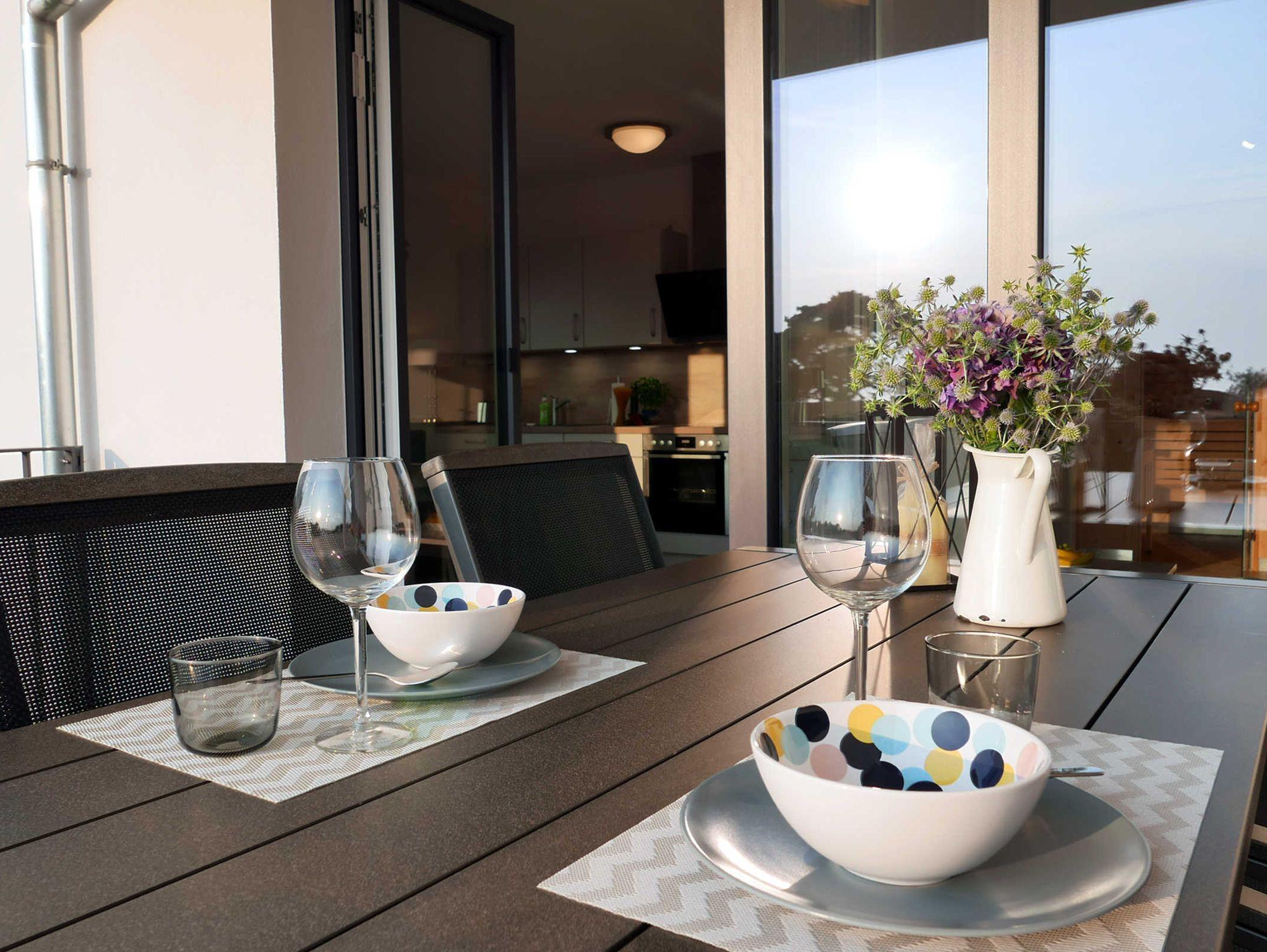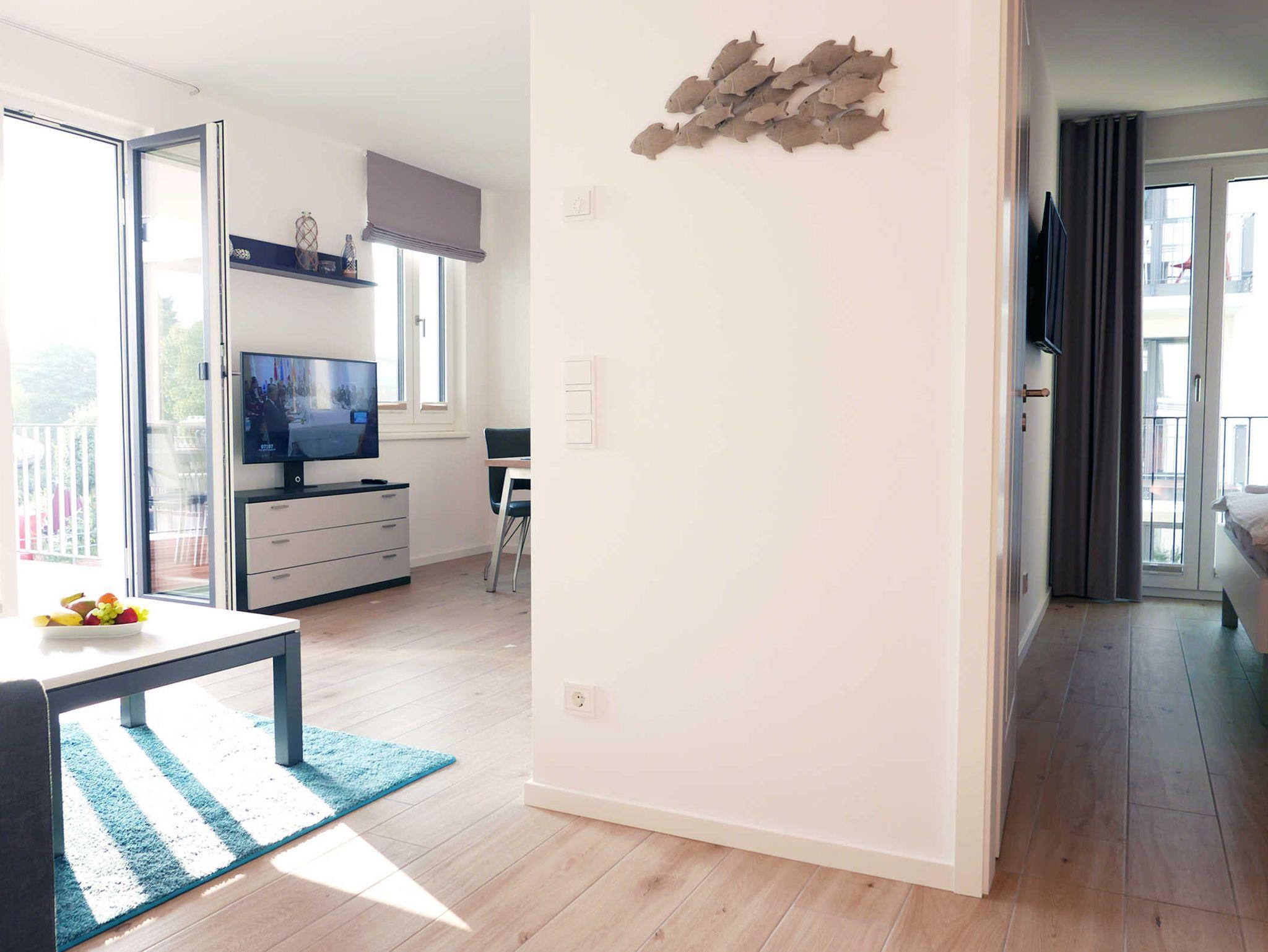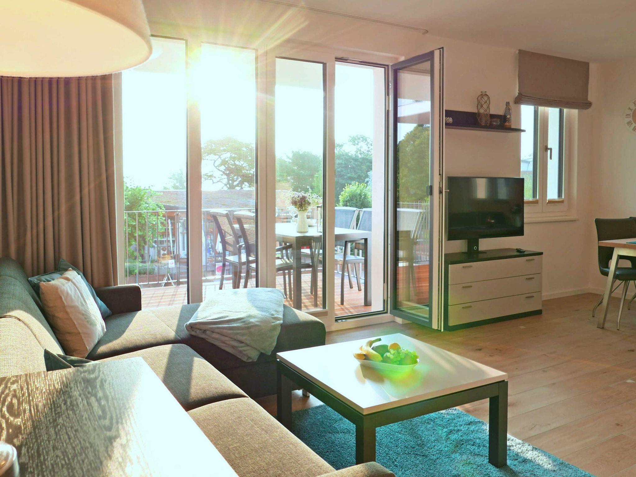 Die helle 2-Zimmer-Wohnung für 3 - 4 Personen mit Balkon (mit Meerblick) und eigener Sauna ist modern und hochwertig eingerichtet und liegt im ersten Obergeschoss. Ein Tiefgaragenstellplatz ist vorhanden.