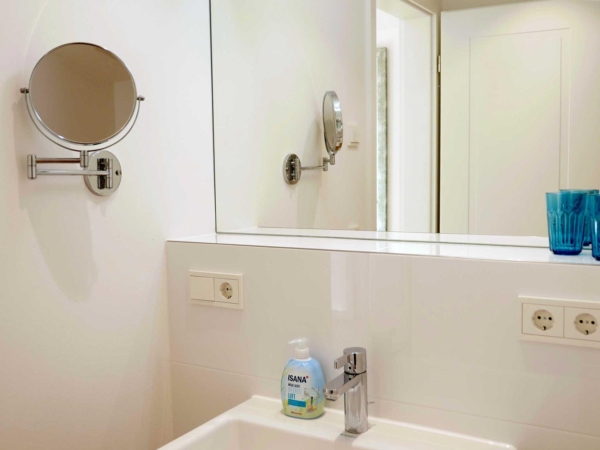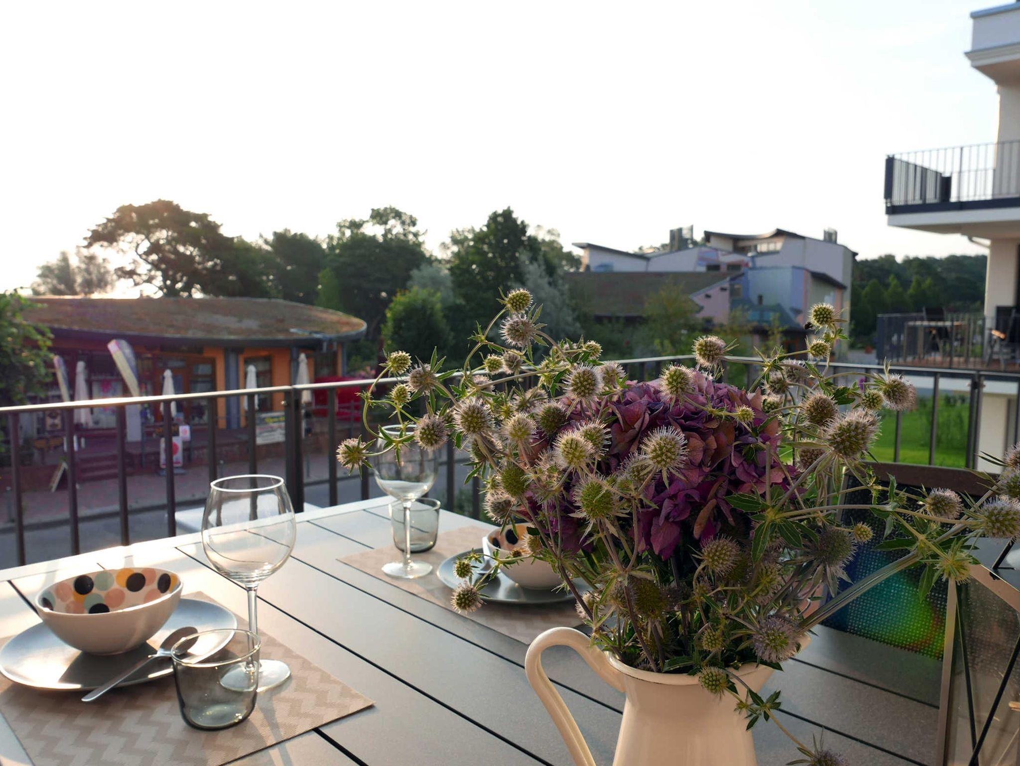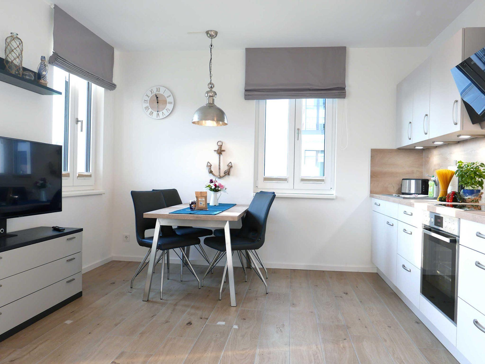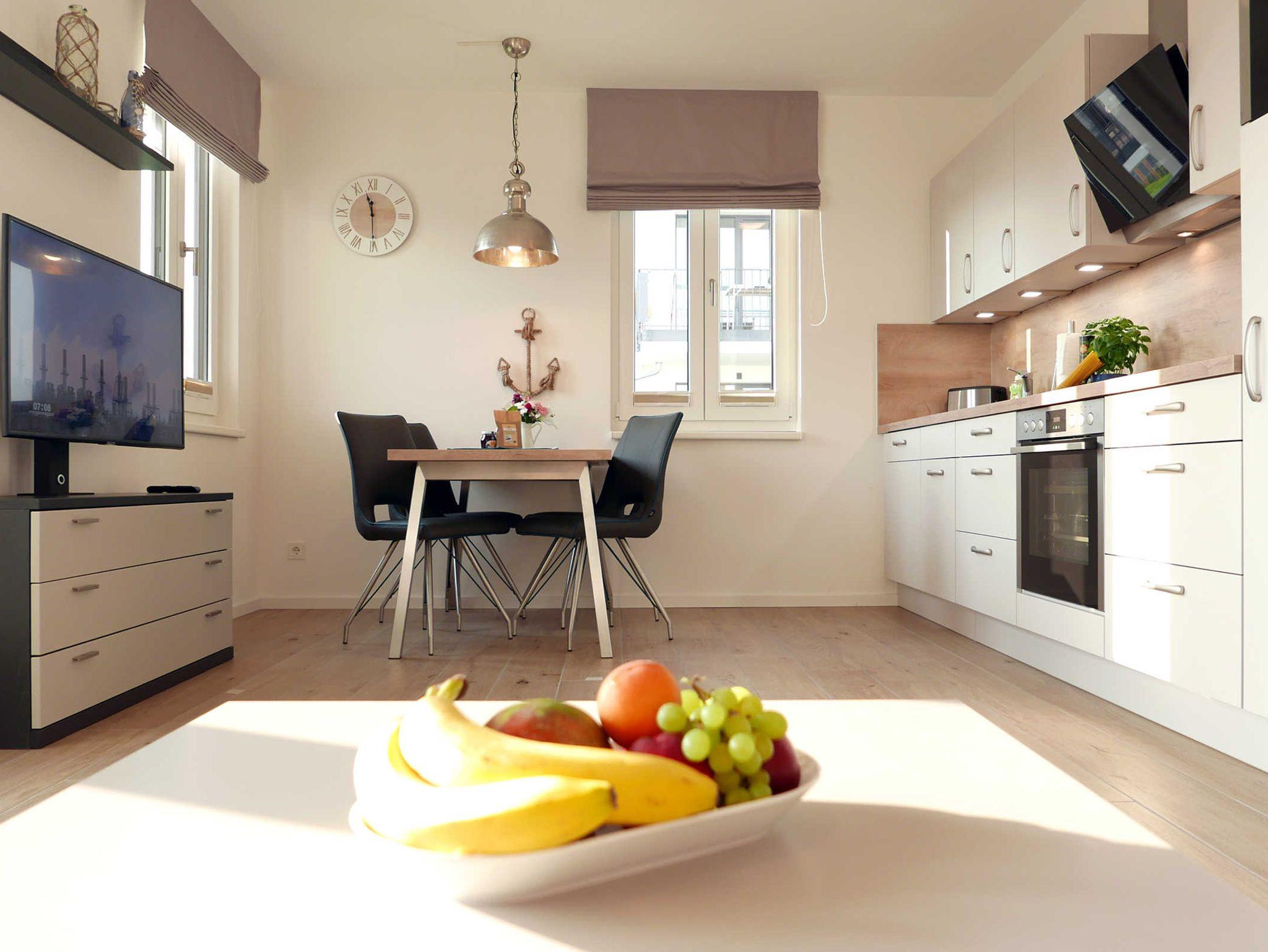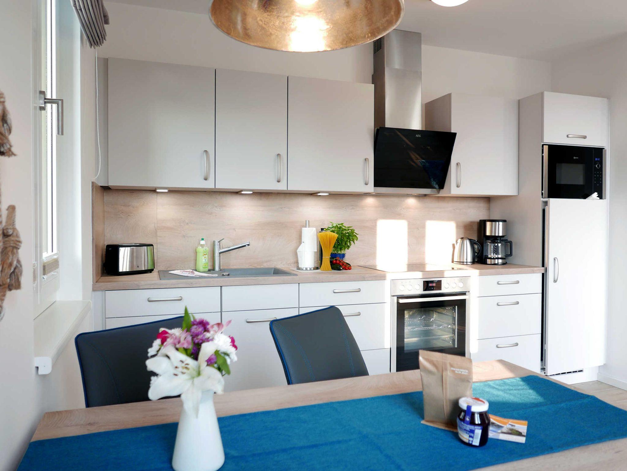 Die helle 2-Zimmer-Wohnung für 3 - 4 Personen mit Balkon (mit Meerblick) und eigener Sauna ist modern und hochwertig eingerichtet und liegt im ersten Obergeschoss. Ein Tiefgaragenstellplatz ist vorhanden.