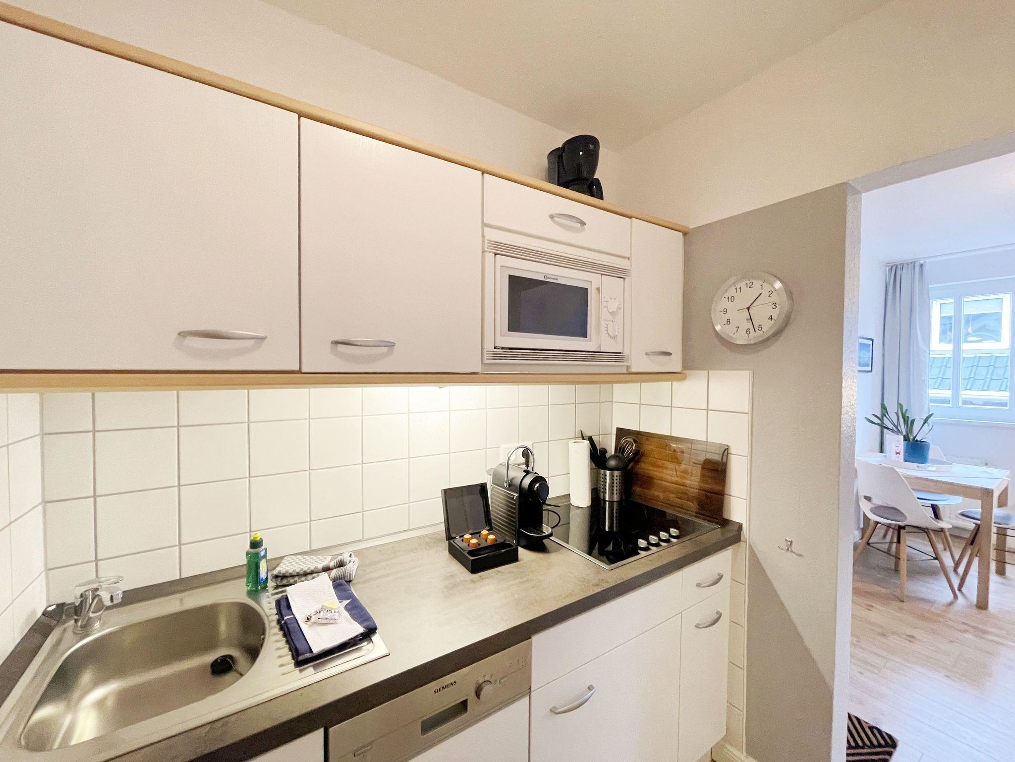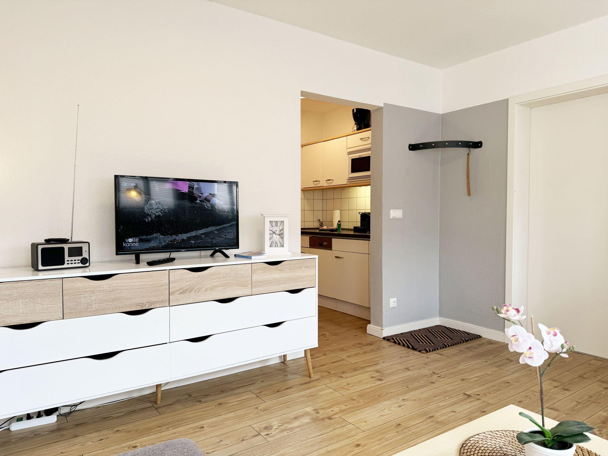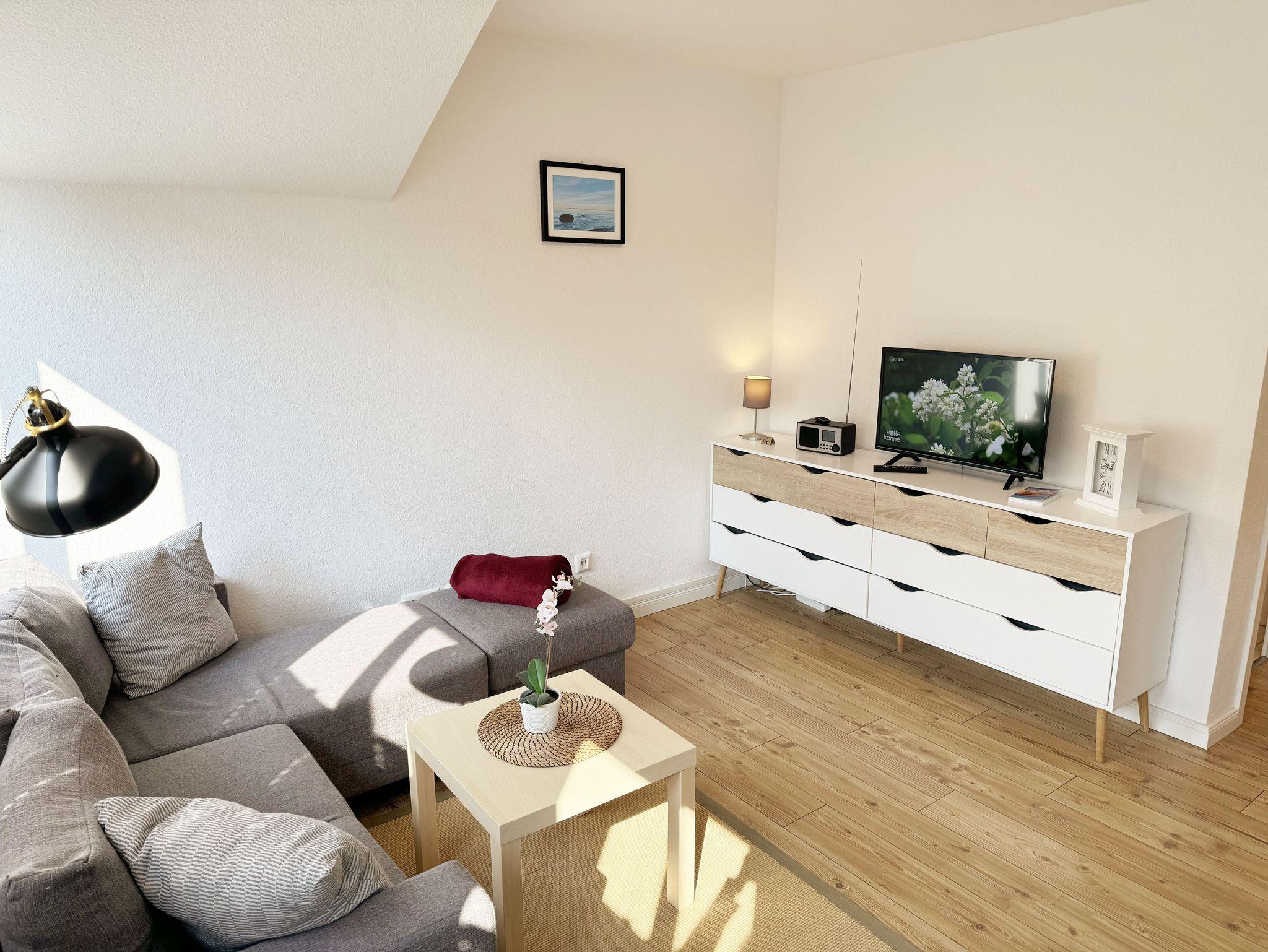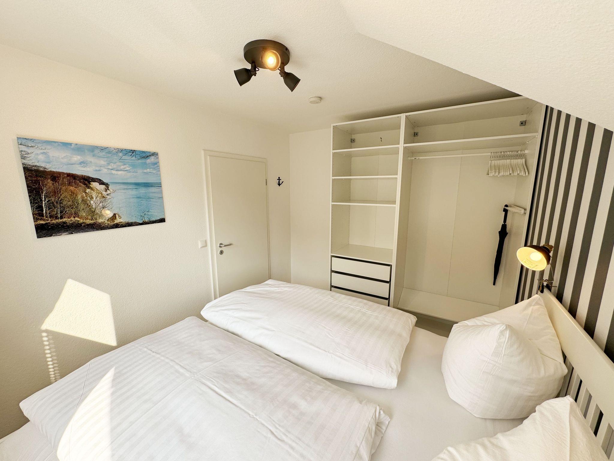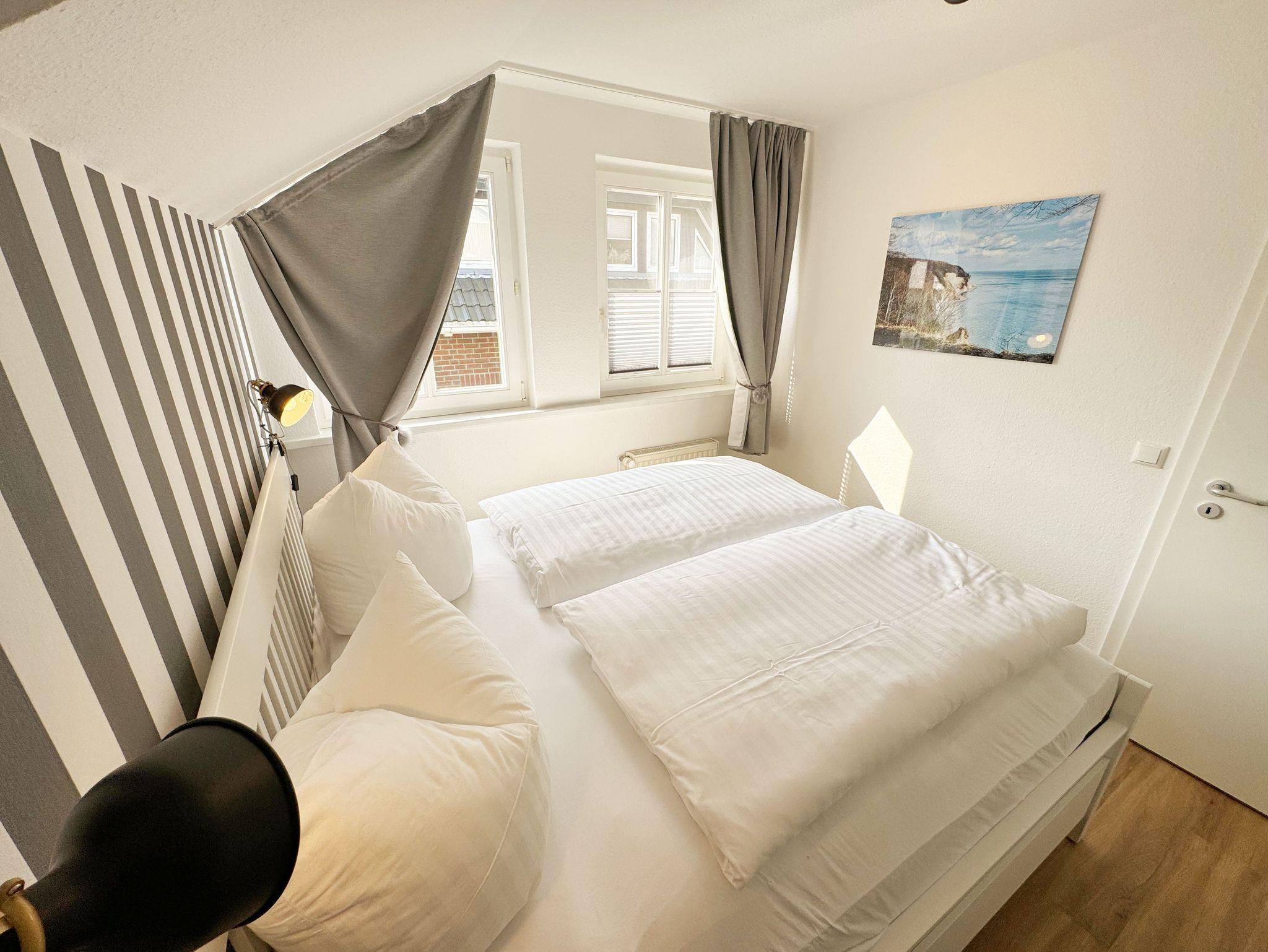 Die Ferienwohnung Schwalbennest“ befindet sich im Obergeschoss des Gästehaus Am Brook. Die 45 qm Nichtraucher-Wohnung ist modern, hell, im skandinavischen Stil eingerichtet und bietet Platz für max. 2 Personen. Fotografien der Insel lassen Sie beim Eintreten sofort auf Rügen ankommen. Über einen kleinen Flur indem sich auch die Küchenzeile befindet, gelangen Sie direkt in den Wohn- und Essbereich. Die großen Fenster mit Insektenschutzgittern sorgen für viel Tageslicht. Das Wohn-Esszimmer ist gemütlich gestaltet und lädt zum Entspannen ein. Es verfügt über eine bequeme Eckcouch mit beweglichem Fußteil, einem Couchtisch und einer Stehlampe. Hier können Sie es sich gemütlich machen, einen Film auf dem 32-Zoll-Smart-TV genießen oder der Musik aus dem Bluetooth-Radio lauschen. Ein WLAN-Anschluss rundet den technischen Bereich ab. In dem Sideboard finden Sie ausreichend Stauraum für Ihre persönlichen Gegenstände. Zusätzlich befindet sich dort eine Spielesammlung sowie eine kleine Auswahl an Büchern. Die Fenster sind mit Plissees ausgestattet, die Sonnen- und Sichtschutz bieten. Der angrenzende Esstisch rundet den Raum ab. Die Küchenzeile beinhaltet alles, was Sie zur Zubereitung Ihrer Mahlzeiten benötigen. Wie ein Induktionsherd, ein Kühlschrank mit Gefrierfach, eine Mikrowelle und ein Geschirrspüler. Darüber hinaus steht Ihnen sowohl eine Filter-Kaffeemaschine als auch eine Nespresso-Kapselmaschine, ein Wasserkocher, ein Toaster, ein Messerblock sowie viele Kochutensilien zur Verfügung. Das Schlafzimmer verfügt über ein komfortables Doppelbett (1,60m x 2,00m) mit Wand-Nachttischlampe, verstellbare Lattenroste sowie ein geräumiger Kleiderschrank. Die Fenster sind neben den Plissees mit Verdunklungsvorhängen und Insektenschutzgitter ausgestattet, um Ihnen einen erholsamen Schlaf zu ermöglichen. Das kompakte, innenliegende Bad ist funktional gestaltet und verfügt über eine Eck-Dusche, ein Fön, ein WC, ein Insektenschutzgitter und ein Waschplatz. Eine Ablage bietet Platz für Kosmetikutensilien und ein beleuchteter Spiegel sorgt für die richtige Ausleuchtung. Ebenso finden Sie in Ihrer Wohnung ein Wäscheständer, Reinigungsutensilien und einen Staubsauger vor. Ihnen steht ein 2500 qm großer Gemeinschaftsgarten zur Verfügung, der zum Verweilen einlädt. Dort finden Sie Strandkörbe Sitzgelegenheiten sowie einen Grillplatz, den Sie gemeinsam mit anderen Gästen nutzen können. Ein Haustier ist gegen eine Gebühr ein gern gesehener Gast. Ihre mitgebrachten oder geliehenen Fahrräder können Sie auf dem Grundstück abstellen. Ein PKW-Stellplatz befindet sich direkt am Haus. Die Erstausstattung eines Wäschepaketes (komplette Bettwäsche, 1 Duschhandtuch, 2 kleine Handtücher) können Sie bis 14 Tage vor Anreise gegen einen Aufpreis dazu buchen oder durch eigene ergänzen. Ab 2 gebuchten Paketen erhalten Sie einmalig 1 Geschirrhandtuch und 1 Duschvorleger hinzu.