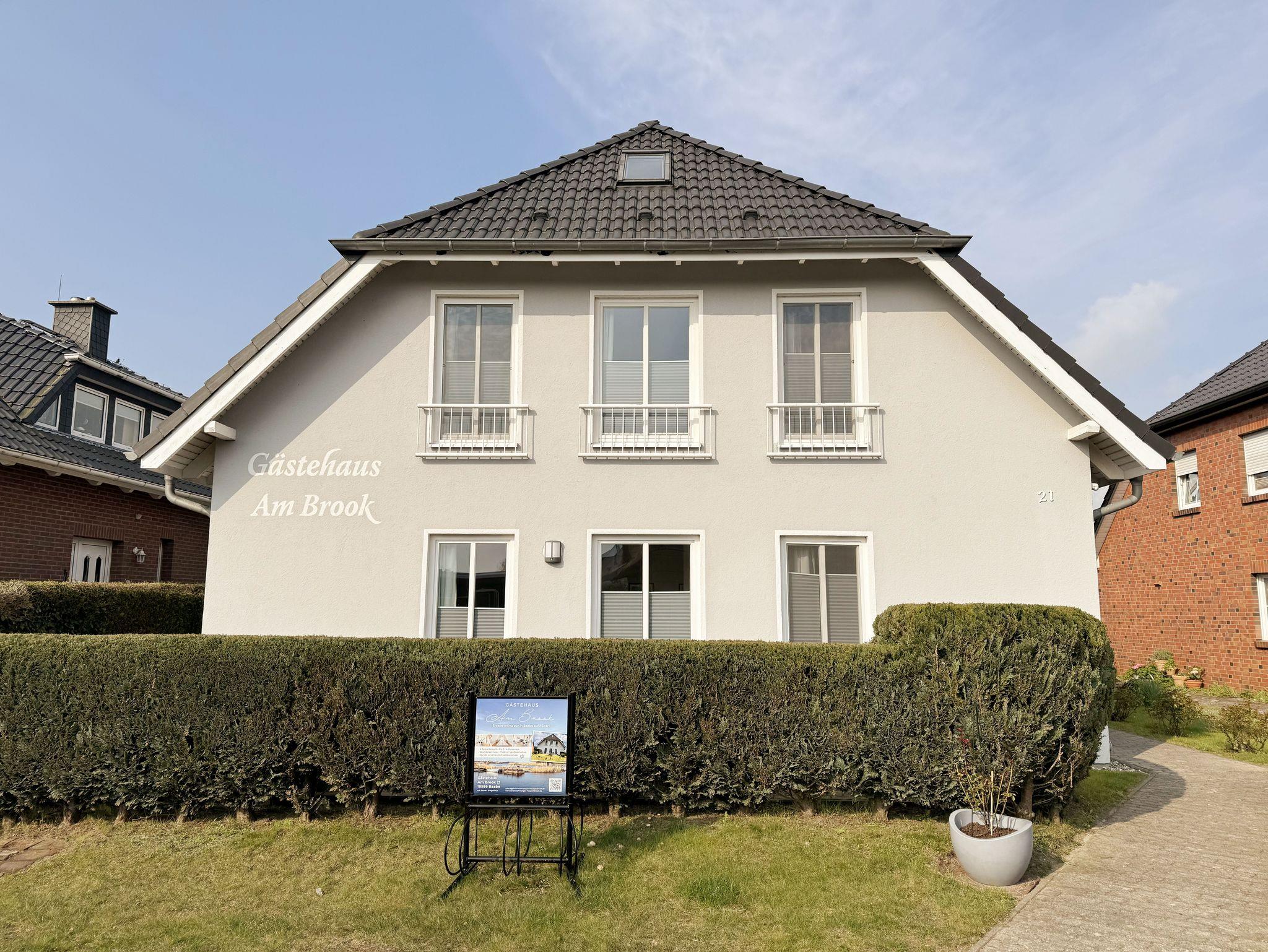 Das Gästehaus Am Brook ist ein inhabergeführtes, familien- & hundefreundliches Ferienhaus im Ostseebad Baabe. Es zeichnet sich besonders durch seine wunderschöne und ruhige Lage mit Weitblick aus, mit einem Weitblick auf den Hafen des Bollwerkes, den Selliner See und das Schloss Granitz. Das Gästehaus Am Brook besteht insgesamt aus fünf modern und liebevoll im skandinavischen Stil ausgestatteten Ferienwohnungen. Im Erdgeschoss befinden sich die Wohnungen 'Haubentaucher' und 'Hühnergott', die über einen kleinen, eigenen Gartenabschnitt mit Terrasse verfügen und ideal für 2 Personen sind. Im Obergeschoss finden Sie die Maisonette-Wohnungen 'Kranichloft' und 'Fährmanns Ausblick', die perfekt für Familien geeignet sind, da sie über zwei Schlafbereiche verfügen und die Wohnung Schwalbennest. In allen Wohnungen des Gästehauses können die Mieter den großen, eingezäunten und gepflegten Gemeinschaftsgarten von 2500 Quadratmetern nutzen. Der Garten ist mit Sitzgelegenheiten, einem Grillplatz und Strandkörben ausgestattet (verfügbar von April bis Oktober). Dazu finden Sie zusätzlich ein Dartboard und Boccia Kugeln vor. Das Gästehaus Am Brook ist der ideale Ausgangspunkt für einen ruhigen und entspannten Urlaub und dennoch in der Nähe aller Höhepunkte. Der Hafen von Baabe ist nur ca. 300 Meter entfernt und bietet diverse Schiffsausflüge. Der beliebte Rasende Roland ist immer zu hören und auch der Bahnhof ist zu Fuß erreichbar. In nur ca. 20 Gehminuten können Sie zum Hauptstrand von Baabe laufen oder Sie nutzen ganz einfach die Lütt Bahn, die kostenfrei und regelmäßig zum Strand und in den Ortskern fährt und nur ca. 100 Meter entfernt ist. Außerdem befindet sich nur ca. 100 Meter entfernt ein spannender Kinderspielplatz. Gönnen Sie sich eine Auszeit bei klarer und frischer Luft in Ihrem neuen Ankerplatz auf Rügen ? dem Gästehaus Am Brook.