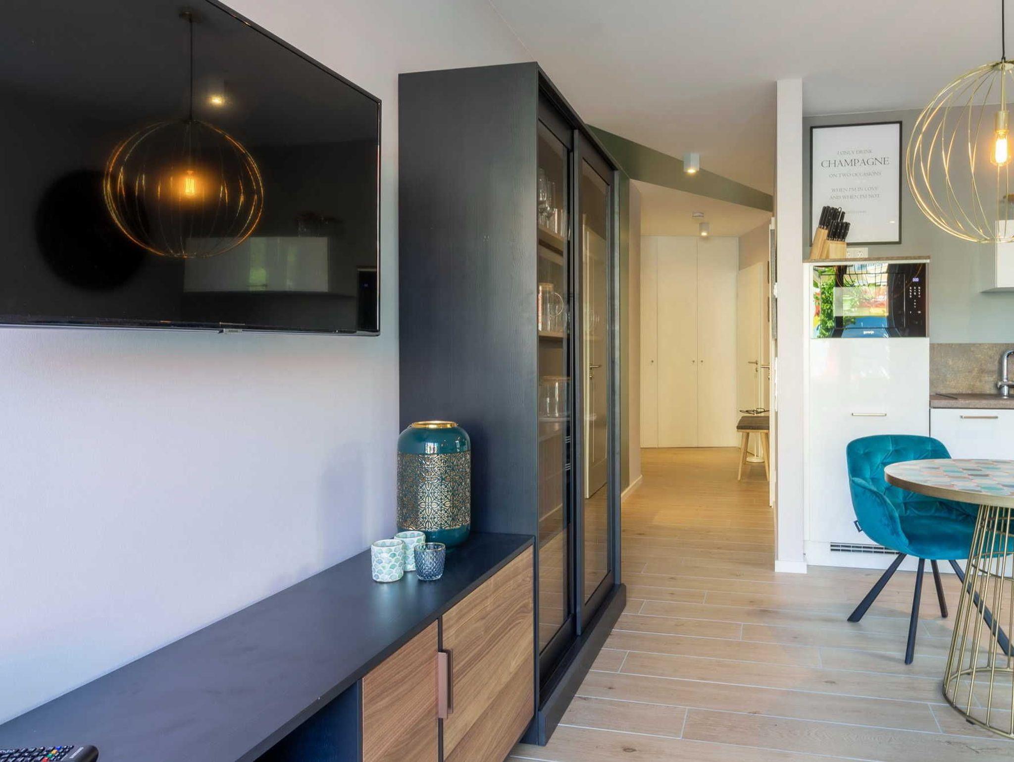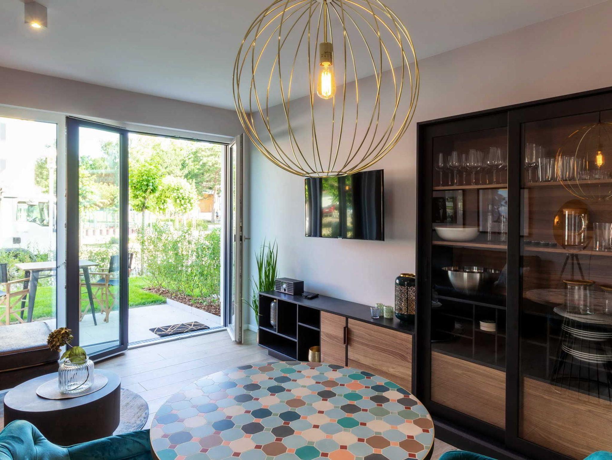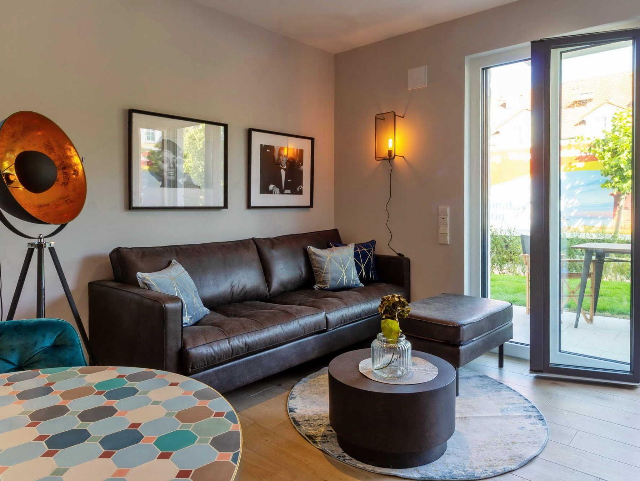 Die moderne 2-Zimmer-Wohnung für 2 Personen mit Designermöbeln lässt keine Wünsche offen: Bodentiefe Fenster, sorgsam ausgewähltes Mobiliar und exklusive Details sorgen für ein luxeriöses Ambiente. Hier stimmt einfach alles. In dem Wohnbereich befindet sich neben einer Sitzecke auch ein gemütliches Sofa aus schwarzem Recyling-Leder. Abgerundet wird die hochwertige Einrichtung durch die folgende technische Ausstattung: 43 großer Smart TV, DAB + Bluetooth / Spotify und WLAN-Radio.