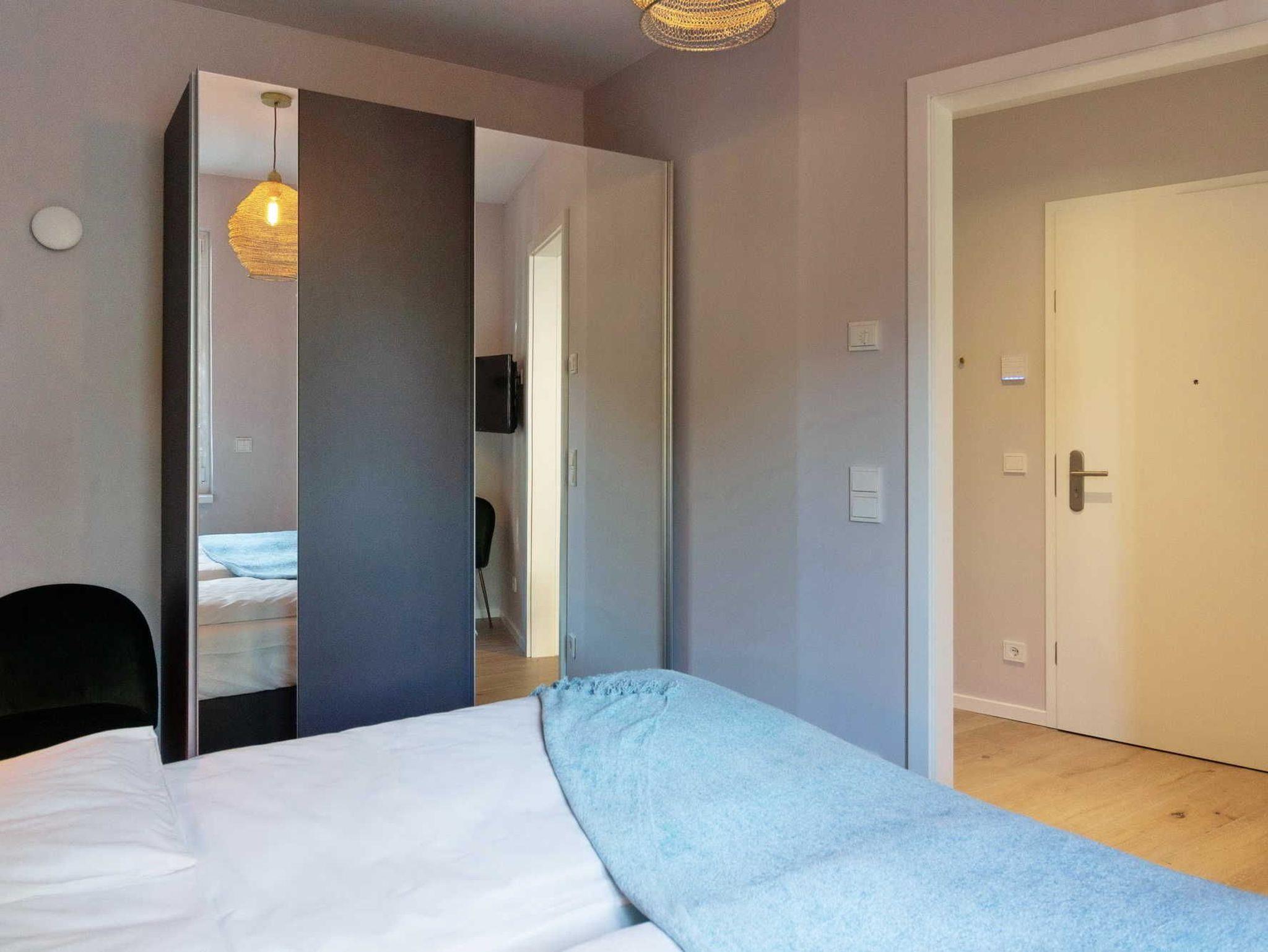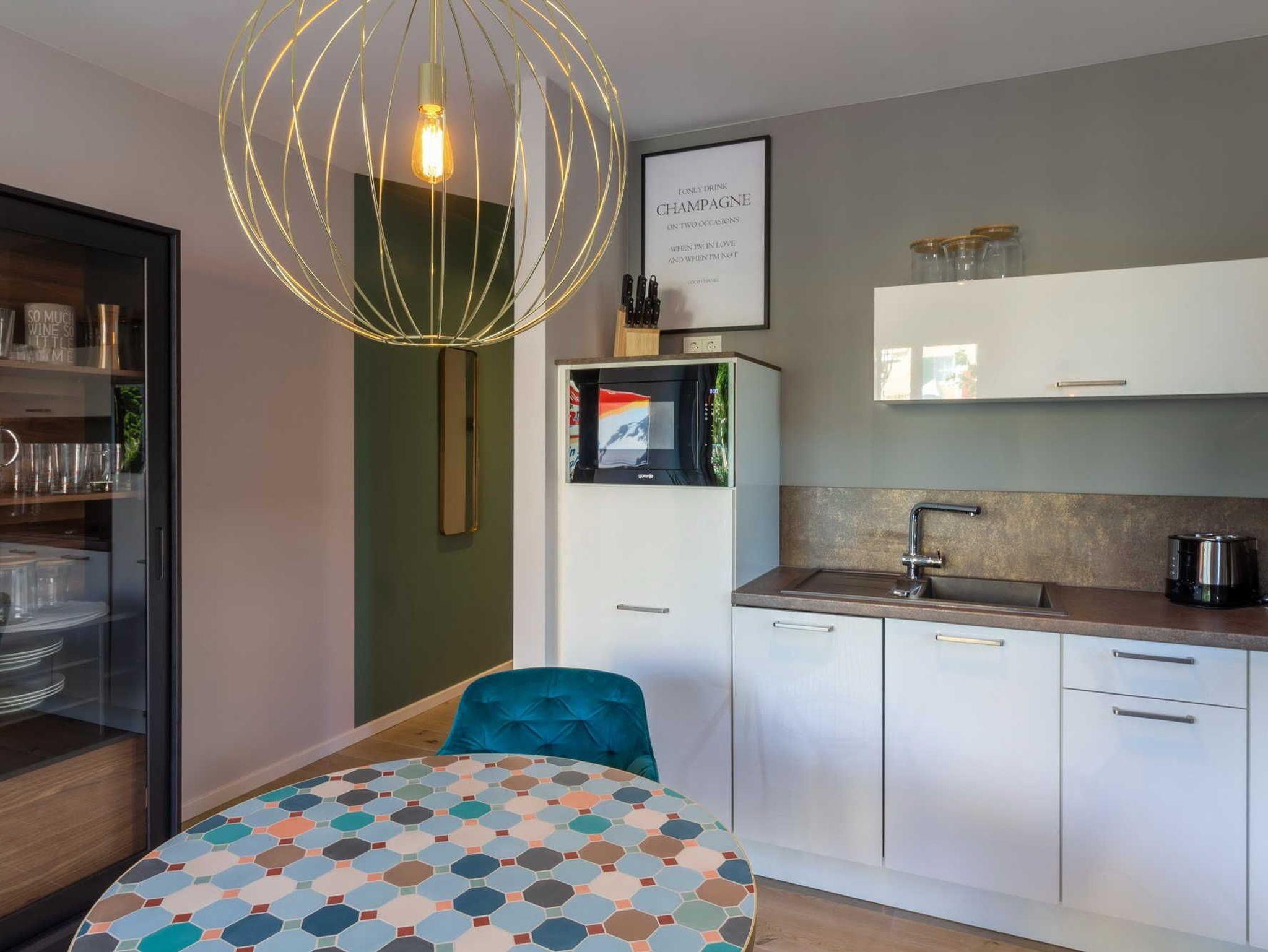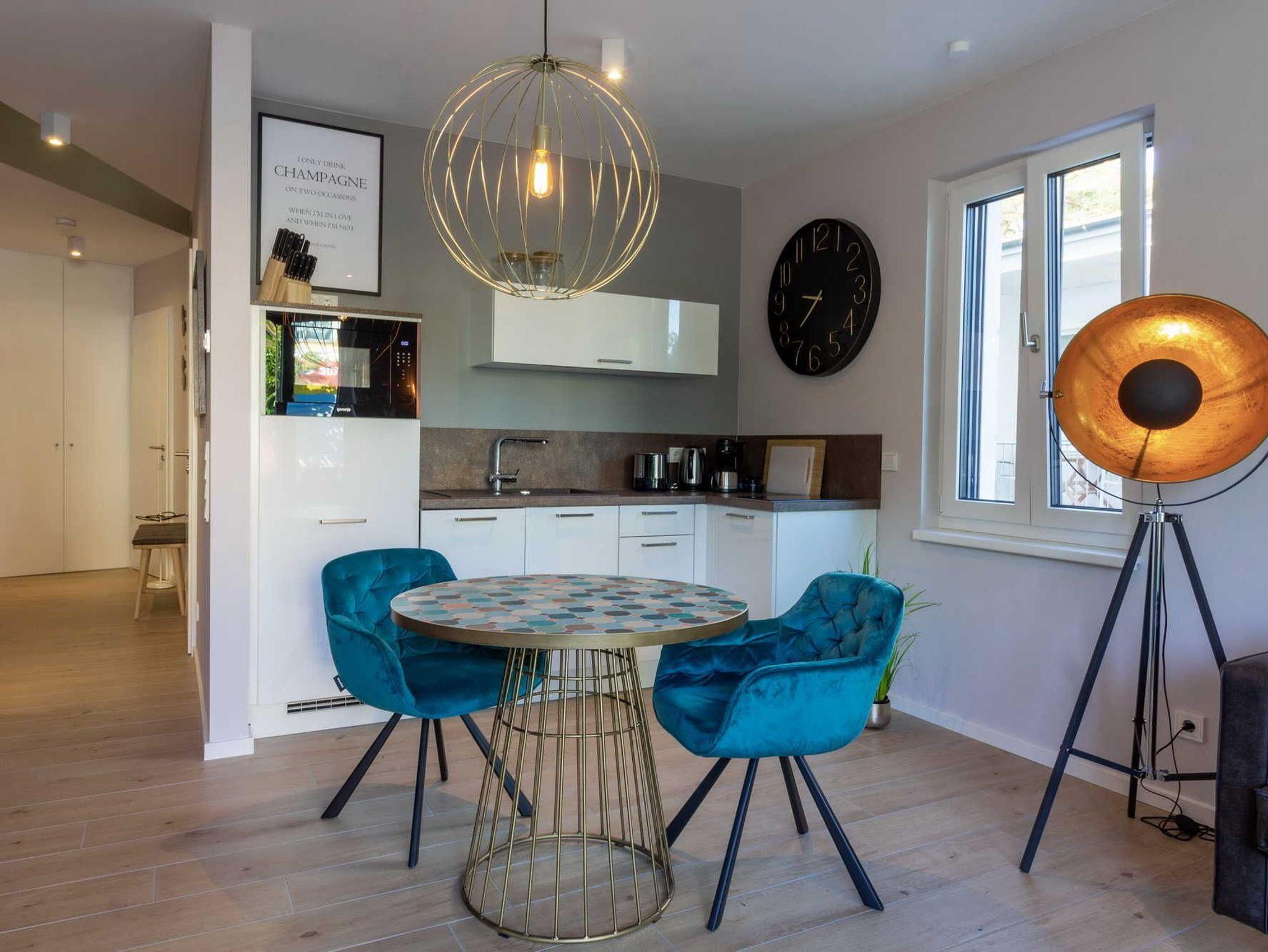 Die moderne 2-Zimmer-Wohnung für 2 Personen mit Designermöbeln lässt keine Wünsche offen: Bodentiefe Fenster, sorgsam ausgewähltes Mobiliar und exklusive Details sorgen für ein luxeriöses Ambiente. Hier stimmt einfach alles. In dem Wohnbereich befindet sich neben einer Sitzecke auch ein gemütliches Sofa aus schwarzem Recyling-Leder. Abgerundet wird die hochwertige Einrichtung durch die folgende technische Ausstattung: 43 großer Smart TV, DAB + Bluetooth / Spotify und WLAN-Radio.