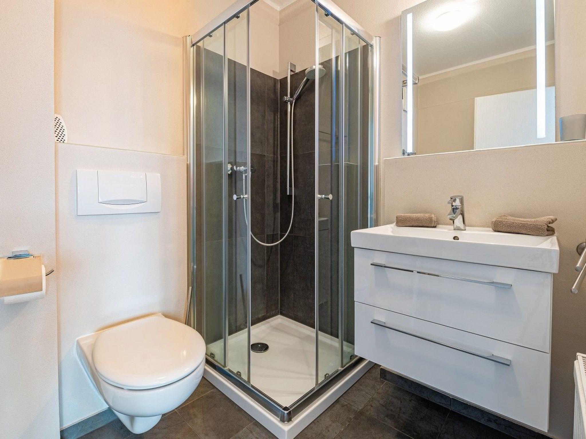 - Modern bathroom with shower (shallow entry), washbasin with vanity unit, WC, shelf and hairdryer