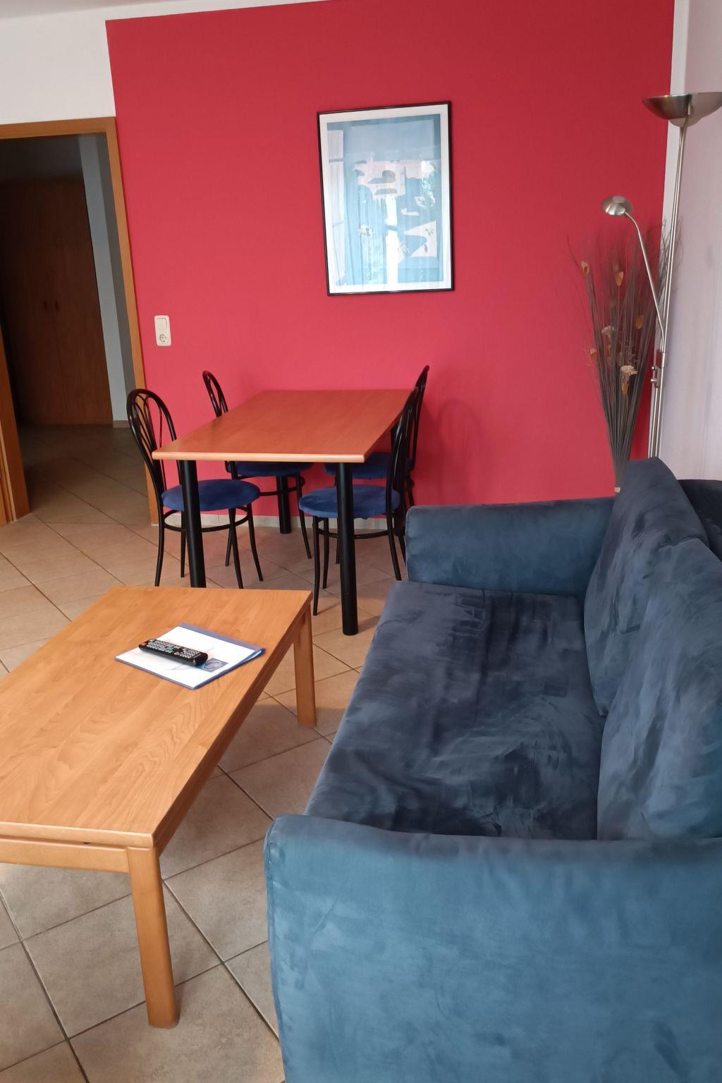 1 living area with pull-out, modern double sofa bed (150 x 200 cm), 2 armchairs, coffee table, sideboard, flat-screen TV, CD radio system and dining table with 4 chairs.