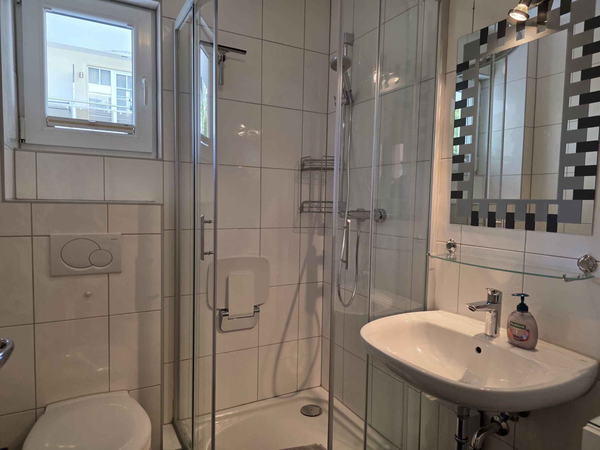 The bright and friendly bathroom has a round shower with glass doors, WC, washbasin and a side cabinet with plenty of space for your bathroom utensils. A hairdryer is also available. All windows have electric shutters.