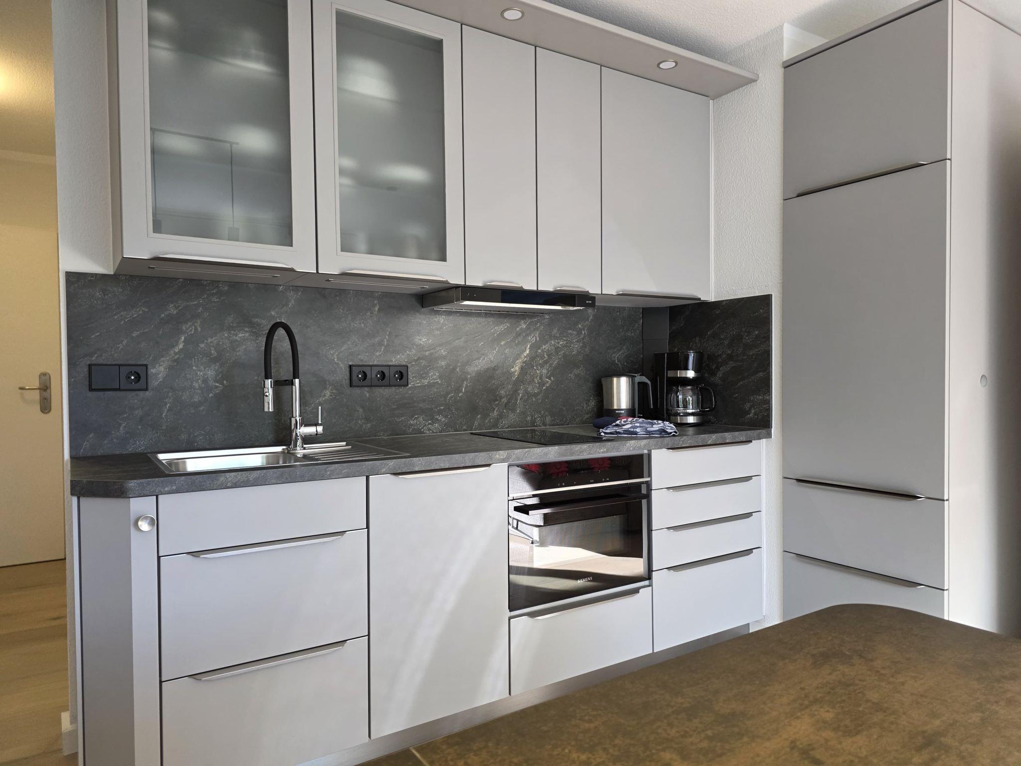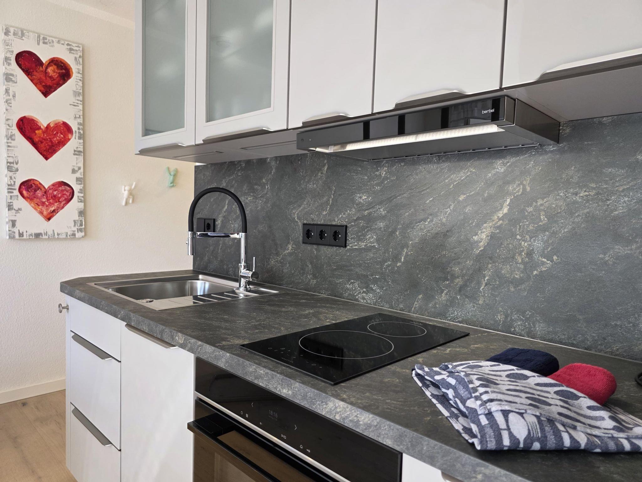 The large living area has a fitted kitchen with electric cooker, dishwasher, kettle, toaster, coffee machine, egg cooker, pots, crockery and cutlery (for 12 people). There is also a music system, cable TV and a DVD player. The dining area is furnished with a modern table, 4 comfortable chairs and a sideboard. WLAN is available. The cosy seating area with glass table, uplighter and large sofa invites you to relax. The light-flooded bedroom has a comfortable double bed, a large wardrobe with folding doors, a bookshelf and 2 large windows with access to the two terraces. The bright and cosy bathroom has a round shower with glass doors, WC, washbasin, glass shelf and a side cabinet with plenty of space for your bathroom utensils. A hairdryer is also available. All windows have electric shutters.