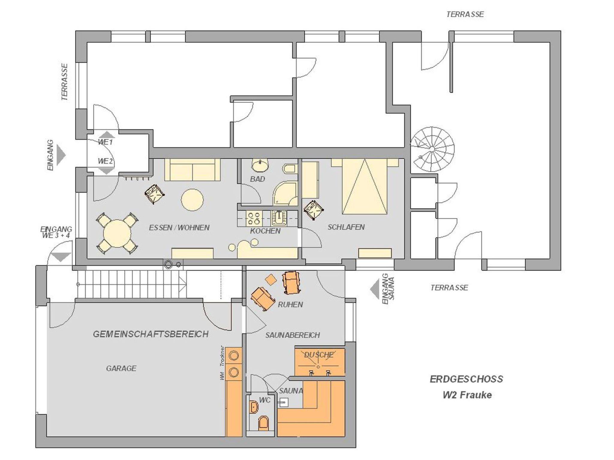 The outdoor area completes the holiday experience with an inviting terrace and a garden table that invites you to linger outside. The garden for communal use, lovingly planted with many pretty flowers, offers plenty of space for relaxation. Barbecue facilities and a children's playground with swings and seesaw are available for shared activities, while bicycles can be safely stored in the garage.