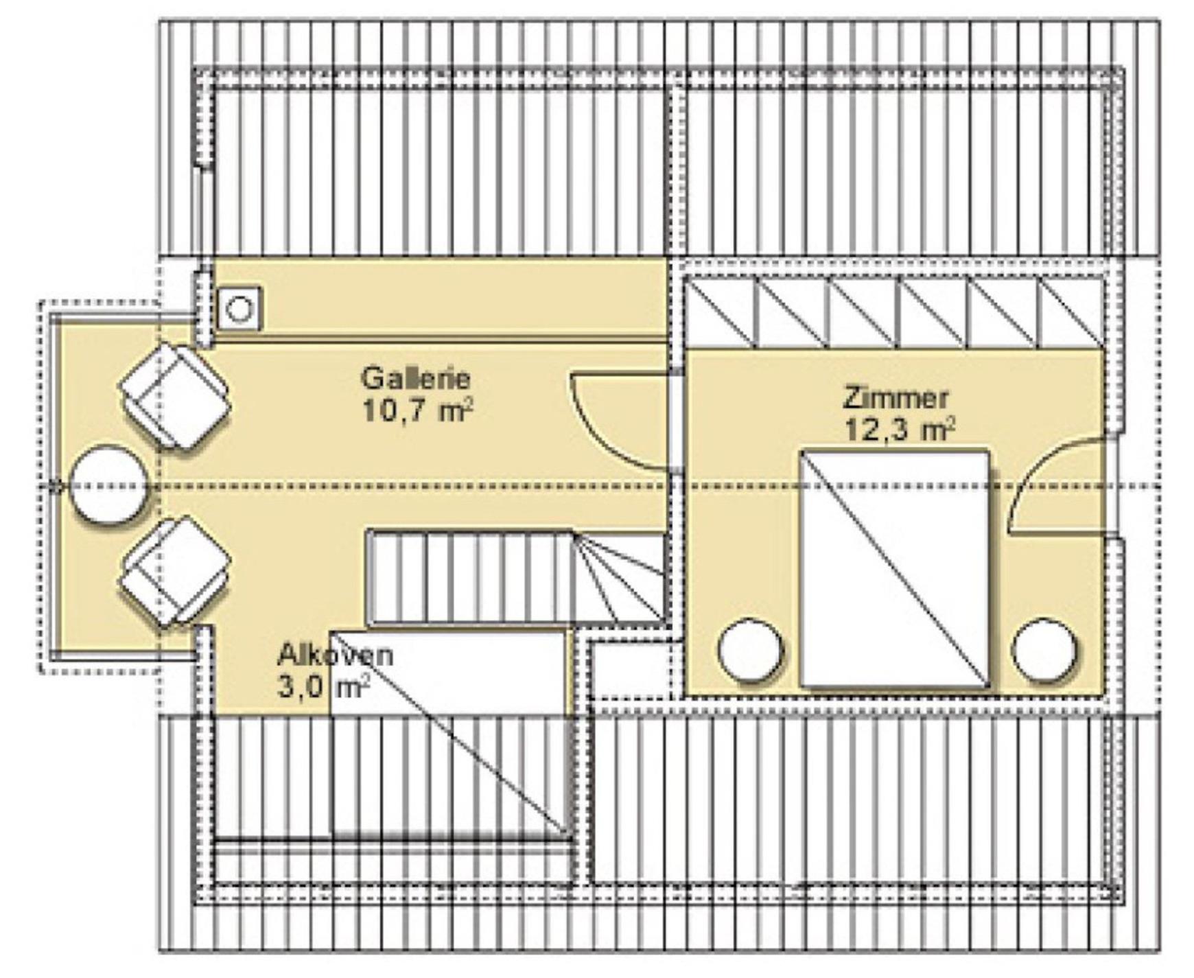 Auf der Galerie bietet ein Futonbett Schlafgelegenheit für 2 Personen (Matratze 140 x 200 cm).
