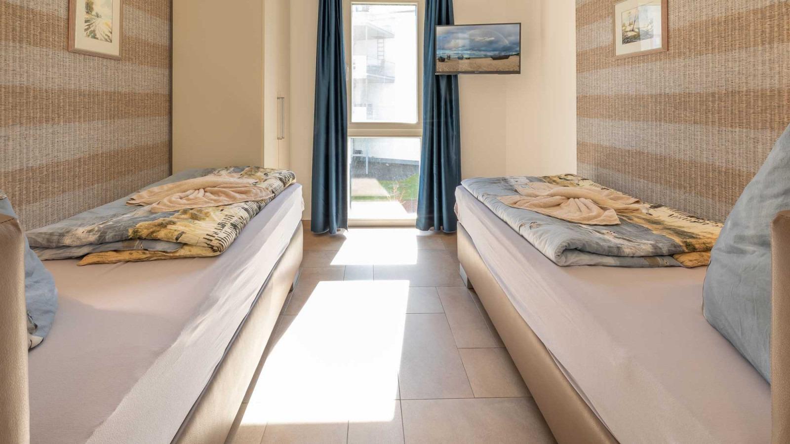 Insgesamt finden in der Wohnung 6 Personen Platz. Ein Schlafzimmer ist mit einem Doppelbett ausgestattet, das Andere mit zwei Einzelbetten. Zusätzlich befindet sich im Wohnbereich ein Schlafsofa für zwei weitere Personen. Alle Schlafräume sind mit TV-Geräten versehen.