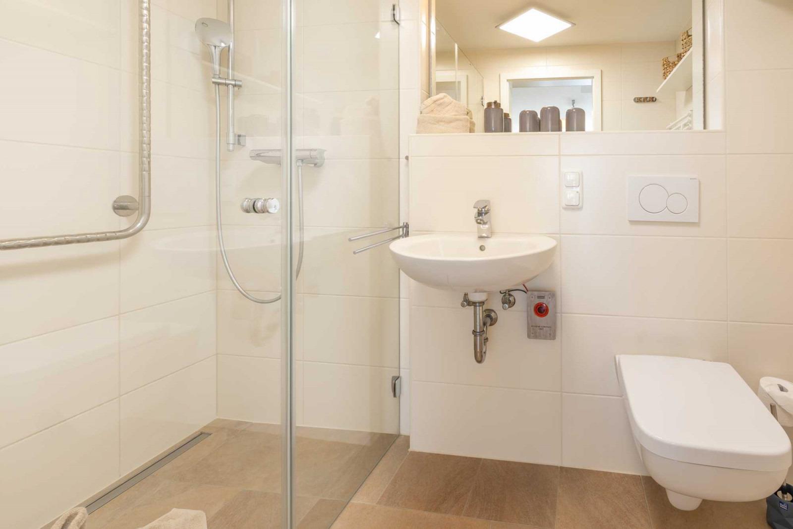 In der tollen Sauna können Sie wunderbar den Sorgen des Alltags entfliehen. Auch unsere Wellnessdusche ist ein echtes Highlight. Für Gäste mit einem körperlichen Handicap wurden im Gäste-WC Haltegriffe in der Dusche und für das WC-Becken installiert. Außerdem steht ein Duschhocker zur Verfügung.