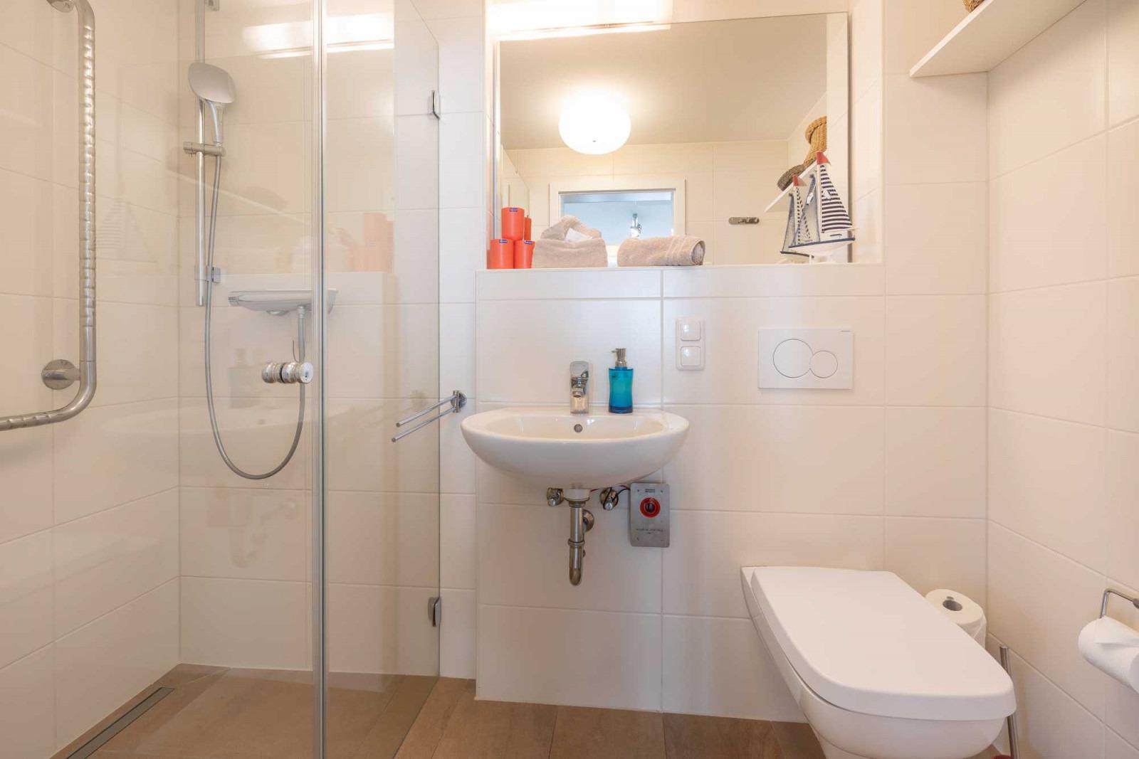 Für Gäste mit einem körperlichen Handicap wurden im Gäste-WC Haltegriffe in der Dusche und für das WC-Becken installiert. Außerdem steht ein Duschhocker zur Verfügung.