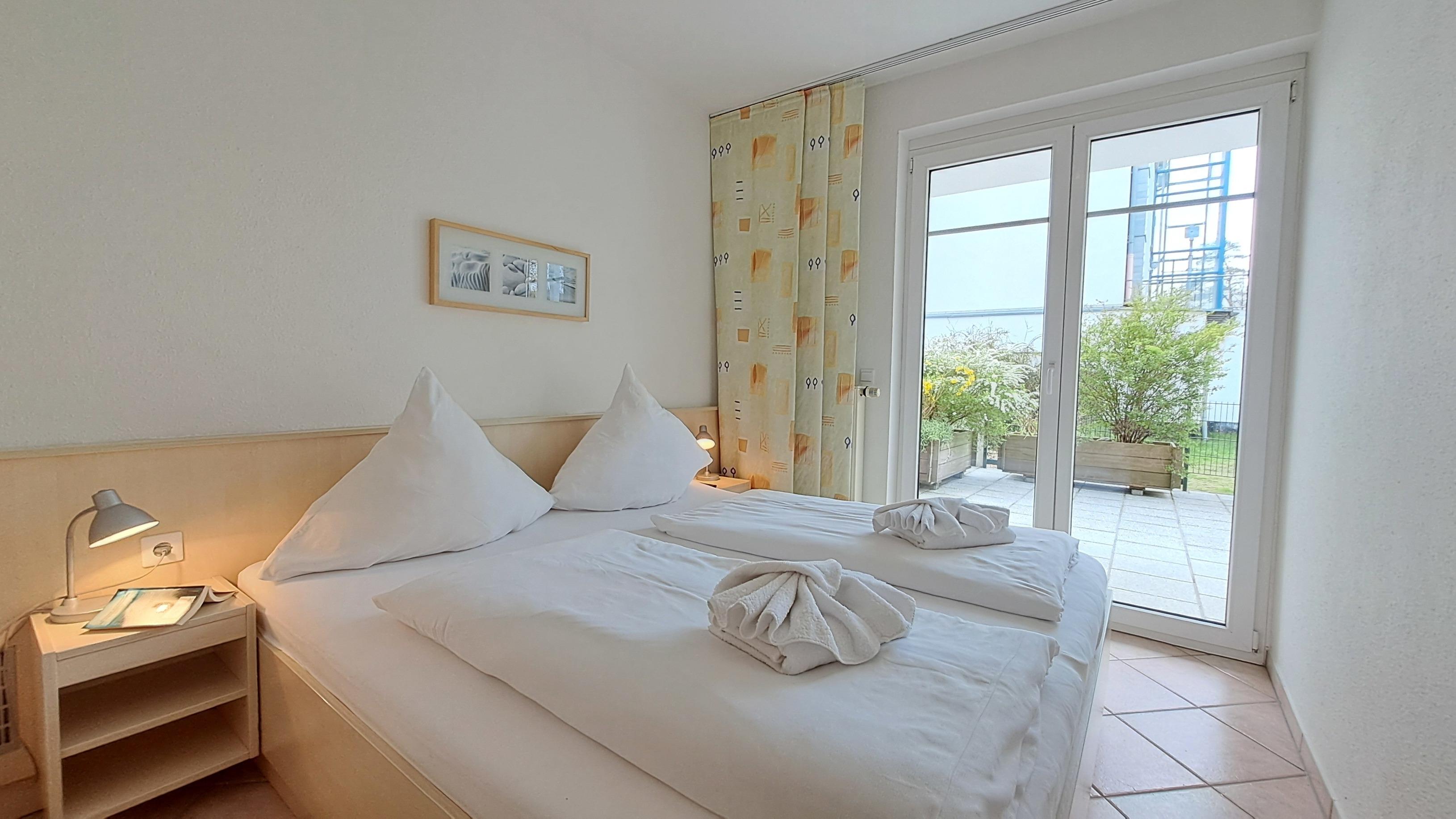 - mit Doppelbett (180x200 cm), Kleiderschrank, Flachbild-TV, Nachttischen, Leselampen und extra Zugang zur Terrasse