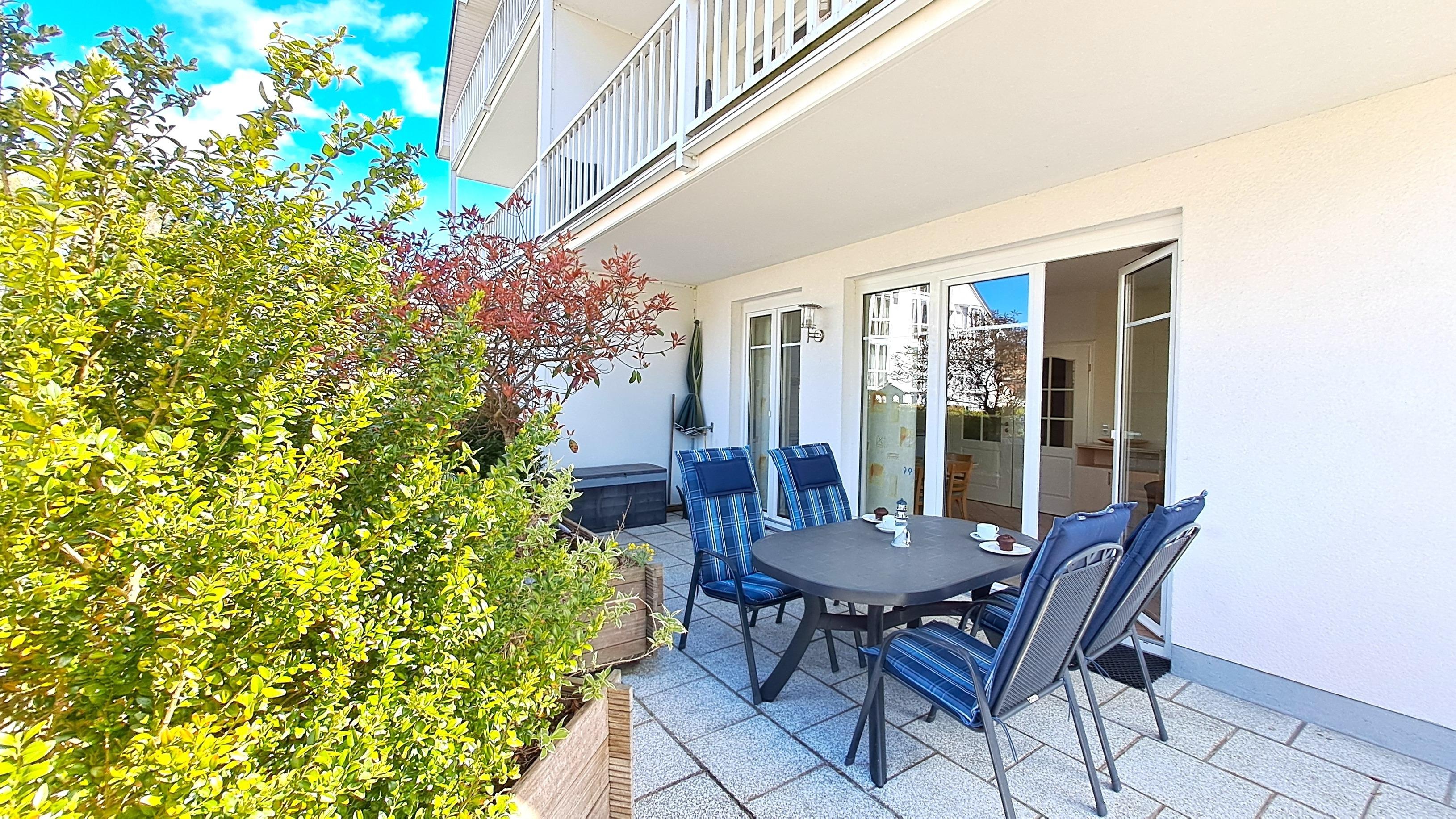 Highlight ist die knapp 80 qm große Terrasse zu zwei Seiten. Dort genießen Sie am Nachmittag/Abend die Sonne oder machen es sich auf den Sonnenliegen bequem. Viele bepflanzte Kübel sorgen für ein besonderes Ambiente. In den Sommermonaten werden die Pflanzen regelmäßig von einem beauftragten Dienstleistungsunternehmen bewässert. Auf der Terrasse können auch die Fahrräder abgestellt werden (überdacht durch darüber liegende Balkone). Grillen ist aus Respekt den anderen Gästen gegenüber nicht gestattet.