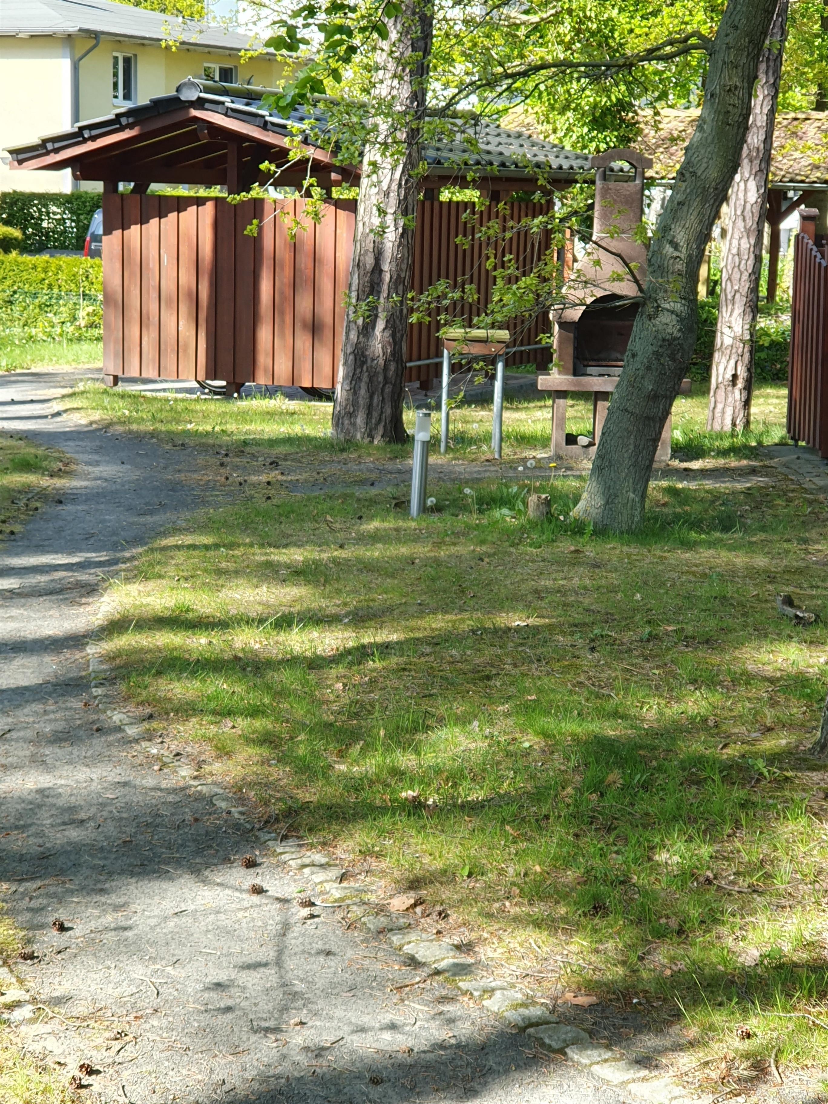 Das großzügige Waldgrundstück bietet einen Fahrradunterstellplatz, Grillplatz und Sitzgelegenheiten.