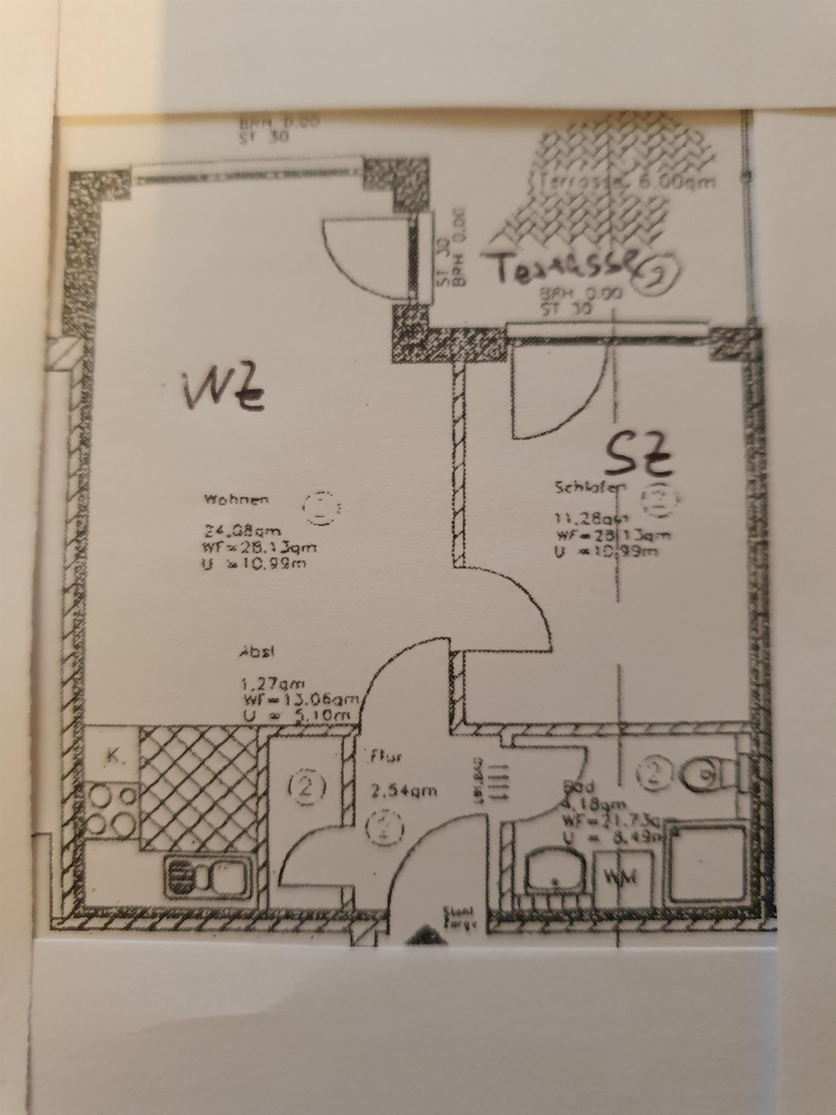 Gemütliche Zwei-Raum Wohnung mit Terrasse, einem Schlafzimmer, Wohnzimmer mit Küche, Flur und Duschbad.