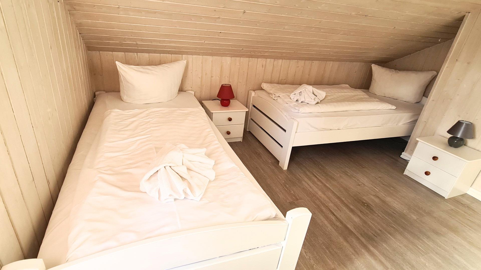 Durch den Wohnbereich gelangen Sie in die erste Etage, wo Sie eine hübsche Galerie mit Sitzgruppe erwartet. Hier finden Sie auch das zweite Schlafzimmer mit Doppelbett sowie das dritte Schlafzimmer mit 2-Einzelbetten – ideal für Familien oder Freunde. Ein Gästebad/WC sorgt für zusätzlichen Komfort im Obergeschoss.