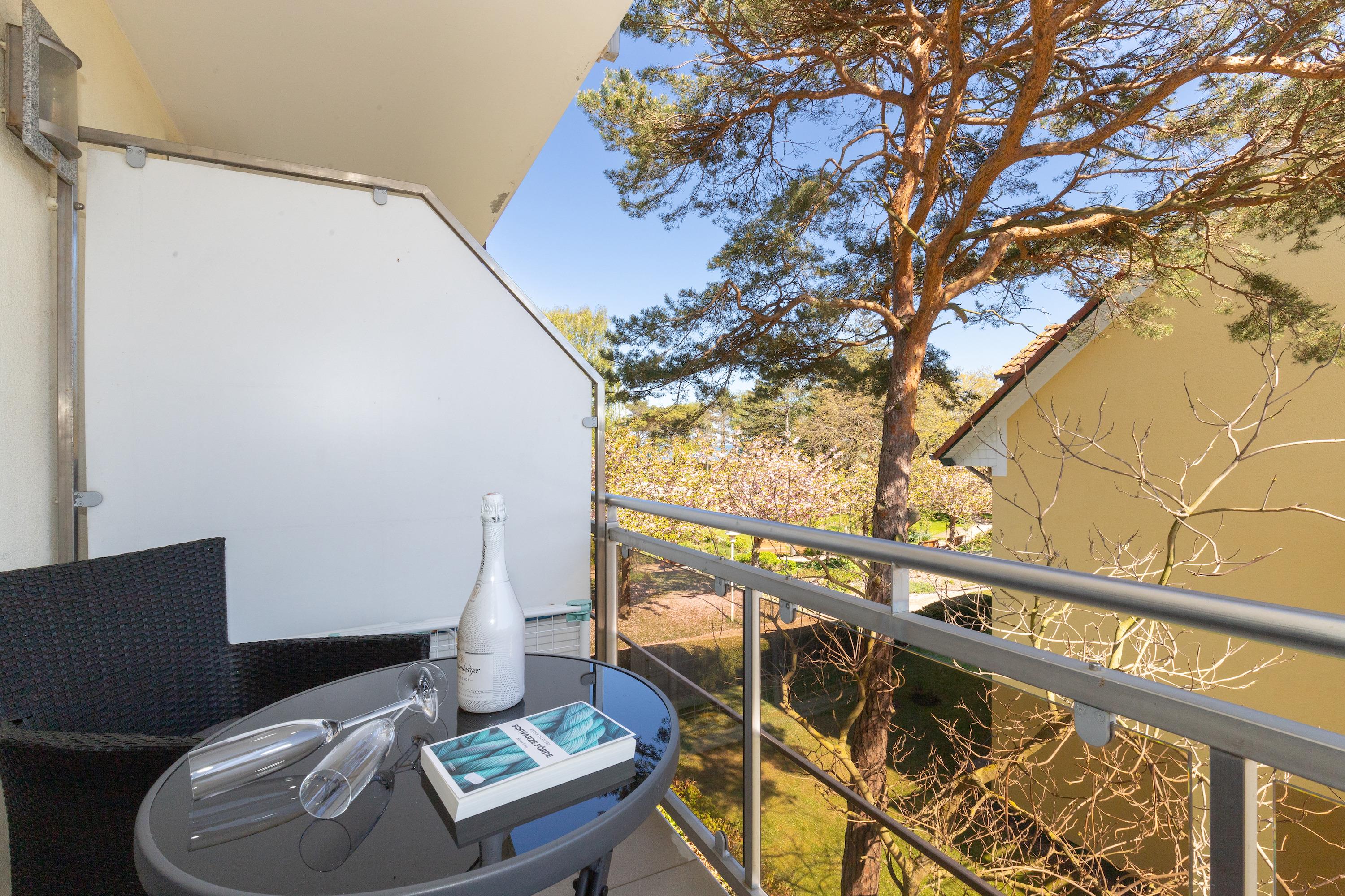 Die Wohnung verfügt über ein separates Schlafzimmer, ein modernes Badezimmer sowie einen stilvoll eingerichteten Wohn- und Essbereich. Ein besonderes Highlight ist der eigene Balkon mit seitlichem Meerblick – perfekt, um die frische Ostseeluft zu genießen und den Tag entspannt ausklingen zu lassen. Der feinsandige Strand ist nur ca. 150 Meter entfernt und fußläufig erreichbar.