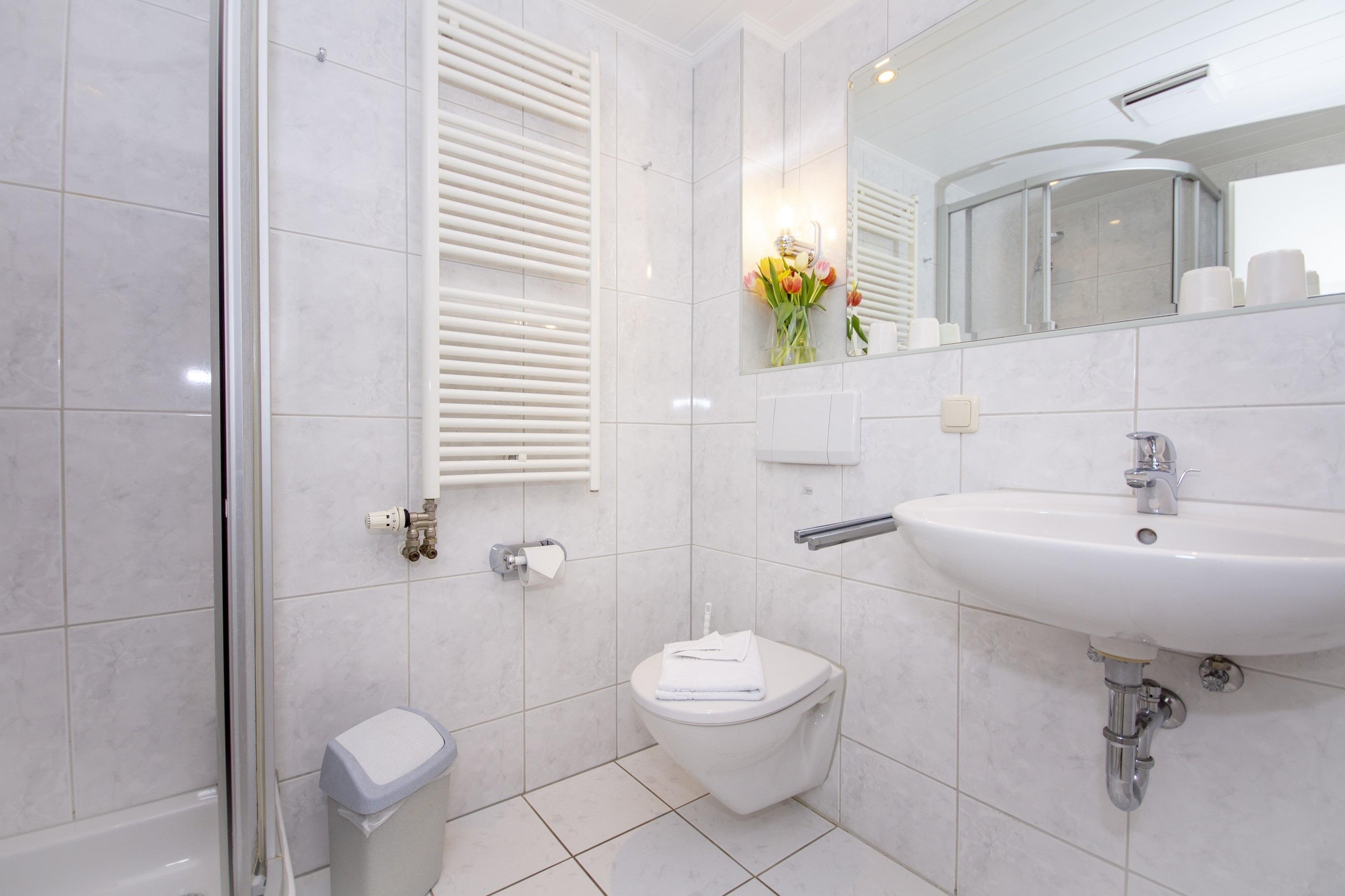 Das hell erleuchtete Badezimmer verfügt über eine Dusche, WC und einen Waschtisch mit großen Spiegel.