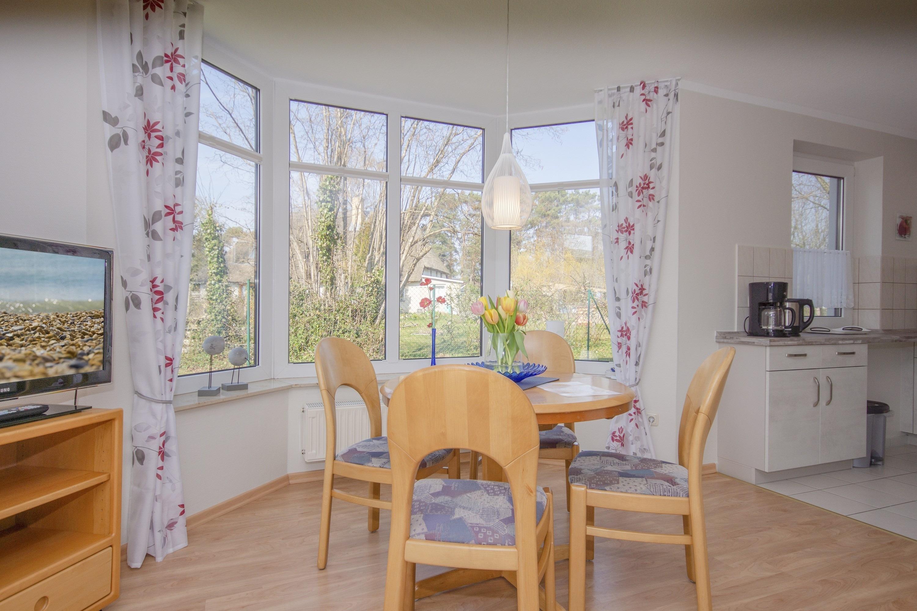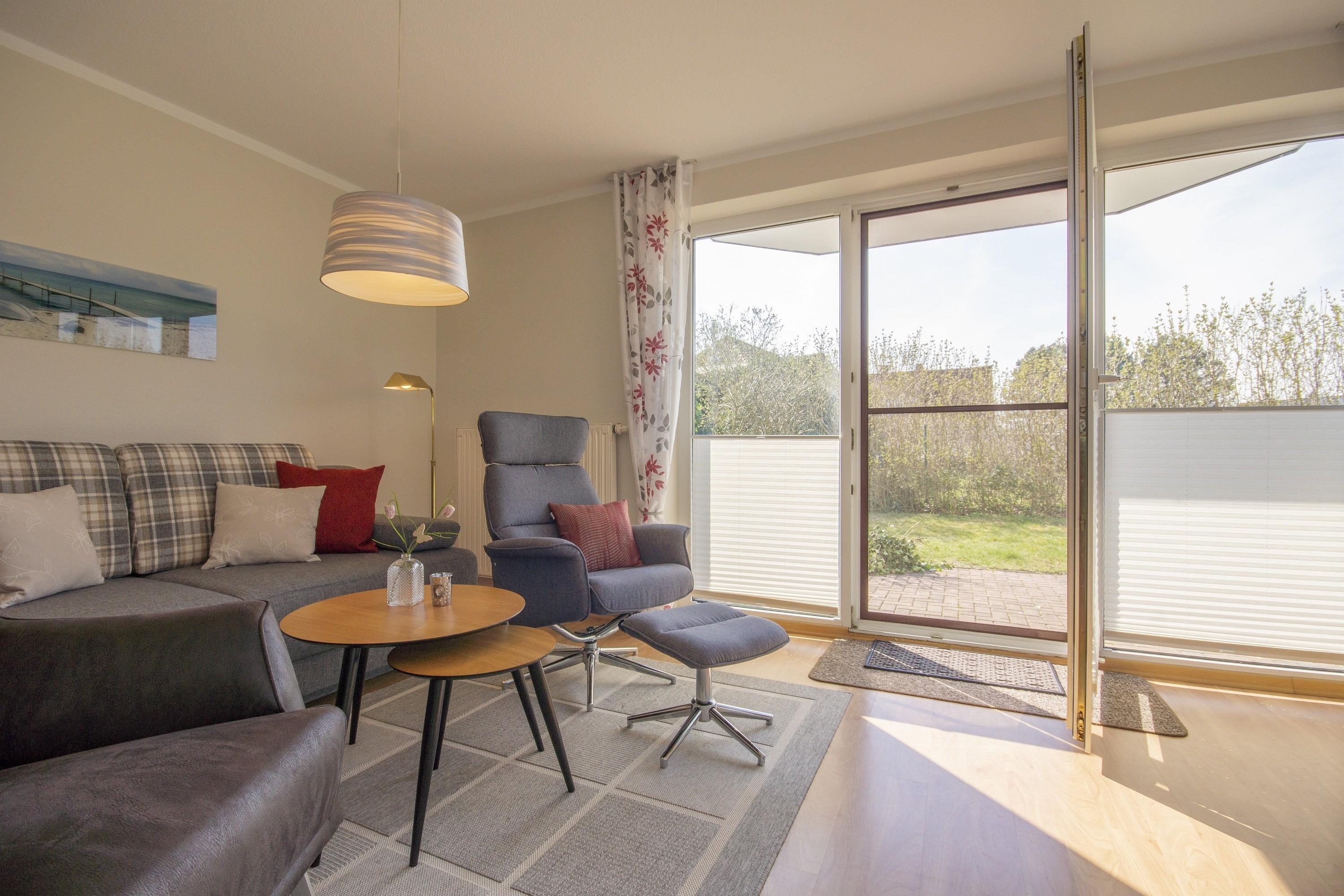 Der freundliche Wohnbereich bietet einen gemütlichen Ort zum Ausklingen der erlebnisreichen Tage auf Rügen. Hier befindet sich neben einem modernen Flachbild-TV auch eine außerordentlich komfortable Couchgarnitur, die eine optionale Aufbettung für bis zu 2 weitere Personen darstellt. Von diesem Zimmer erhalten Sie einen direkten Zugang auf die eigene Terrasse, welche mit komfortablen Gartenmöbeln ausgestattet ist. Hier können Sie nach einem erlebnisreichen Strandtag in Baabe einfach mal die Seele baumeln lassen.