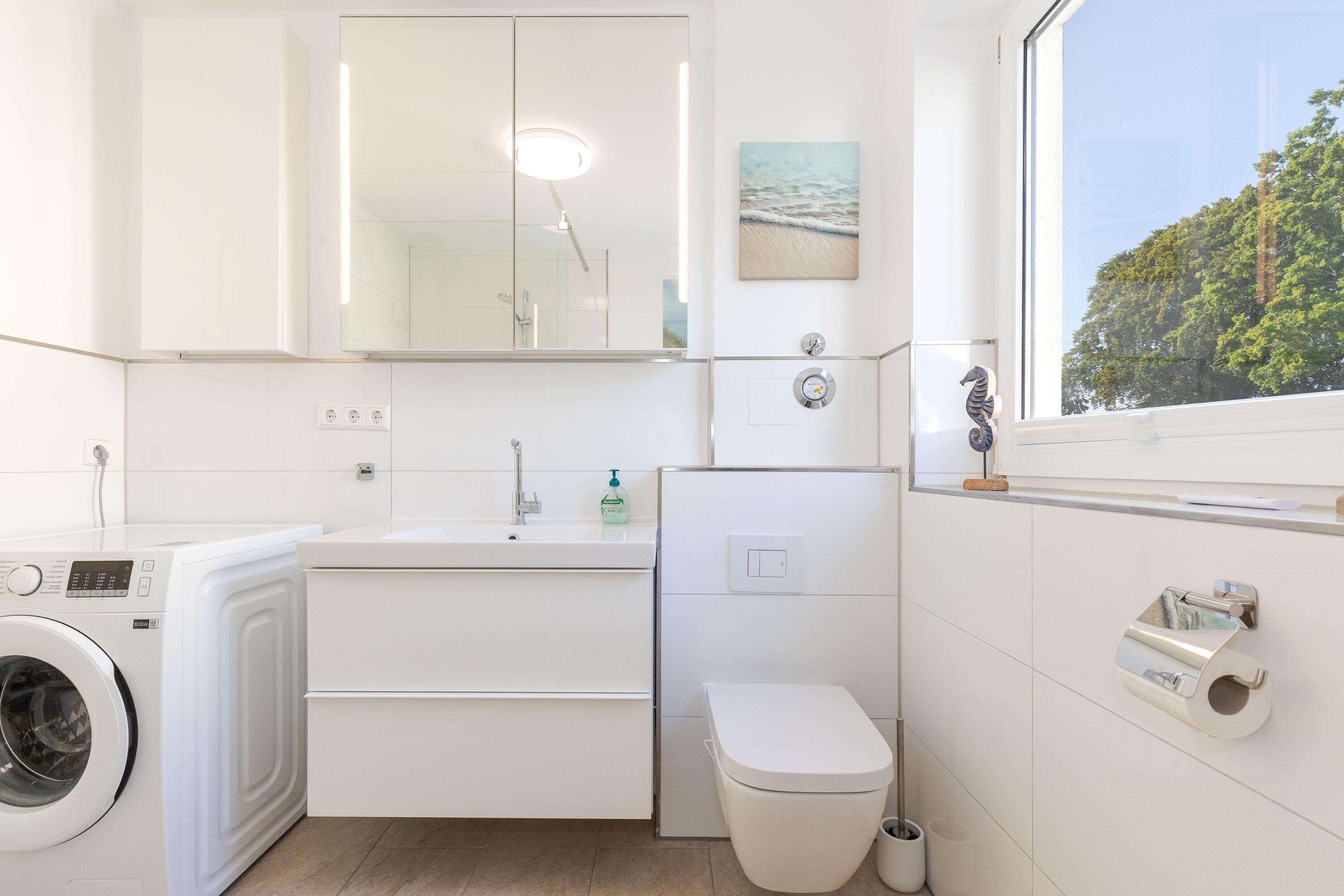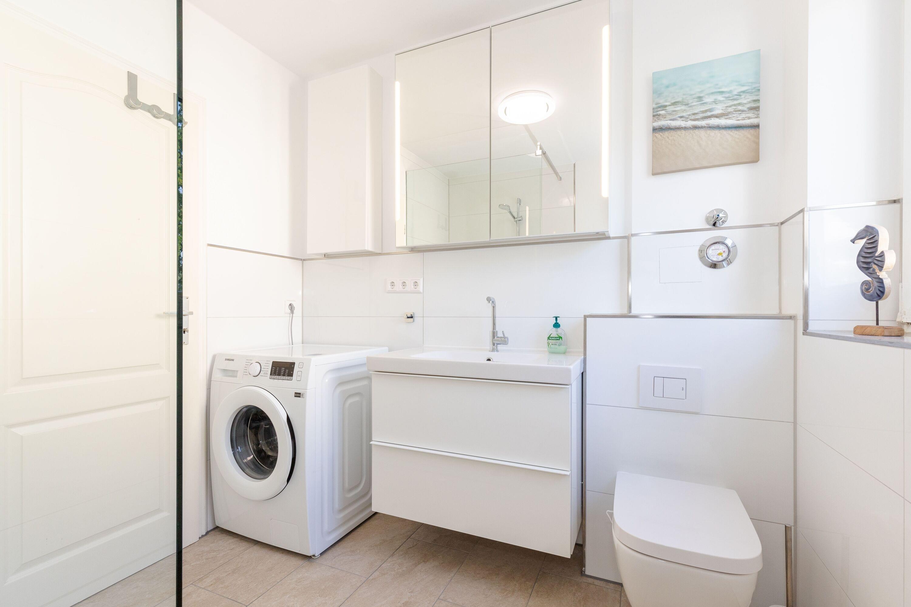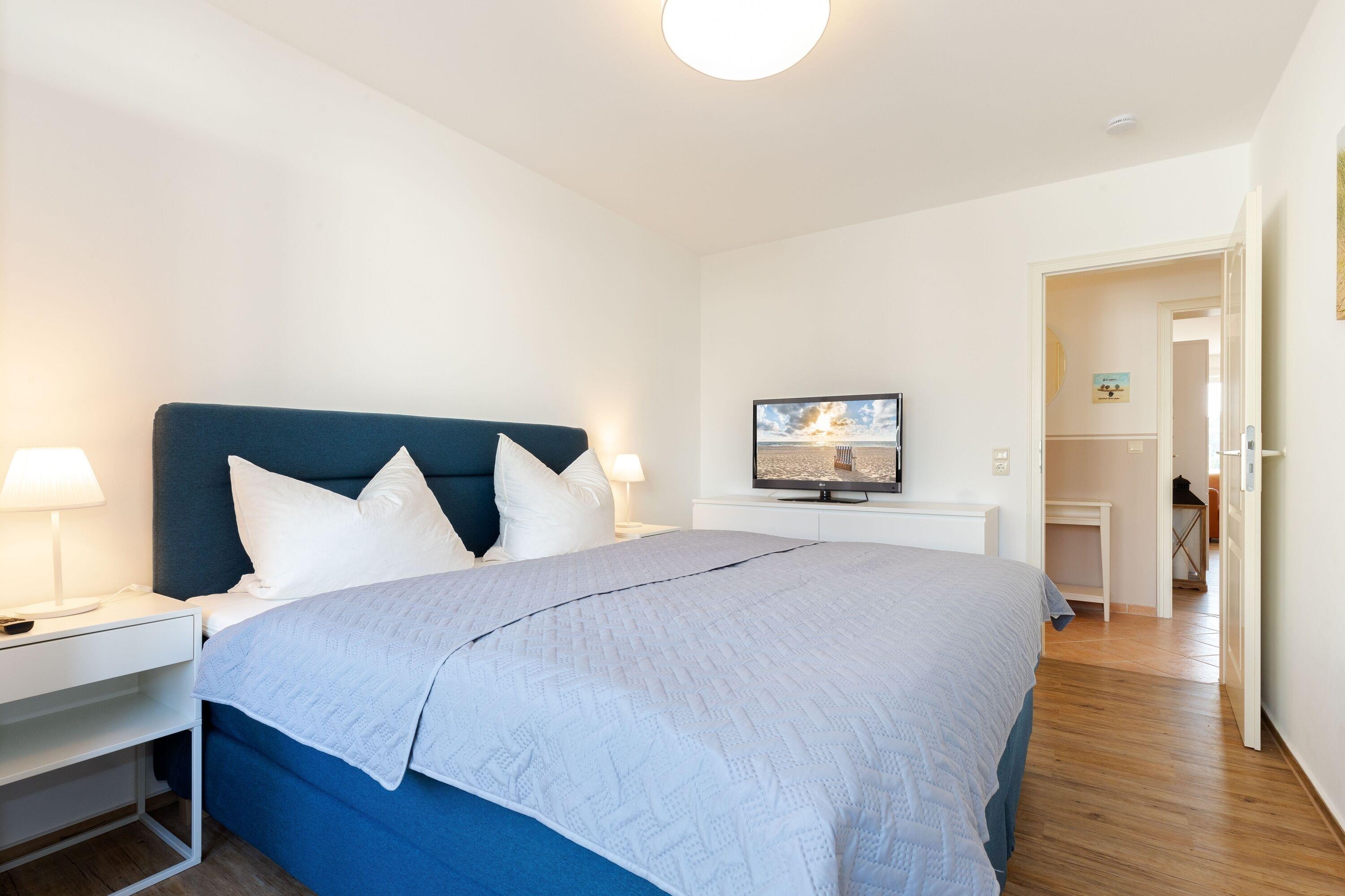 In der Küche bieten Herd mit Cerankochfeld, Backofen und Kühlschrank Gelegenheit zum kochen. Das Wohnzimmer lädt zum verweilen ein. Dort befindet sich eine Schlafcouch, ein Flachbild TV und eine Stereoanlage. Nach einem ausgiebigen Tag am Strand kann man sich in der ebenerdigen Dusche im Badezimmer frisch machen. Im Boxspringbett im Schlafzimmer kann man es sich, dank Leselampe, mit einem Buch gemütlich machen, oder einfach Fernsehen schauen. Der Kleiderschrank bietet Platz, um seine Sachen zu verstauen. Im zweiten Schlafzimmer befindet sich ebenso ein Doppel Boxspringbett mit TV und Kleiderschrank. In beiden Schlafräumen gibt es Verdunklungsmöglichkeiten.
