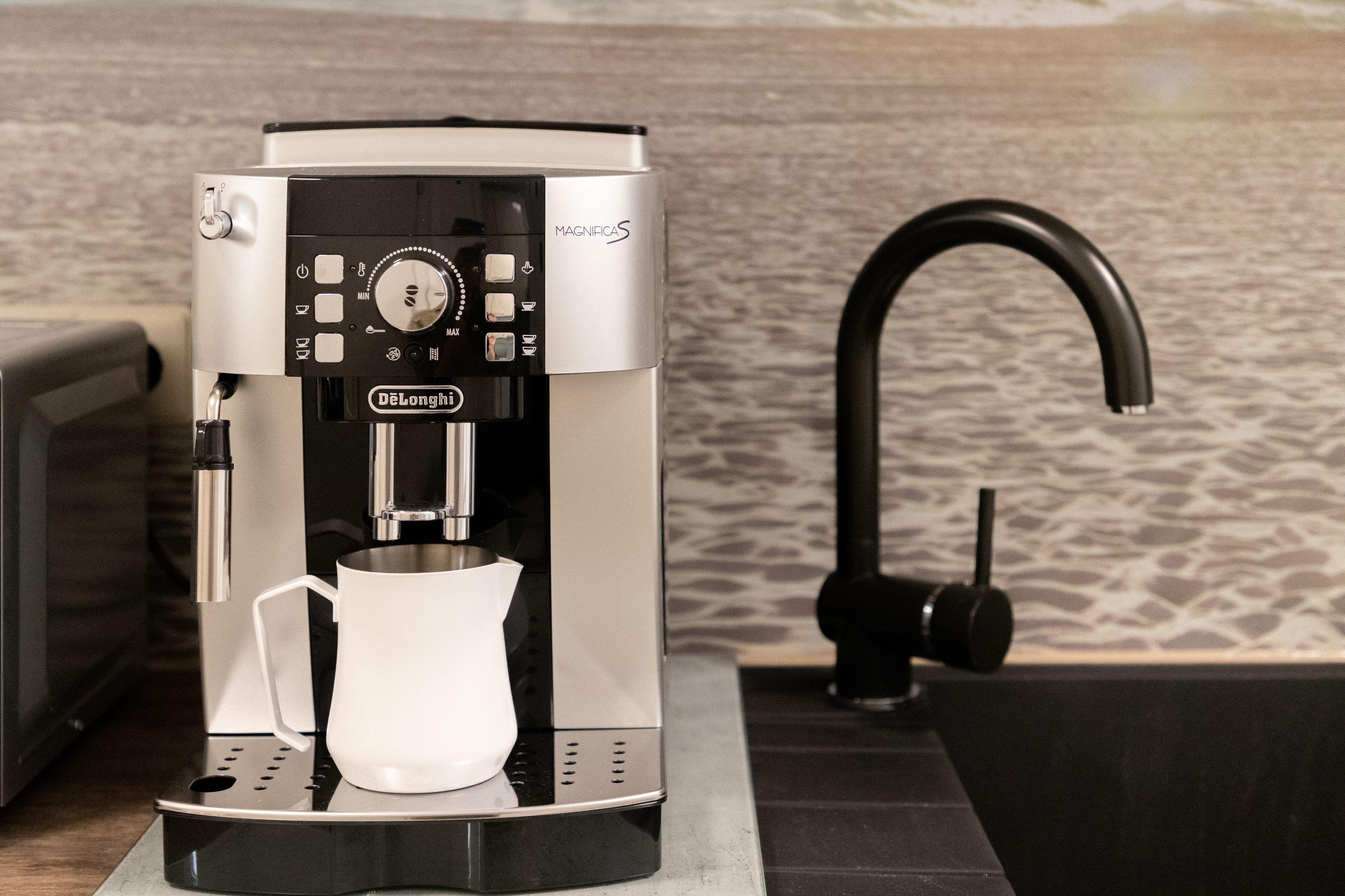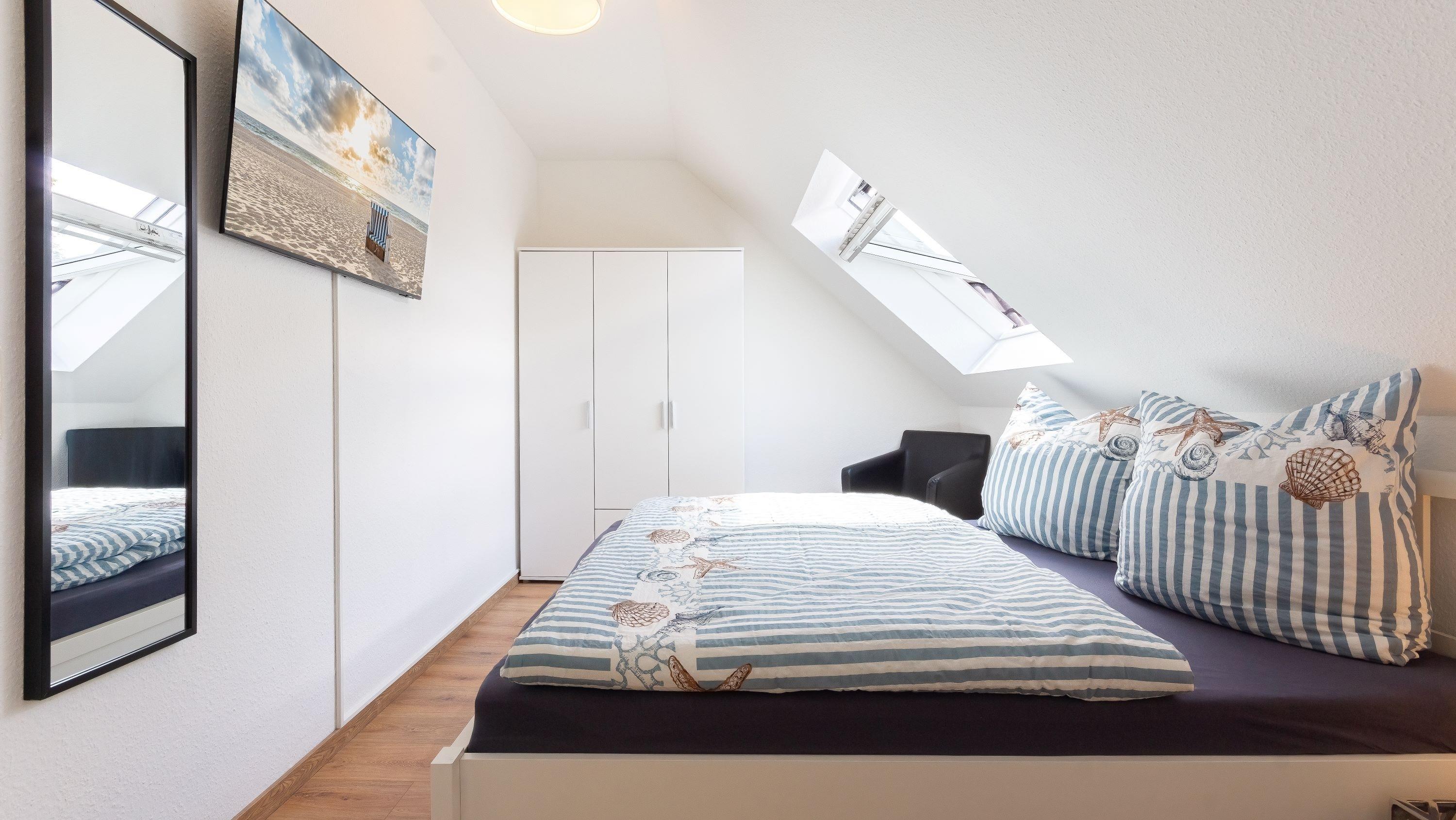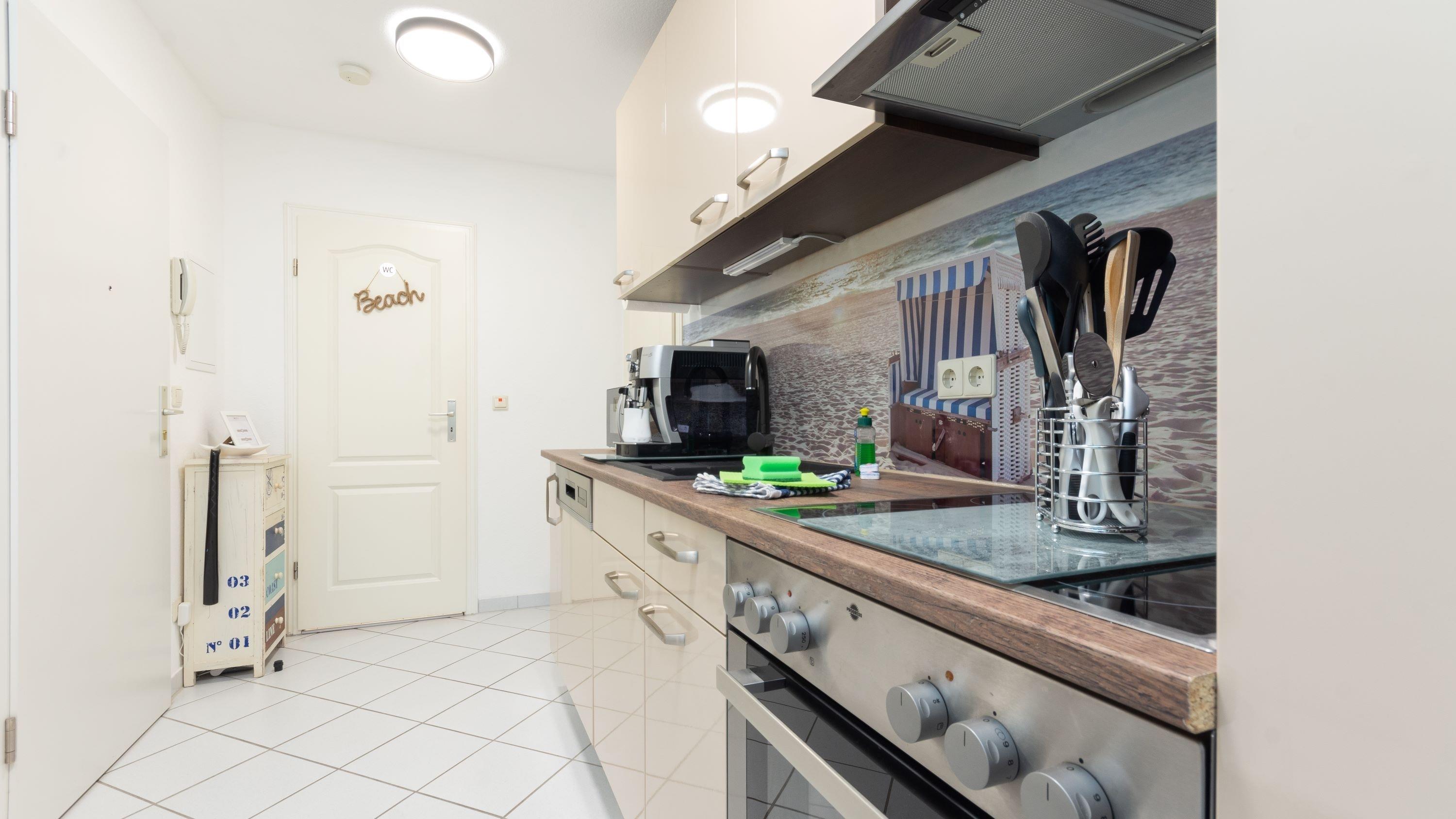 Die separate Küche ist mit allem ausgestattet, was es für den effizienten Selbstversorger benötigt; ein Ceranfeld, ein Backofen, eine Geschirrspülmaschine, ein Kühlschrank mit Gefrierfach und ein Kaffeevollautomat. Auch allerlei Küchenutensilien und Kleingeräte finden hier ihren Platz. Direkt daneben, führt ein schmaler Treppenaufgang, direkt in den Schlafbereich mit einem bequemen Doppelbett und einem weiteren Smart TV.