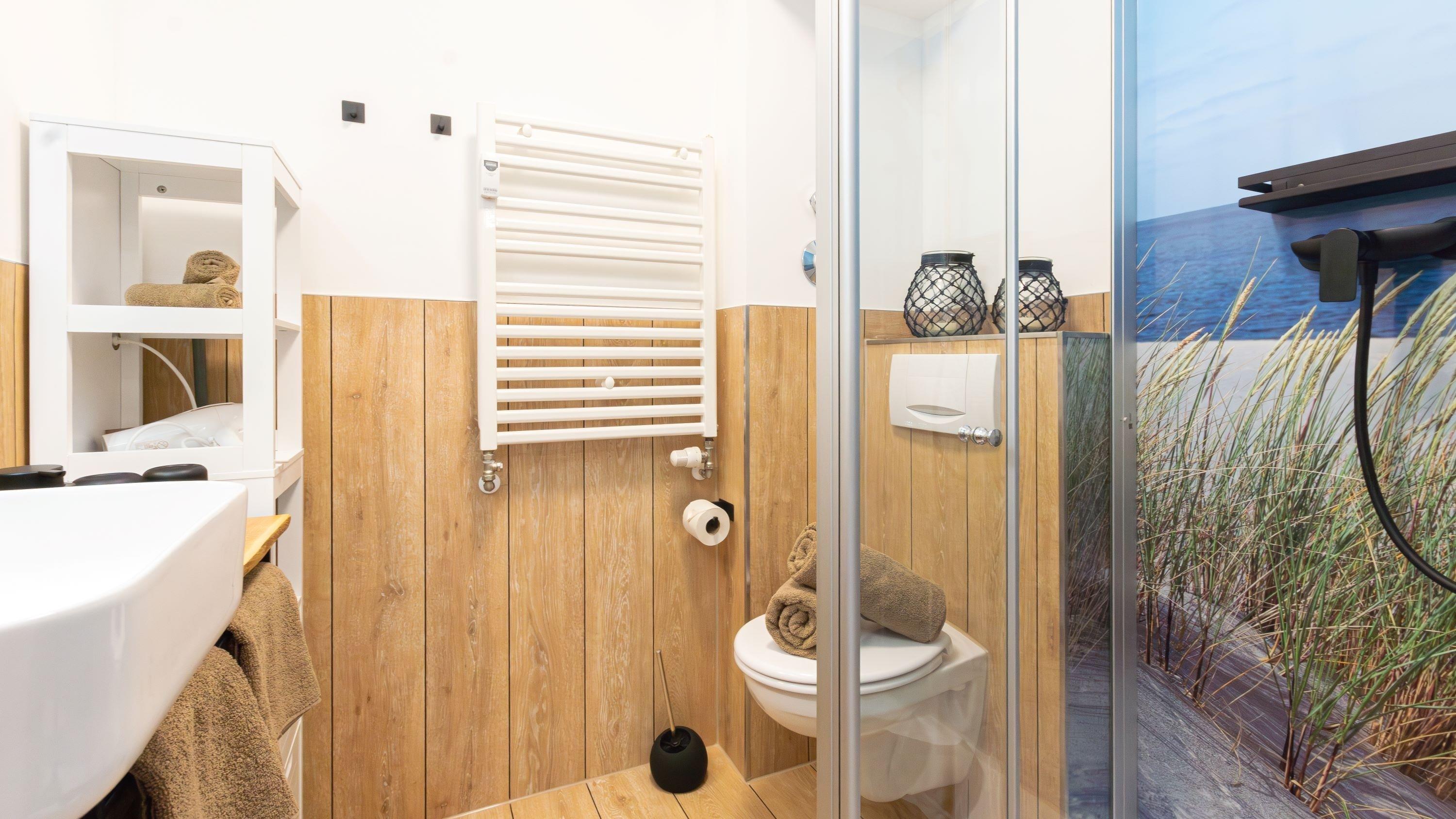 Das moderne Badezimmer bietet eine Glasdusche mit Strandfeeling, ein WC und ein Waschbecken mit Spiegel.
