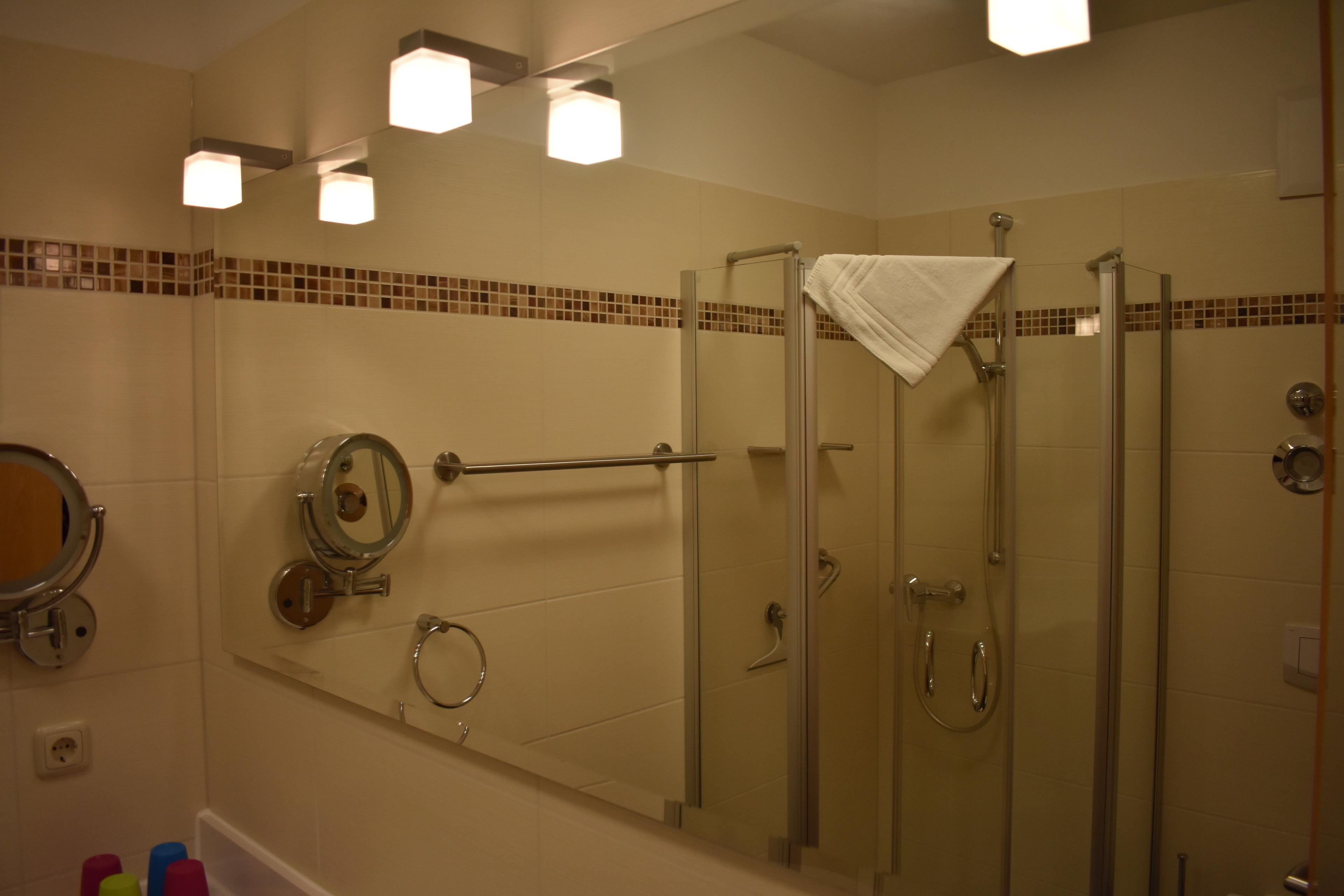 Das Wohnzimmer mit abgeteilter Küchenzeile und Esstisch ist sehr großzügig geschnitten. Es beinhaltet eine gemütliche Polstergarnitur und einen großen TV. Die großen Terrassenfenster bieten einen schönen Blick ins Grüne. Die 12qm große Terrasse die zur Wohnung gehört, ist modernen Terrassenmöbel und einem Strandkorb ausgestattet. Das Schlafzimmer ist mit einem großen Doppelbett und einem zweiten TV ausgerüstet. Das Bad ist modern und zweckmäßig hergerichtet.
