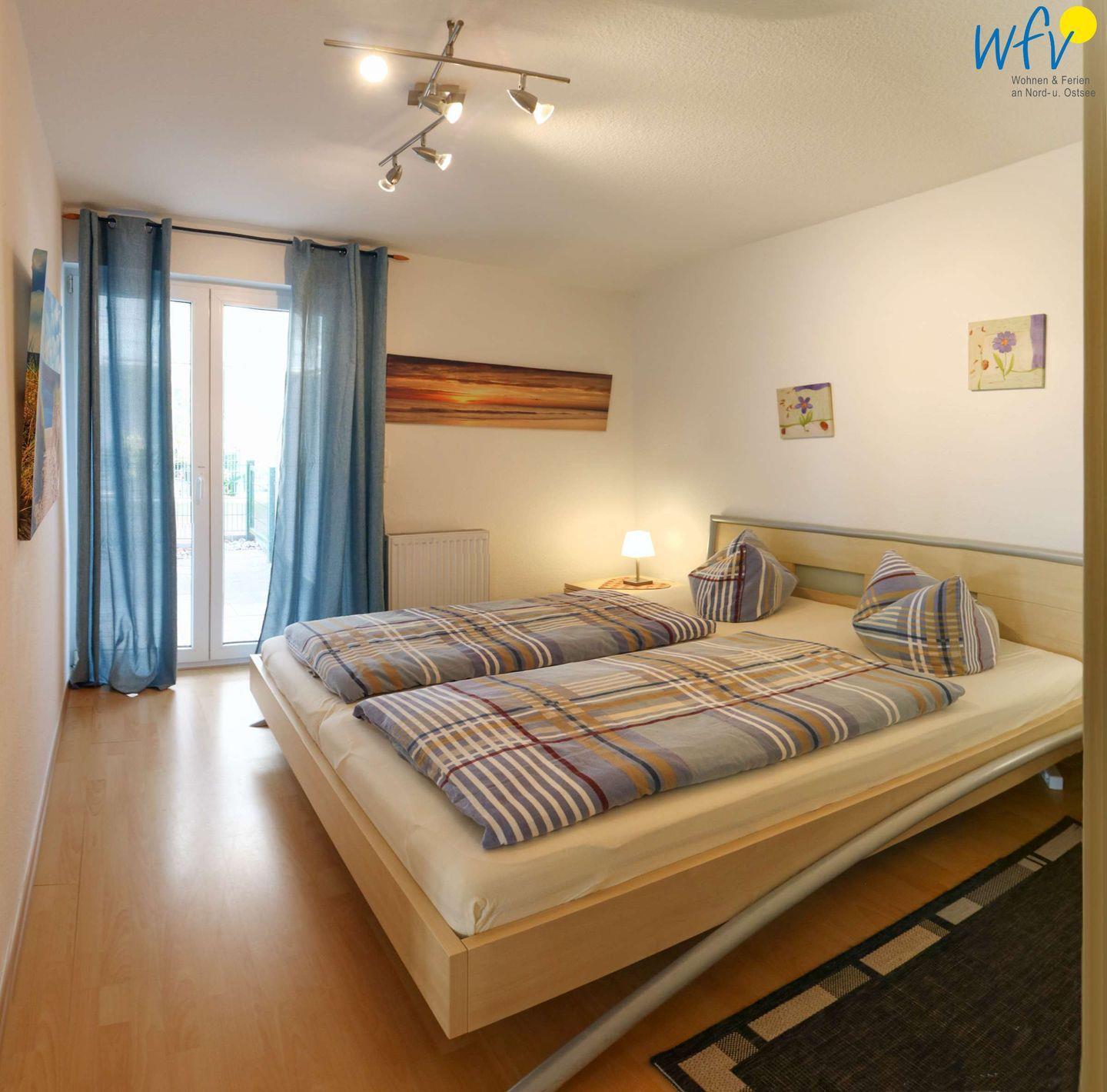 Das separate Schlafzimmer ist mit einem bequemen Doppelbett (1,80 x 2 m) und einem geräumigen Kleiderschrank ausgestattet. Schlafmöglichkeiten für zwei weitere Personen bestehen durch das ausziehbare Schlafsofa im Wohnzimmer (1,60 x 1,80 m).