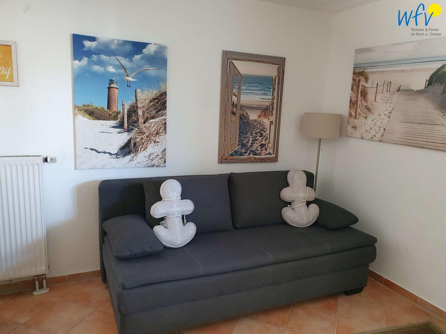 Urlaubszeit ist Erholungszeit! Zu entspannten Stunden lädt der Wohnraum u.a. mit einem bequemen Sofa, einem modernen TV, einem DVD-Player und einem CD-Player ein. Gerne können Sie auch in den vorhandenen DVD`s, Spielen und Büchern stöbern.