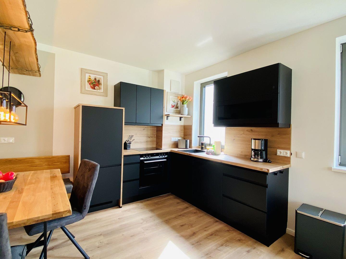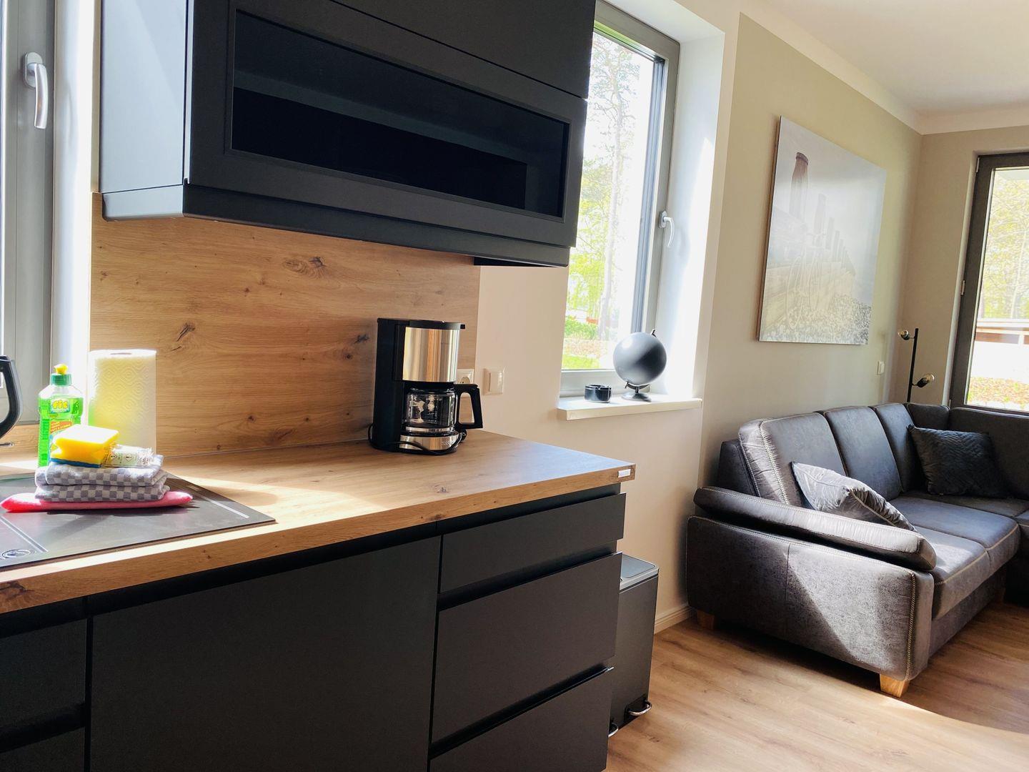 Genießen Sie entspannte Stunden im gemütlichen Wohnbereich mit Eck-Couch, Smart-TV und Terrassenzugang. Dieser lädt mit seinen chilligen Gartenmöbeln zum Verweilen in der Nachmittags-/Abendsonne ein. An den Wohnbereich schließt sich die offene und komplett ausgestattete Küchenzeile mit Essbereich an. Die Küche ist mit Filterkaffeemaschine, Wasserkocher, Toaster, Geschirrspüler, Backofen, Kühlschrank, Gefrierfach und Kochfeld ausgestattet und bietet die perfekte Grundlage für einen geselligen Kochabend oder ein ausgedehntes Urlaubsfrühstück.