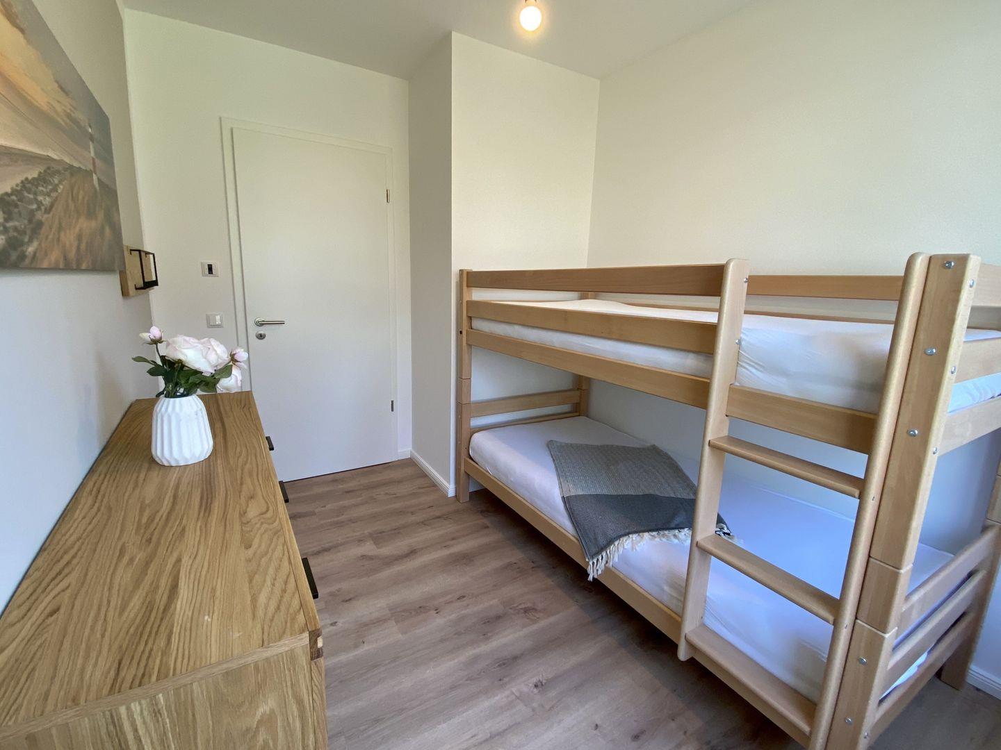 Ein PKW-Stellplatz in der hauseigenen Tiefgarage und kostenfreies WLAN stehen Ihnen während des Urlaubs zur Verfügung. Die Wohnung hat ein zweites Schlafzimmer, welches mit Doppelstockbett für zwei weitere Personen ausgestattet ist.