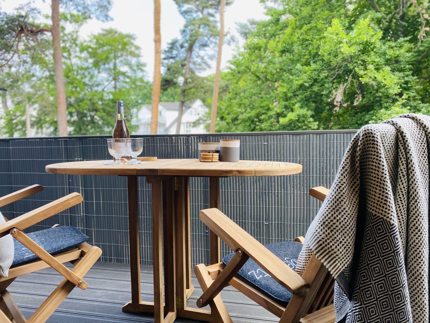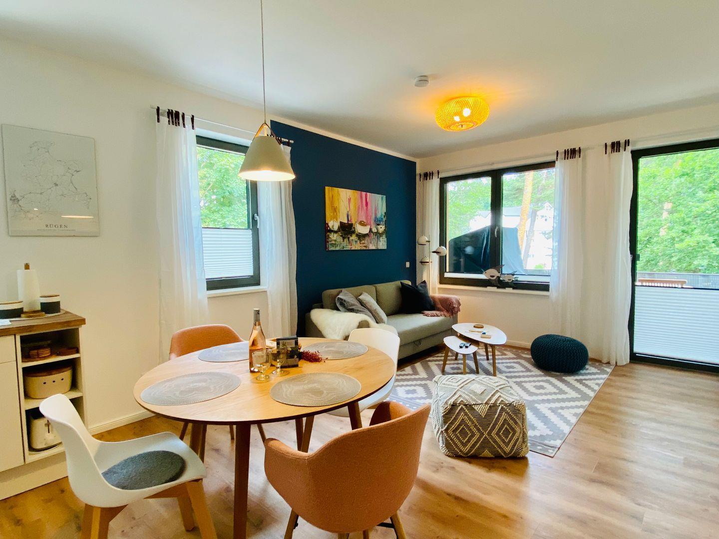Moderne Möblierung im skandinavischen Stil erwartet Sie in der Ferienwohnung Strandkorb & Mee(h)r im 1. Obergeschoss der Villa Candela in Baabe. Die 53 m² große Ferienwohnung ist für 2 - 4 Personen geeignet. In allen Räumen lassen sich hübsche Details entdecken, die den Urlaub hier zu einem traumhaften Erlebnis werden lassen. Genießen Sie ruhige Stunden im gemütlichen Strandkorb auf dem Balkon oder im Wohnbereich mit großer Couch, Smart-TV, Esstisch und bequemen Stühlen.