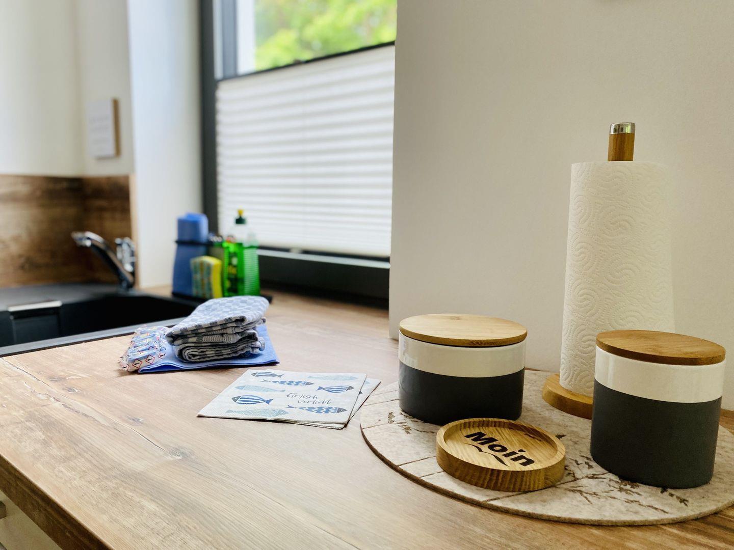 Von hier kann man den nach Norden ausgerichteten großzügigen Balkon betreten, der bei optimaler Sonnenausrichtung für den Morgenkaffee sowie gemütliche Abendstunden geeignet ist. An den Wohnbereich schließt sich die offene und komplett ausgestattete Küchenzeile an. Die Küche ist mit Kaffeepadmaschine, Wasserkocher, Toaster, Geschirrspüler, Backofen, Kühlschrank, Gefrierfach und Kochfeld ausgestattet und bietet die perfekte Grundlage für einen entspannten Kochabend oder ein ausgedehntes Urlaubsfrühstück.