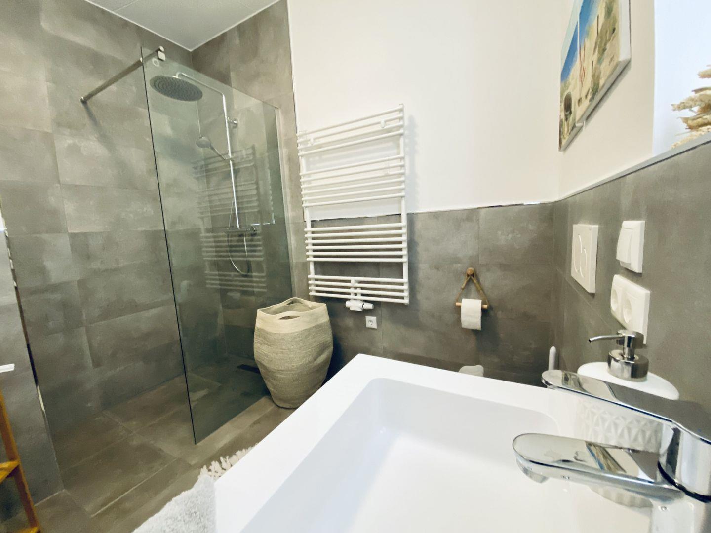 Das Schlafzimmer mit hochwertigem Boxspringbett und ein Badezimmer mit ebenerdiger Regendusche ergänzen die hochwertige Ausstattung der Ferienwohnung Strandkorb & Mee(h)r.