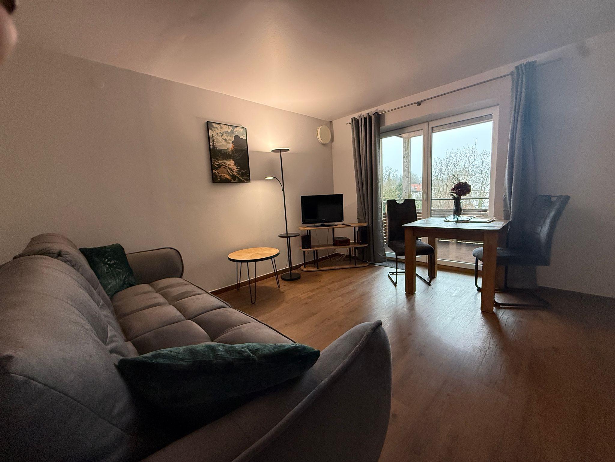 Diese komplett möblierte 1,5-Zimmer-Ferienwohnung im 1. OG bietet Platz für bis zu drei Personen und eignet sich für Singles oder Gäste, die getrennt schlafen möchten.