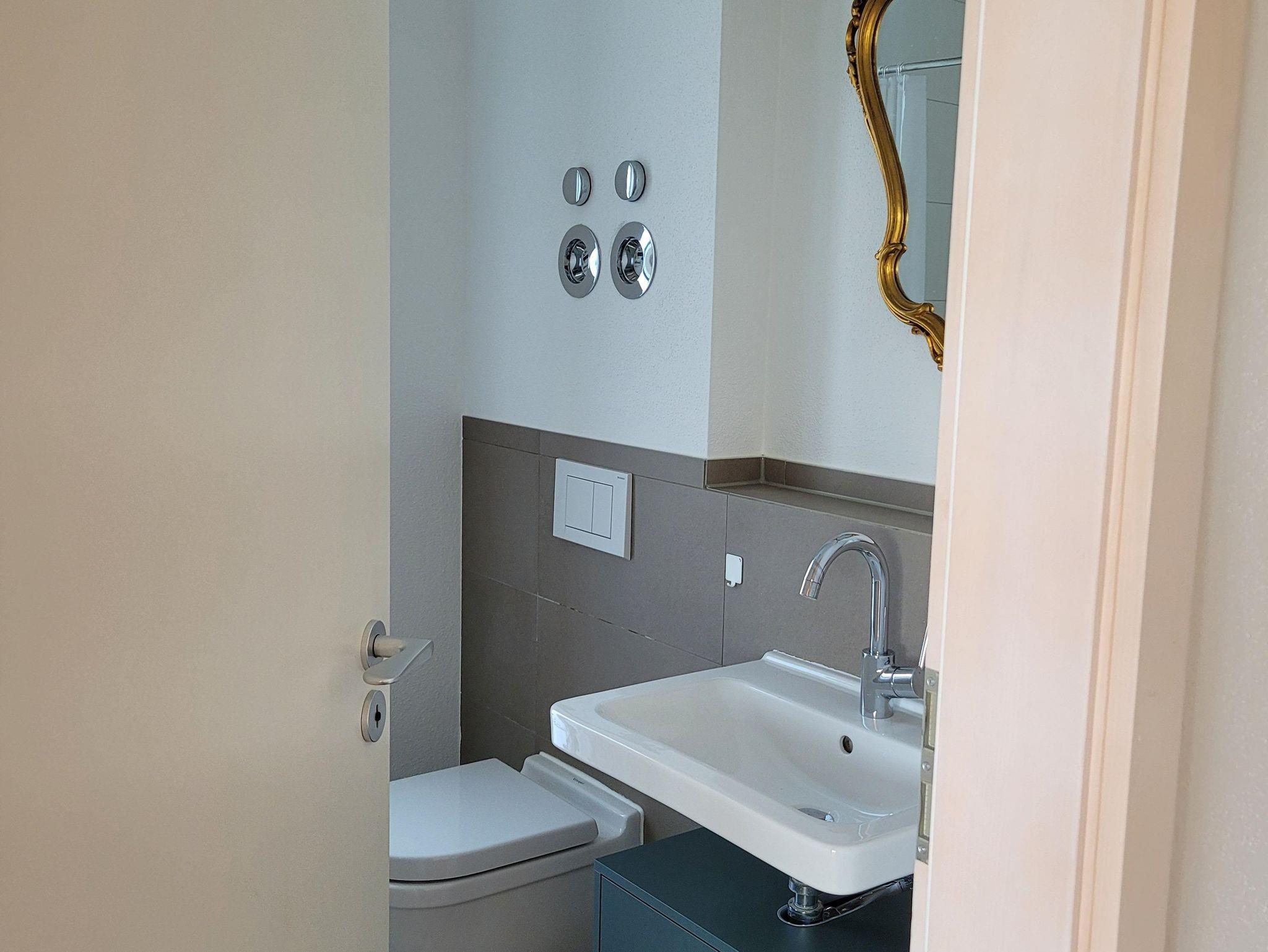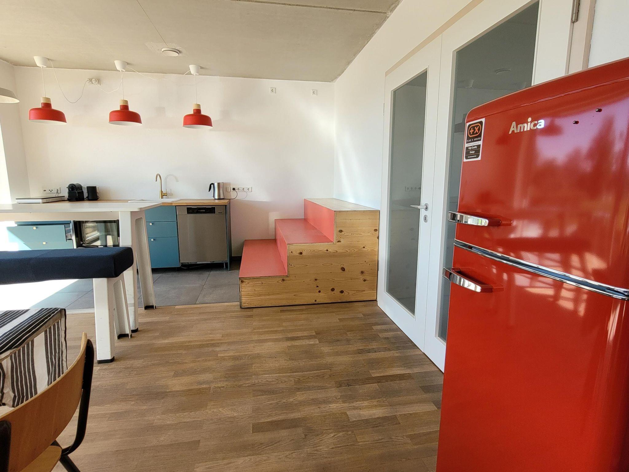 Wer mit dem Auto anreist, kann sein Fahrzeug für die gesamte Zeit des Aufenthalts direkt vor dem Garten in einer Parkbucht am Gartenzaun parken. Für Fahrräder, Skier oder andere Sportgeräte ist im Carport eine offen zugängliche Unterstellmöglichkeit gegeben (nicht absperrbar). Man betritt die Ferienwohnung im Erdgeschoss über einen gemeinsam genutzten Hauseingang und gelangt zur rechten in den Flur mit Garderobe und Sitzbank. Von dort geht zum einen das Badezimmer mit Dusche, Waschbecken und Toilette ab. Zum anderen öffnet sich hinter einer zweiflügeligen Glastür das Herzstück der Wohnung: eine große Wohnküche, die der Länge nach verglast ist und einen freien Blick auf den Garten und die dahinter liegende Landschaft freigibt. Die voll ausgestattete Wohnküche hat auf der rechten Seite eine Küchenzeile und einen Stehtisch, an dem sich Kochen und Essen lässt. Daneben befinden sich Sitzstufen aus Holz an der Wand, wo man gemütlich einen Kaffee trinken oder lesen kann. Im Zentrum der Wohnküche steht ein (wirklich) sehr großer Holztisch, der schon einige Gebrauchsspuren aufweist und an dem viele Personen Platz haben. Seine Besonderheit: in der Mitte sind hinter Klappen Steckdosen und LAN-Anschlüsse versteckt, falls man arbeiten oder einfach nur ins Internet gehen möchte. Wer es gemütlicher haben möchte, kann den Tisch mit verschiedenen Tischdecken dekorieren. Über einen Wandflur - mit Sprossenwand und Platz für Yogaübungen, einer Sitzecke mit Lesesessel und Buchregal - gelangt man links zum Schlafzimmer mit Kleiderschrank, Schminktischchen und französischem Bett. Zur rechten schließt sich das Wohnzimmer mit einem großen Loungesofa an, ebenfalls mit einer durchgängigen Glasfront und Zugang zu Terrasse und Garten. Hier befindet sich auch der Beamer und die Soundanlage, mit denen sich Filme auf die freie weiße Wand projizieren lassen. Das Loungesofa lässt sich für zwei weitere Personen zu einem Gästebett umfunktionieren, die Bettwäsche dazu befindet sich im selben Raum in zwei großen Aluminiumkisten, die auch als Ablage genutzt werden können. Auf Anfrage kann sowohl die Waschmaschine als auch ein Trockner im Obergeschoss mitbenutzt werden als auch die Feuerschale im Garten.