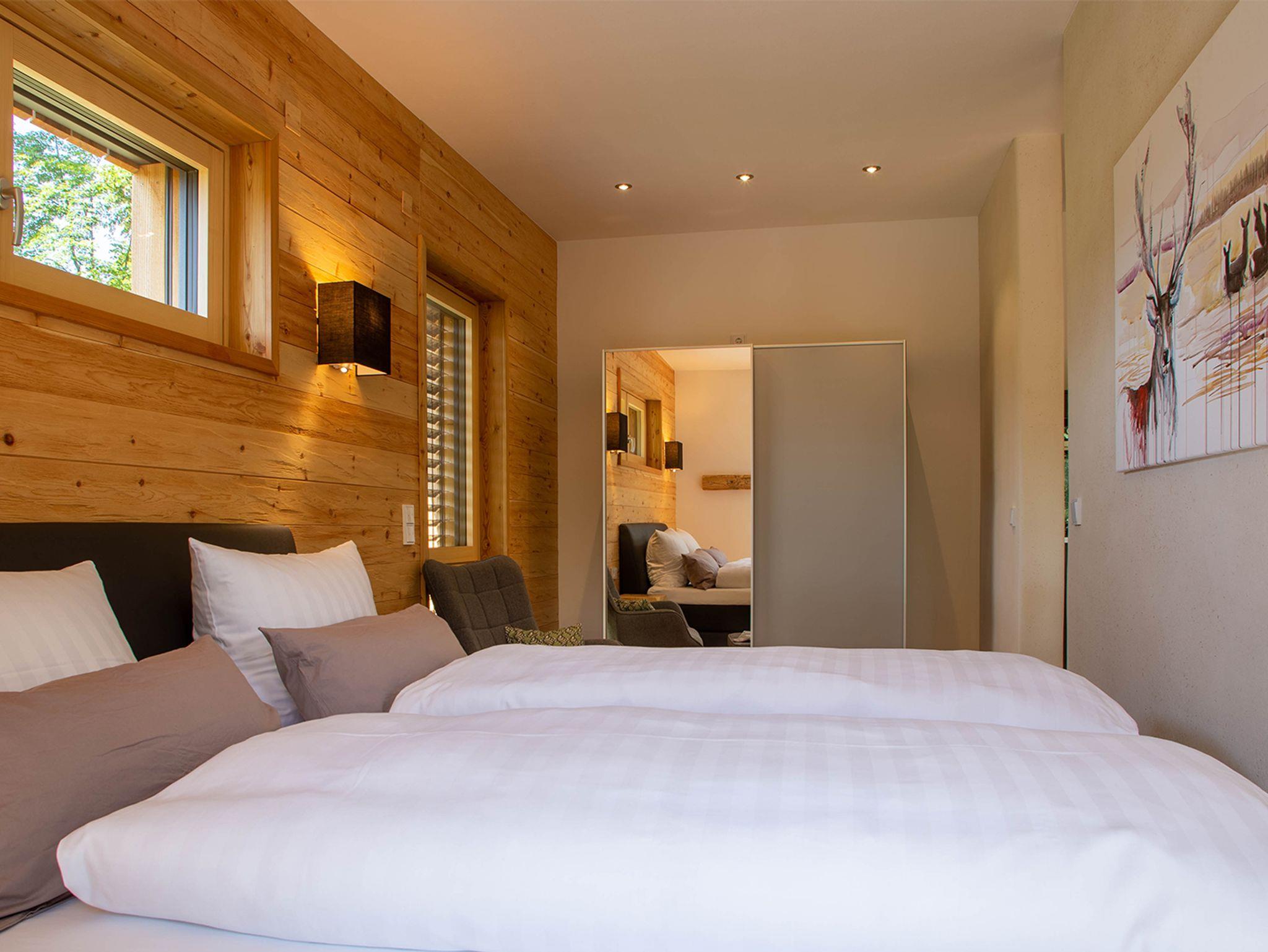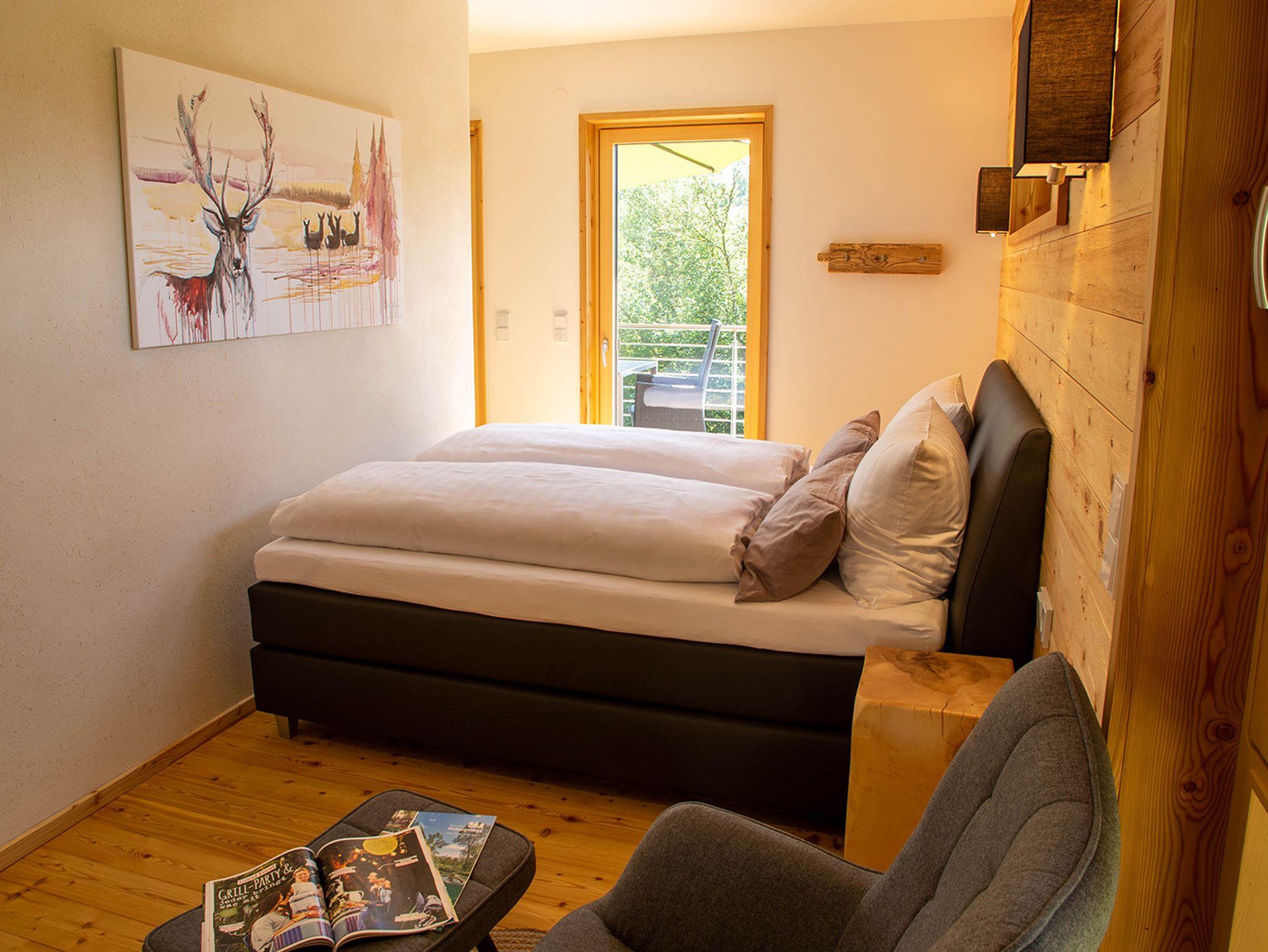 Alle Zimmer verfügen über ein Doppelbett, Bad mit Dusche und WC, Fernseher sowie einer Sitzgruppe.